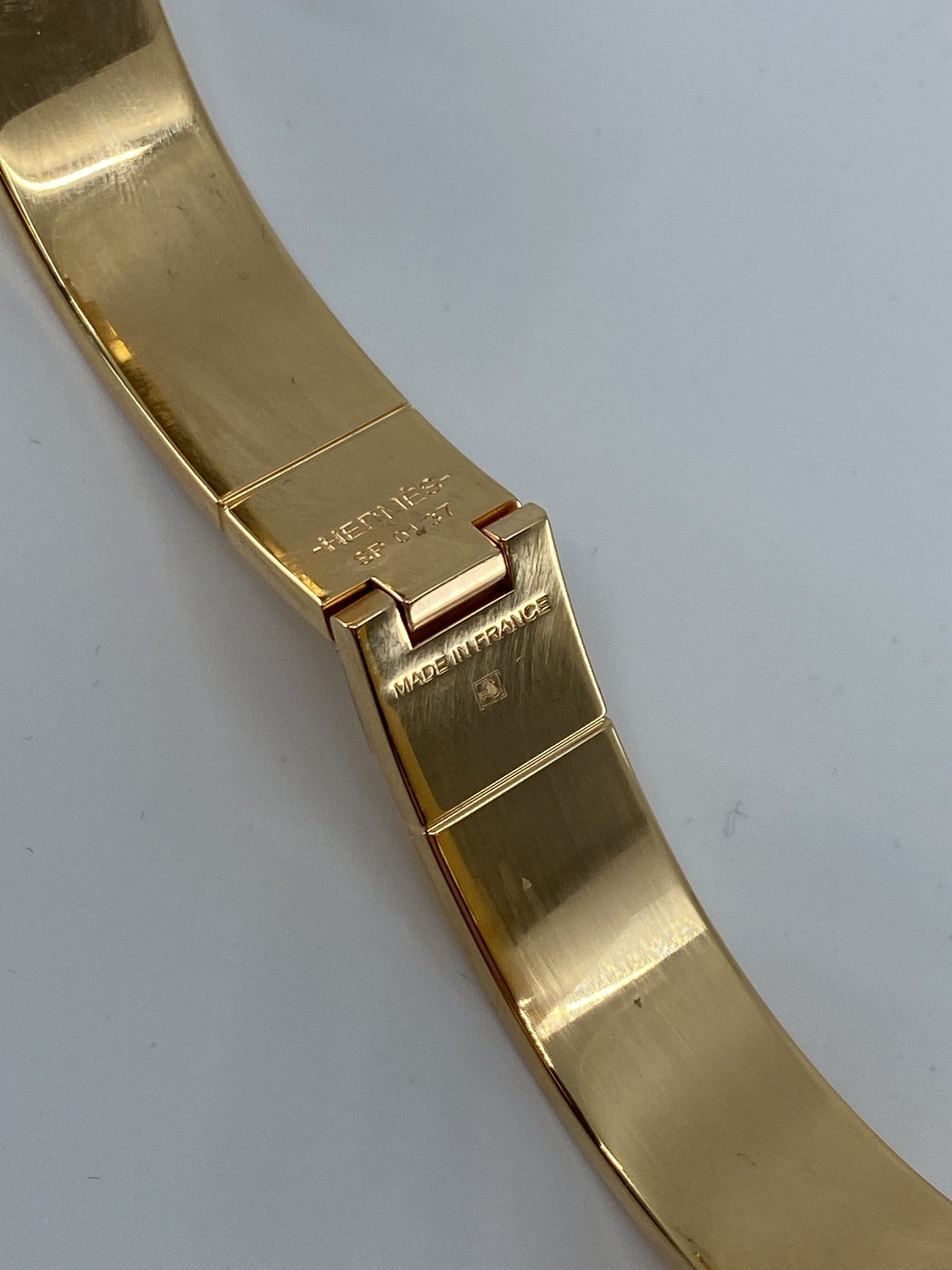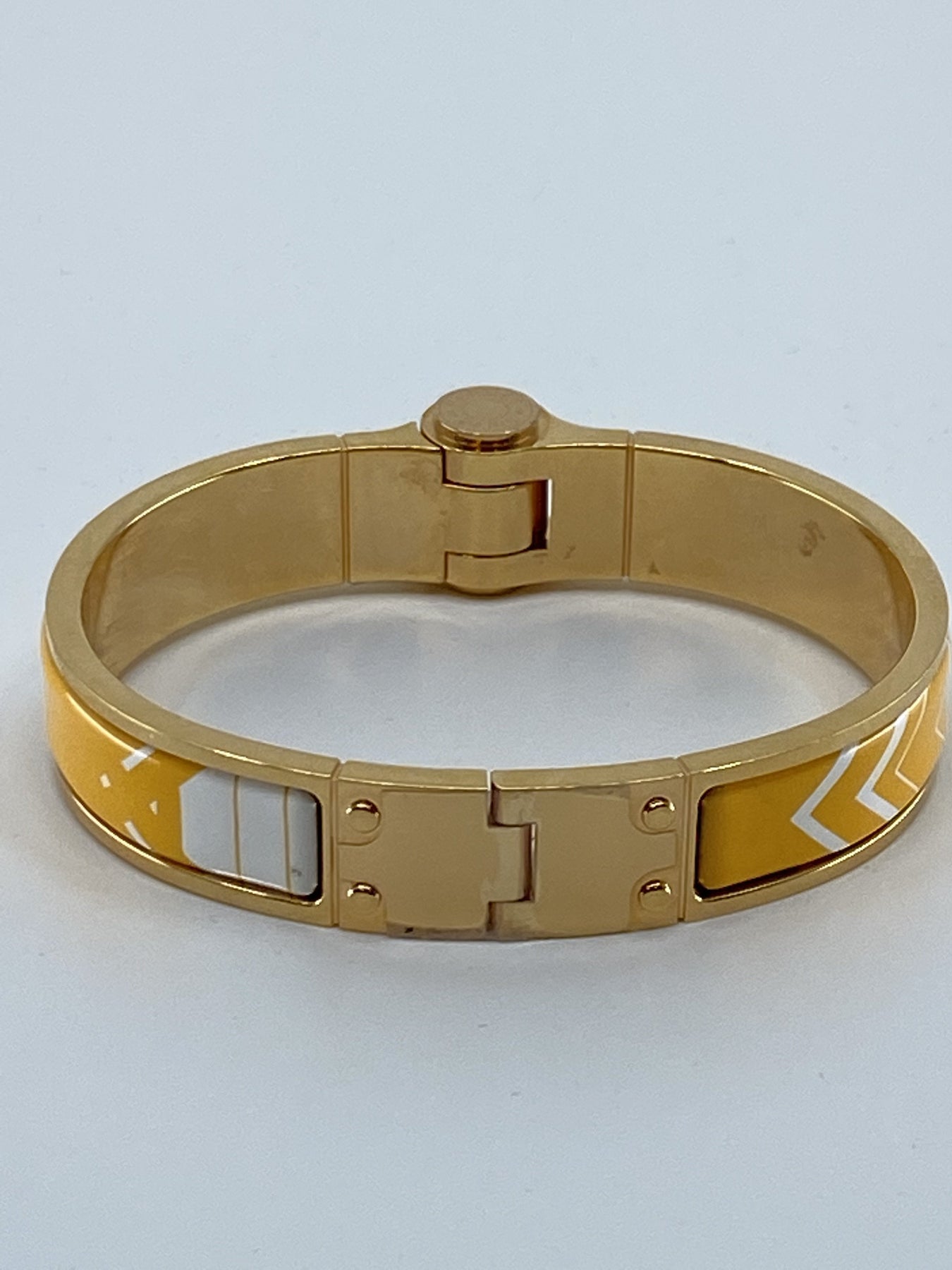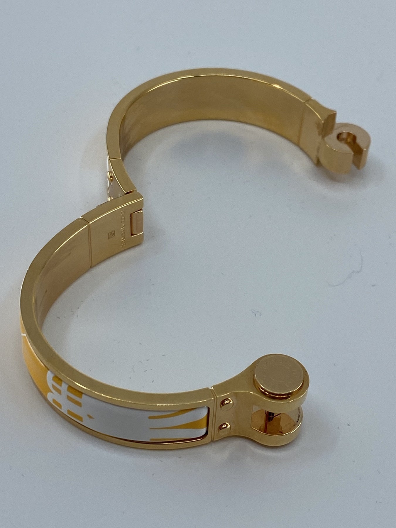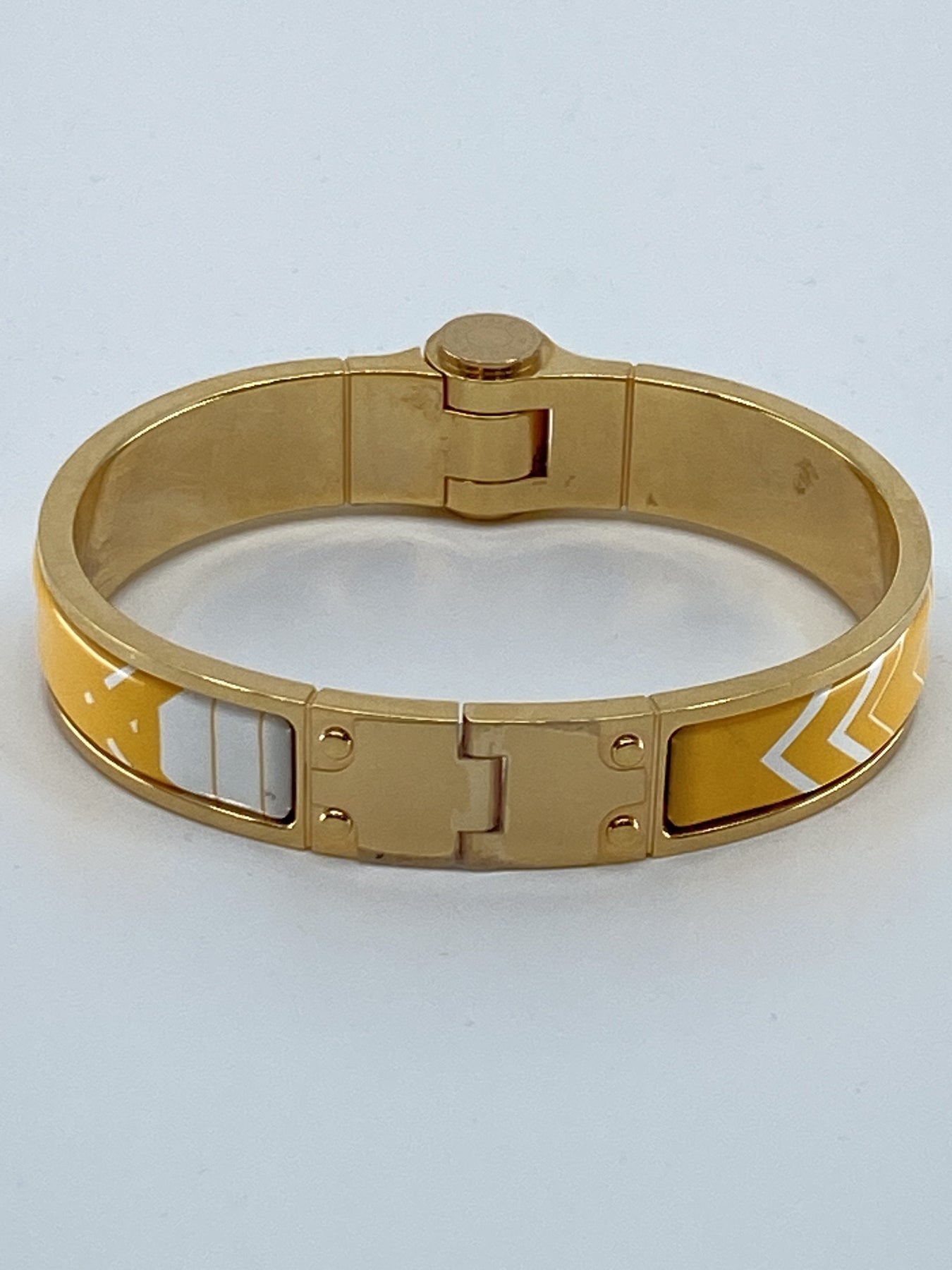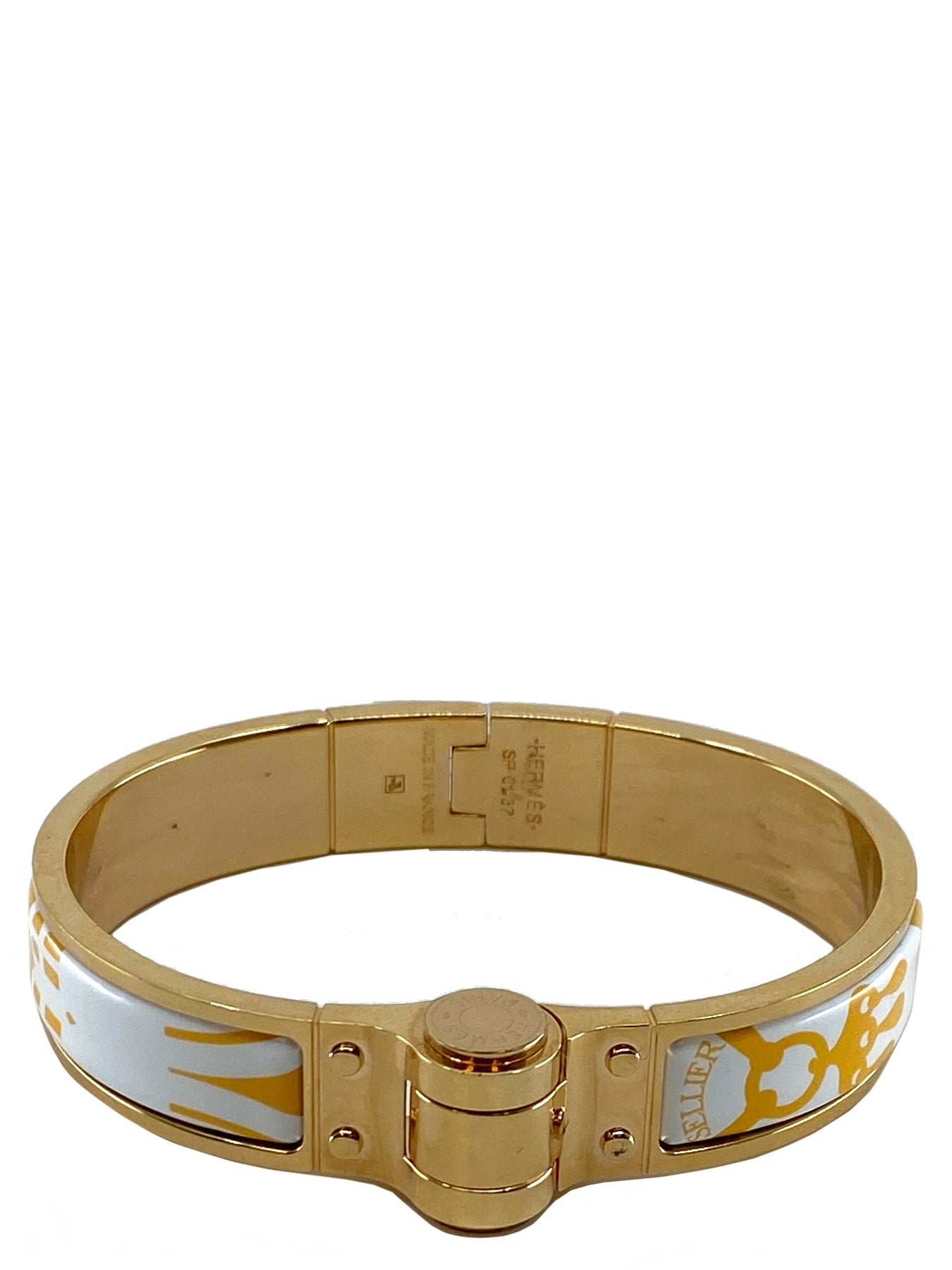 We the ity of this stunning Hermes White "Sellier" Butterscotch printed Hinged Bracelet crafted from beautiful enamel and rose gold metal hardware. Featuring a hinged closure bracelet with rose gold plated hardware. Circumference 7.5"/ .47" wide.