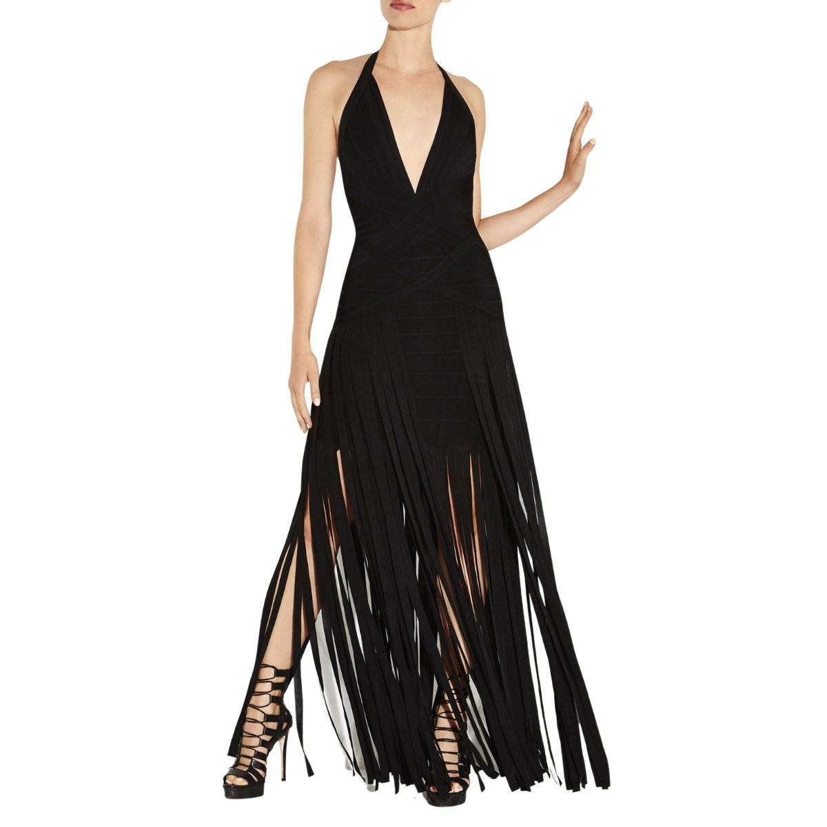 A slinky, slashed hem lends a sexy fringed element to this daring Herve Leger cocktail dress.