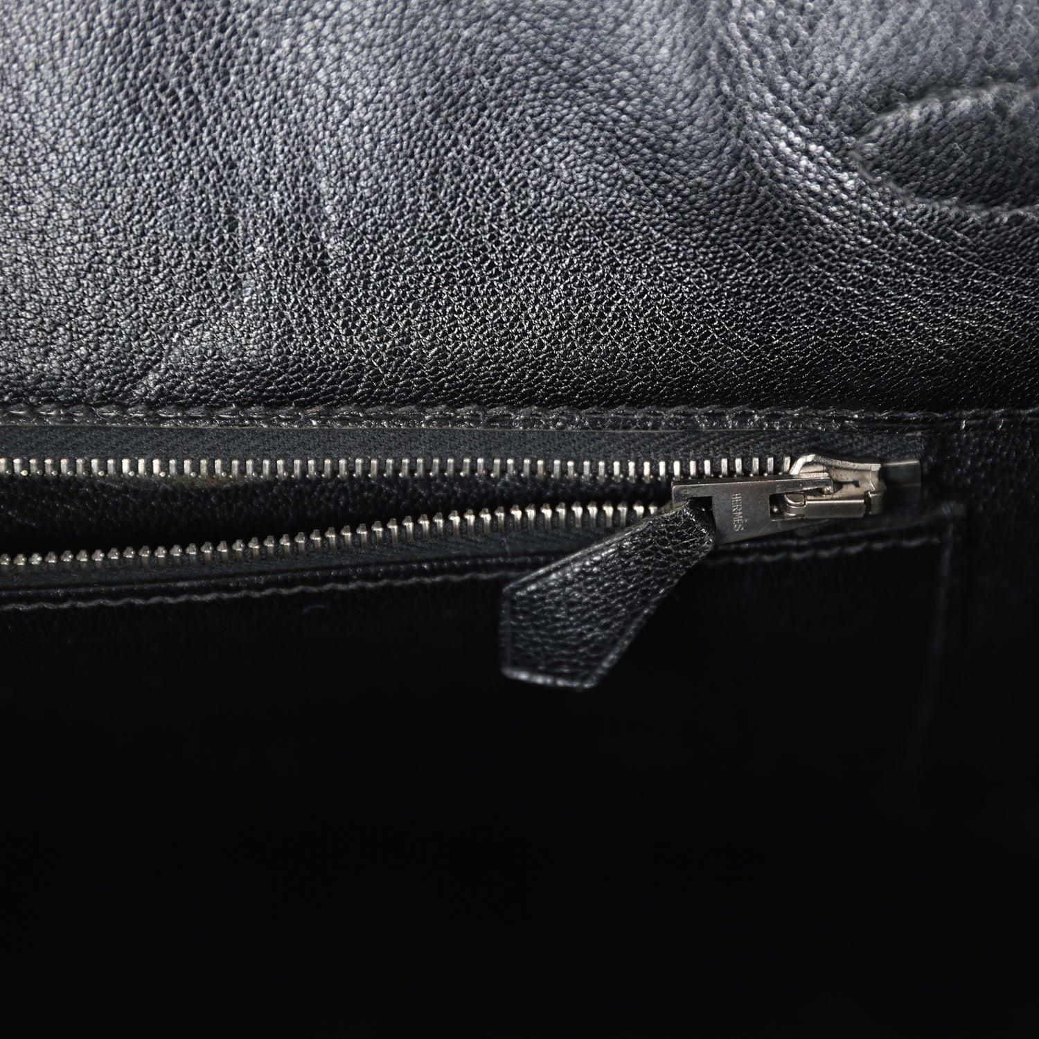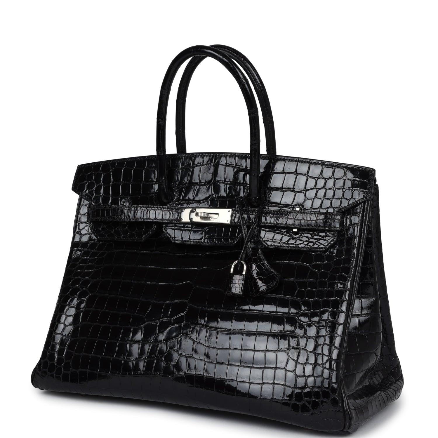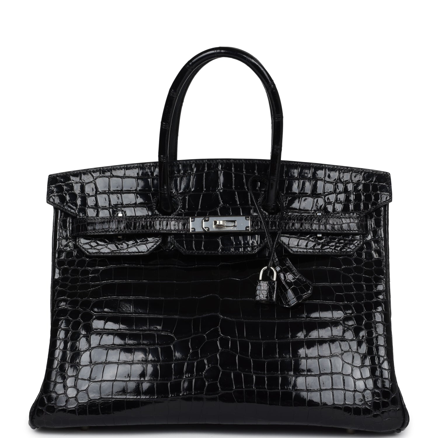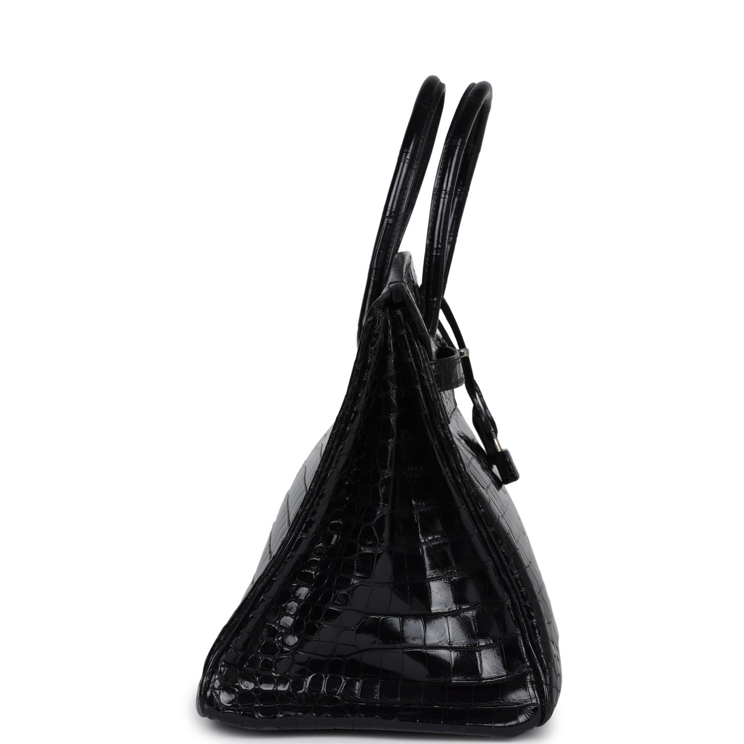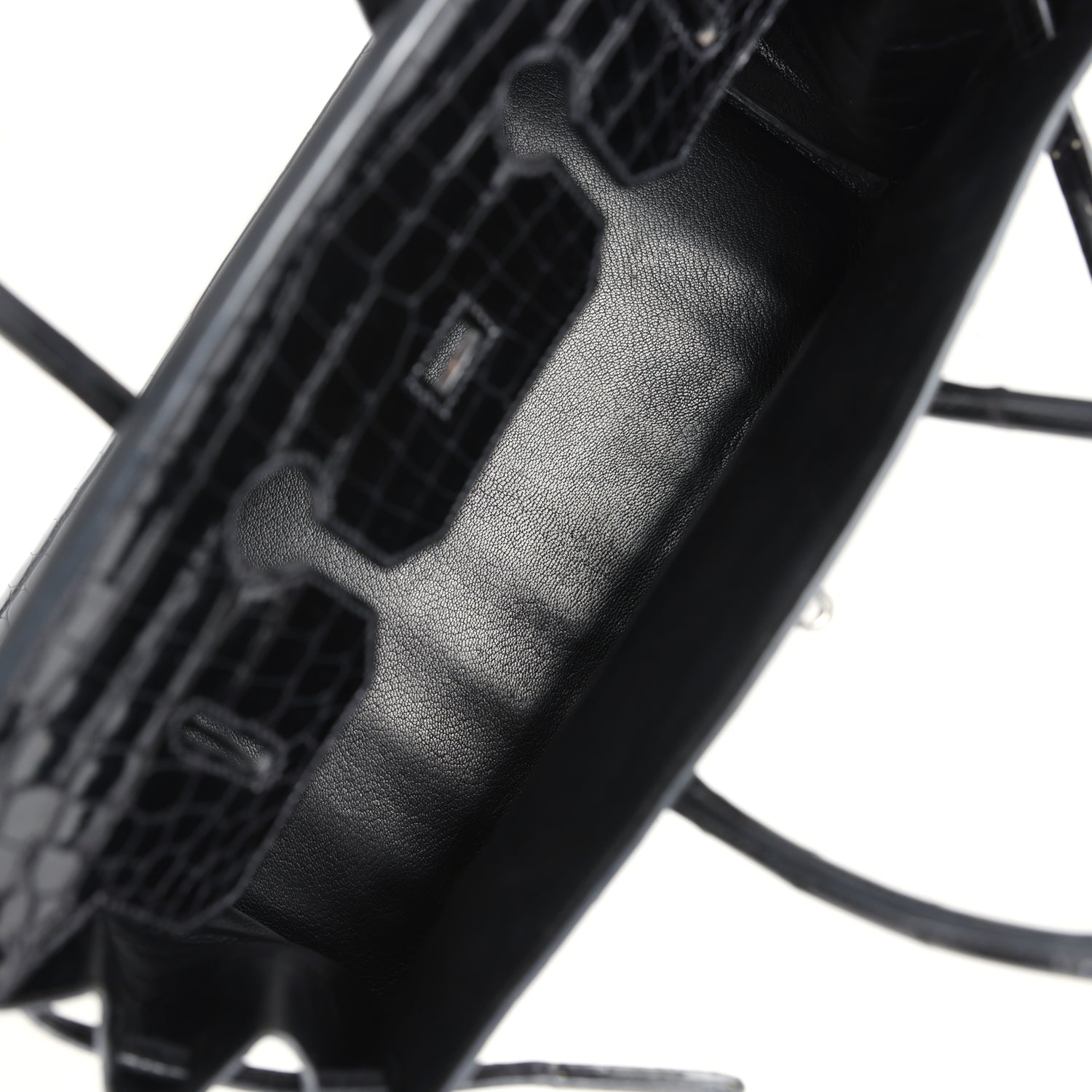 Birkin is of Black shiny Porosus crocodile with palladium hardware and features tonal stitching, front flap, two straps with center toggle closure, clochette with lock and two keys, and double rolled handles.