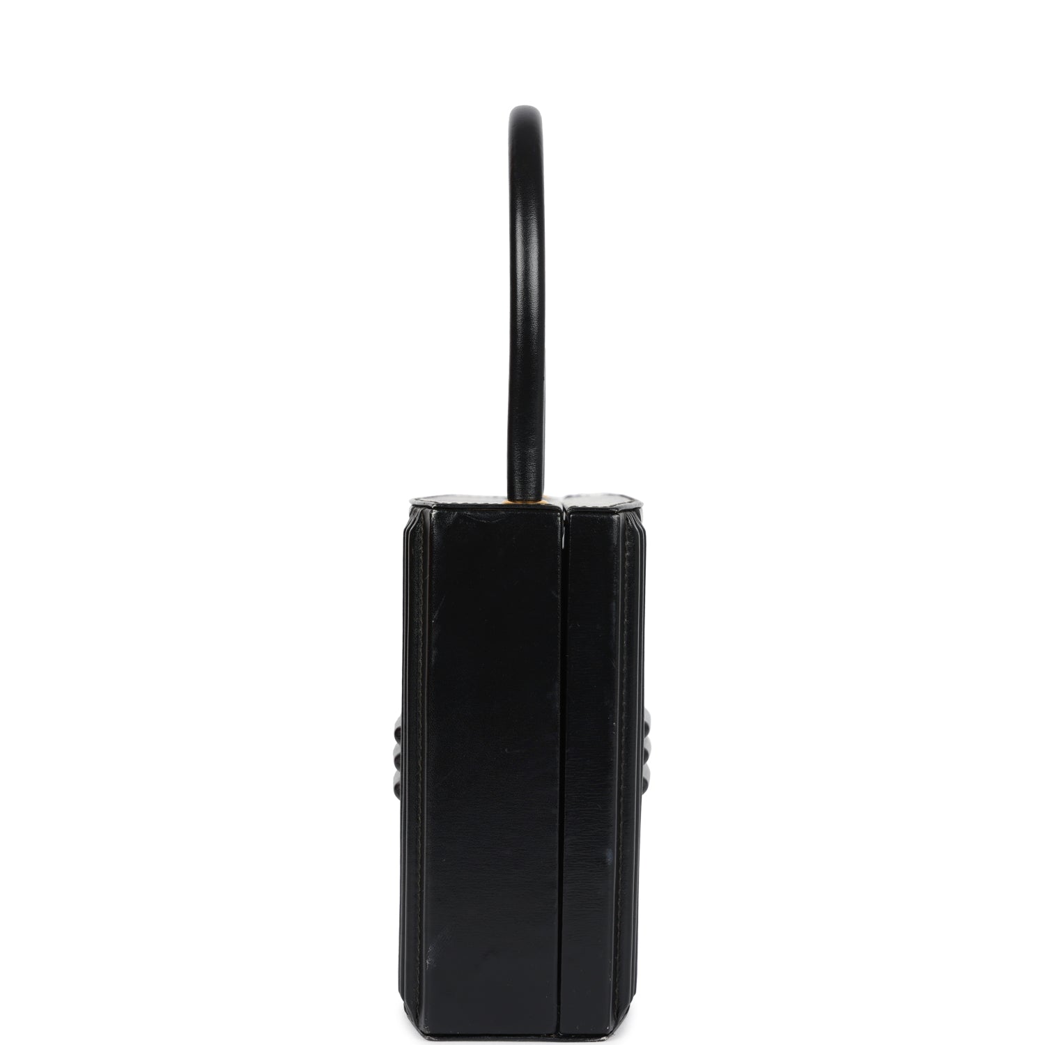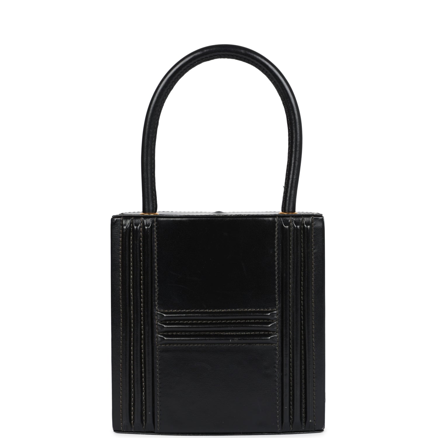 This New Hermes Mini Cadena Lock Bag is of Black box calf leather with gold hardware, featuring tonal stitching, with the signature Hermes padlock detailing, a hidden push & snap lock closure and a single rolled top handle.