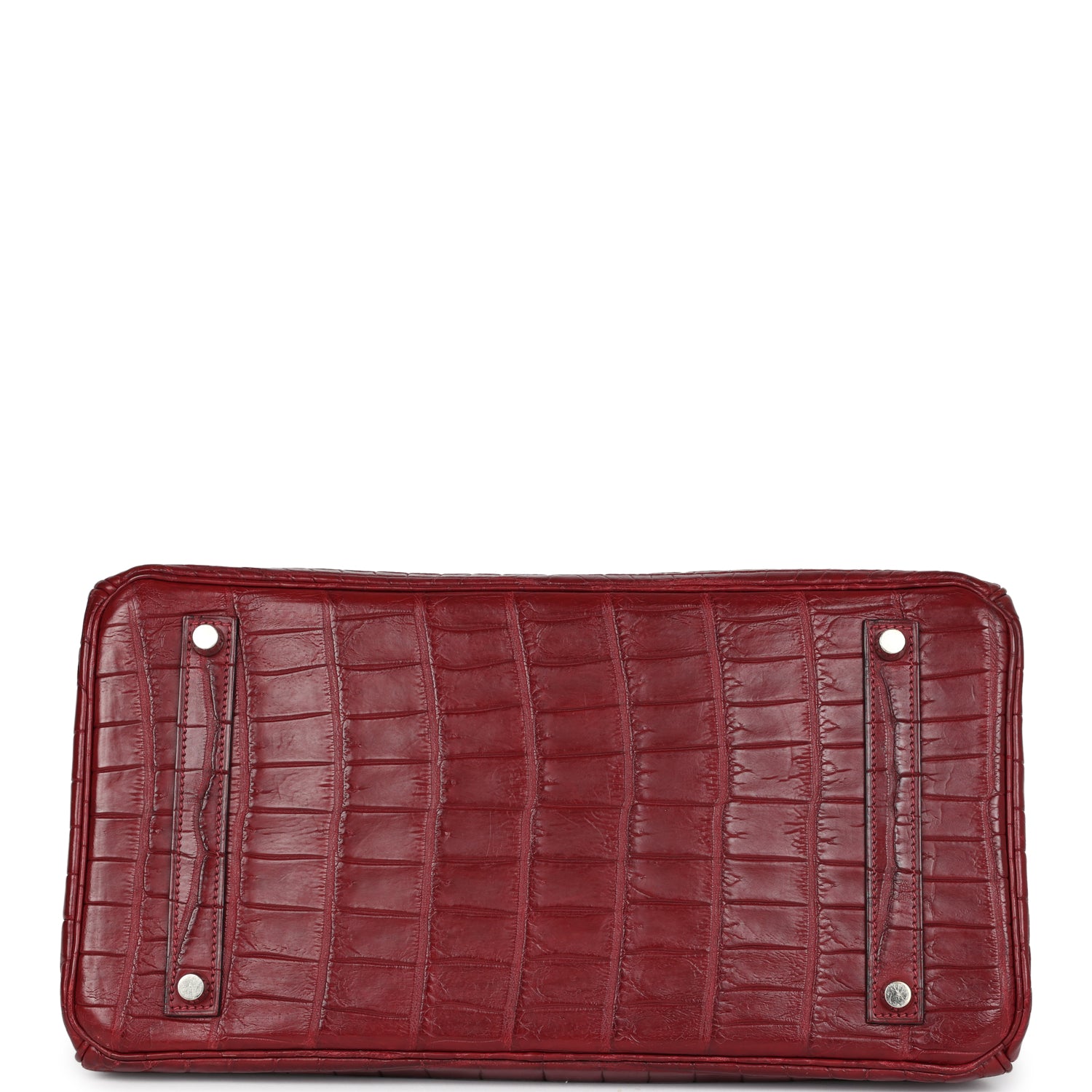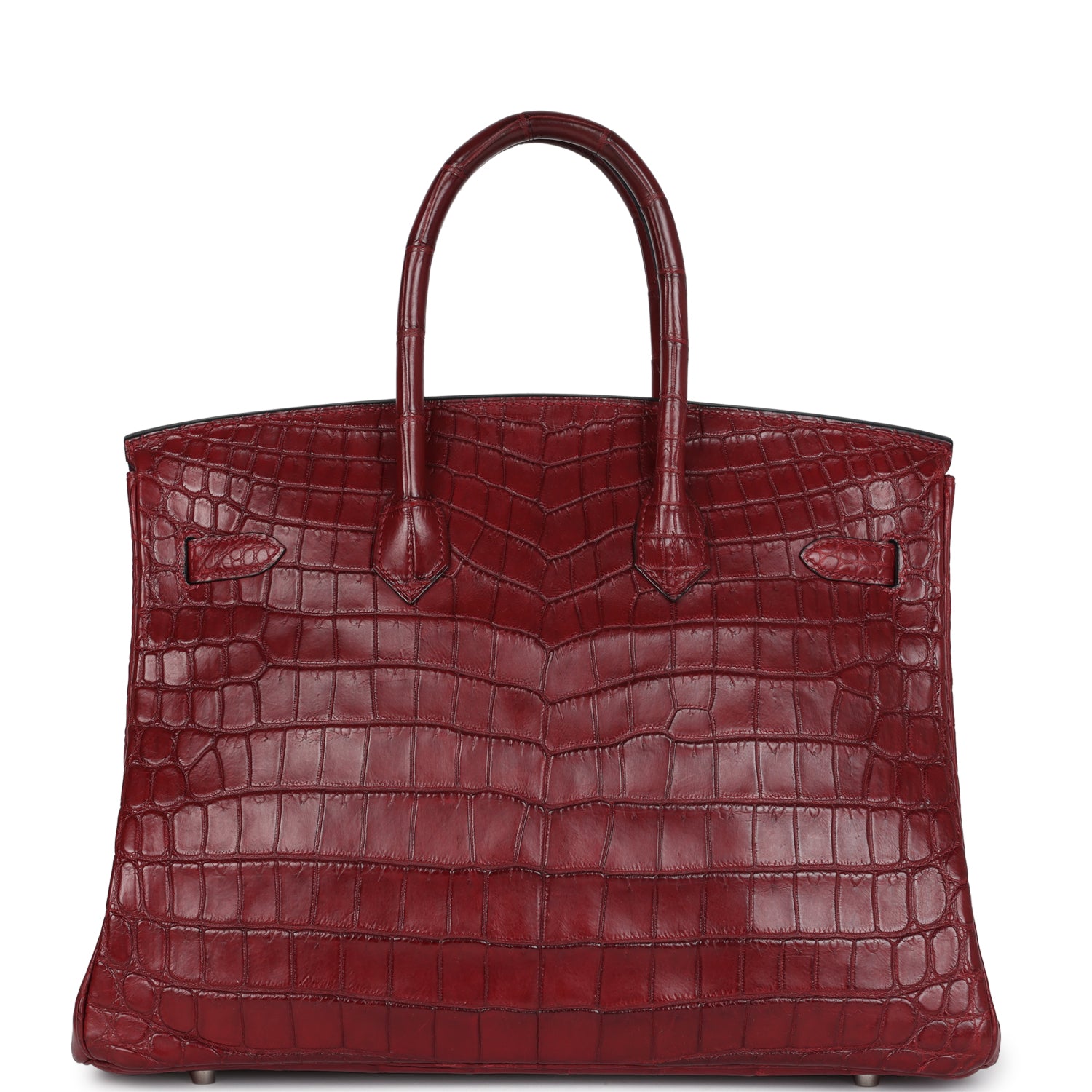 New Travel Birkin is in Rouge H Niloticus Crocodile leather with brushed palladium hardware and has tonal stitching, front flap, two straps with center toggle closure, clochette with lock and two keys, and double rolled handles.