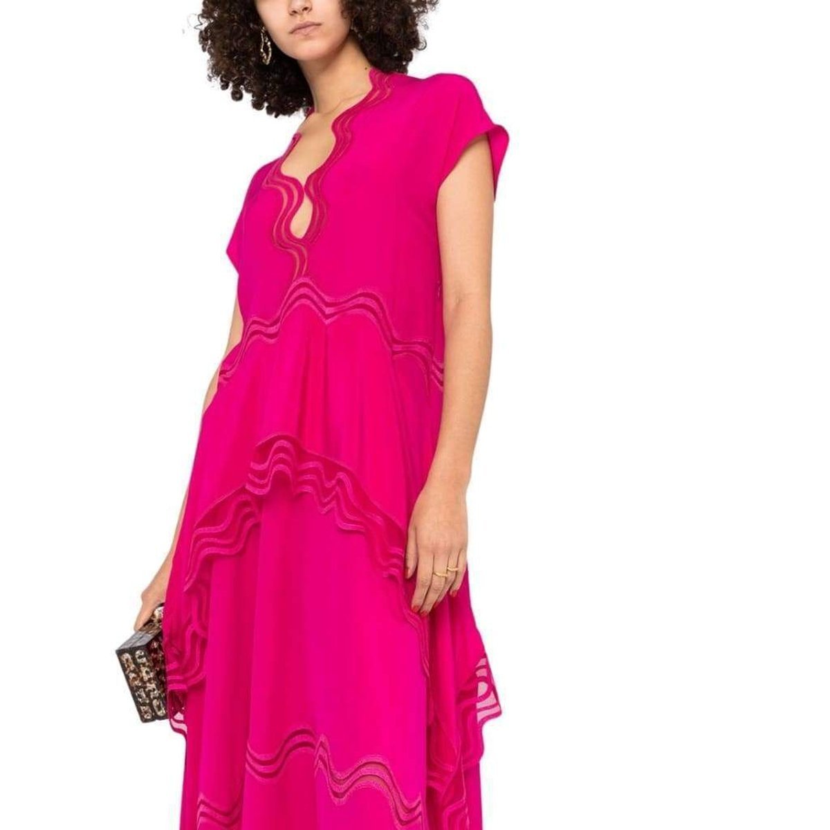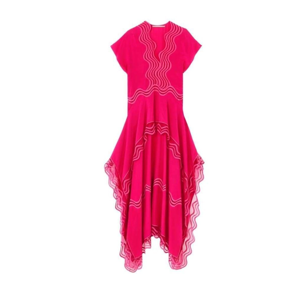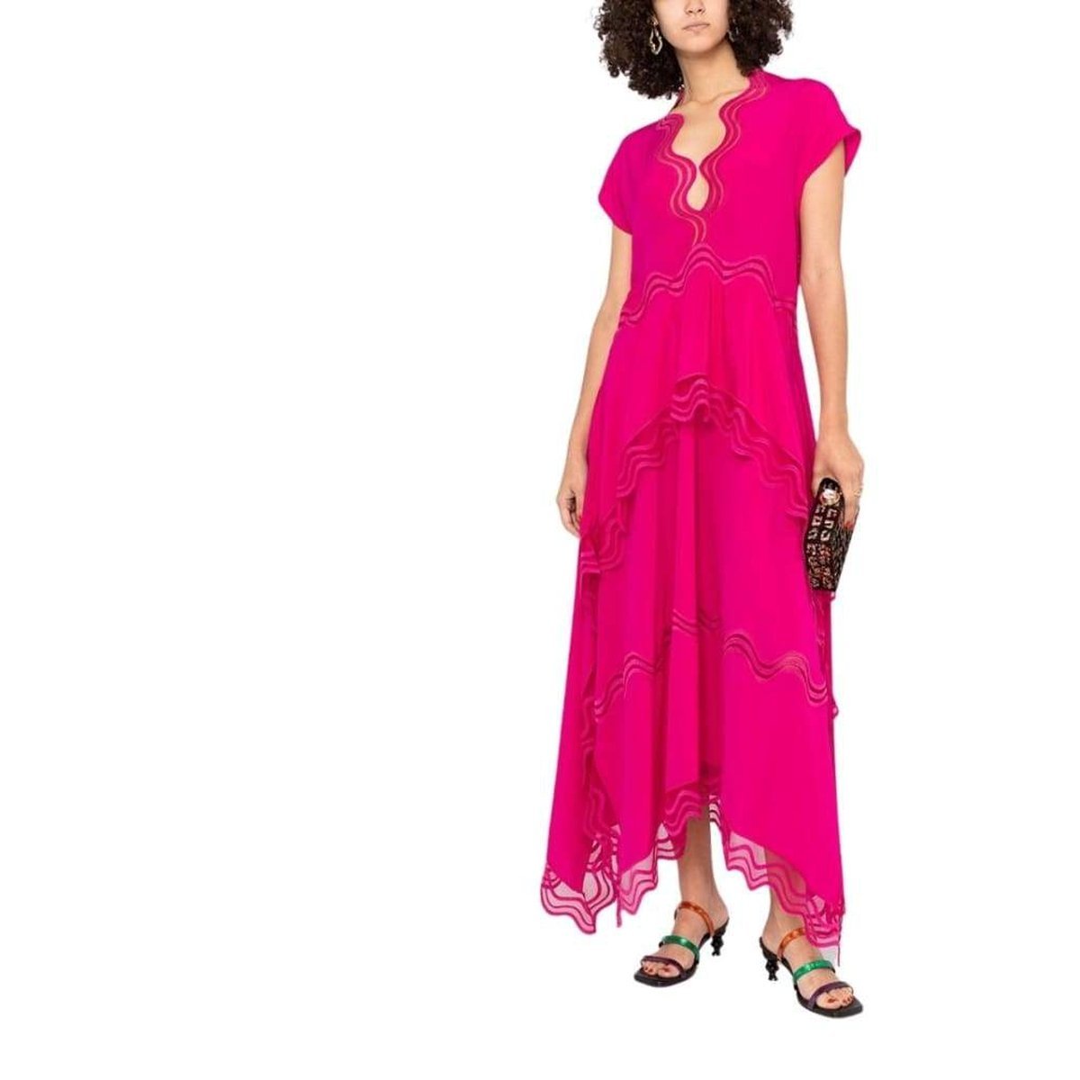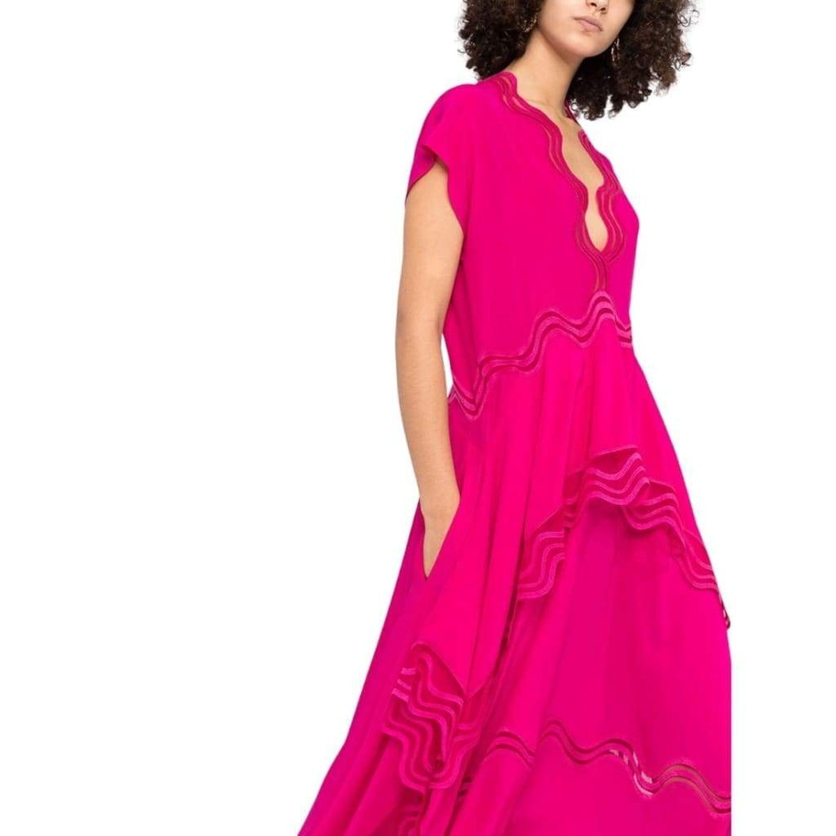 Crafted in silk, the V-neck dress is finished with short-sleeves and a loose, relaxed-fit silhouette.