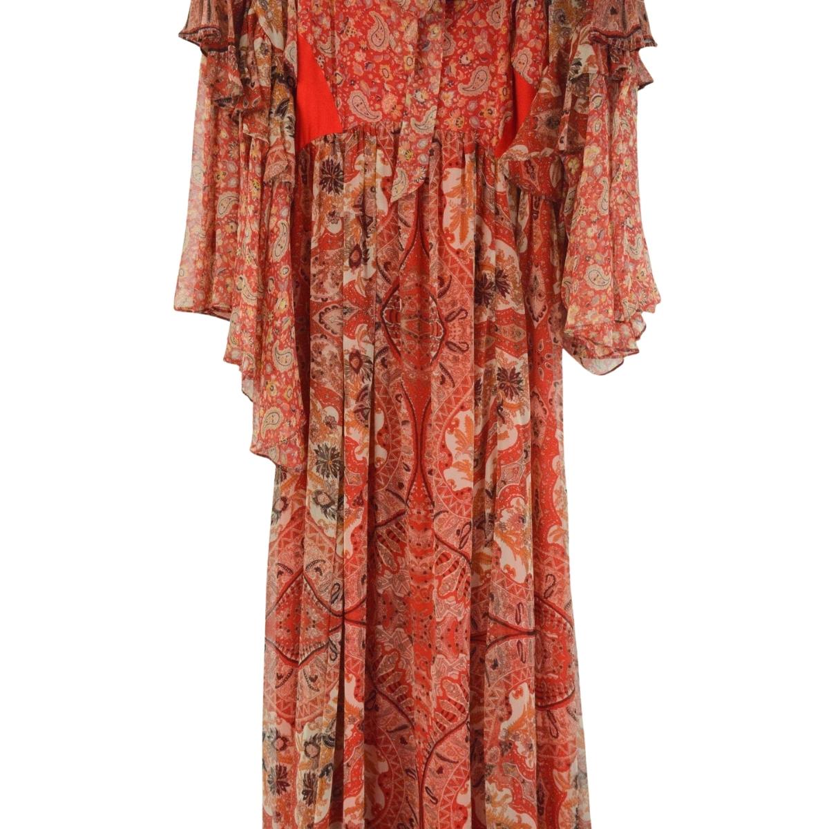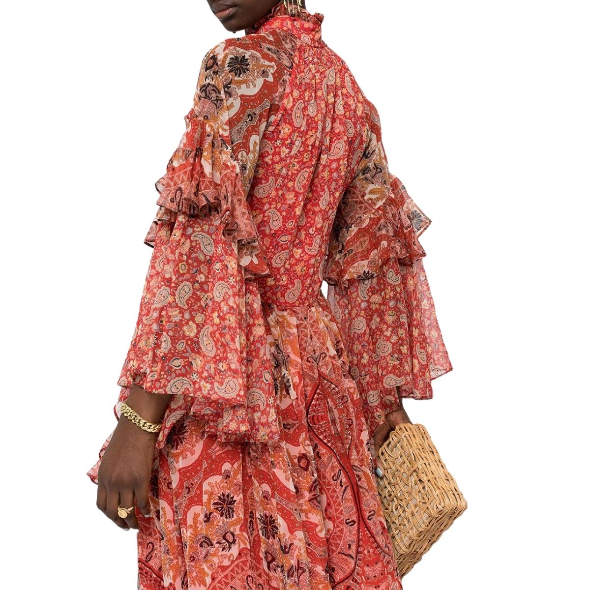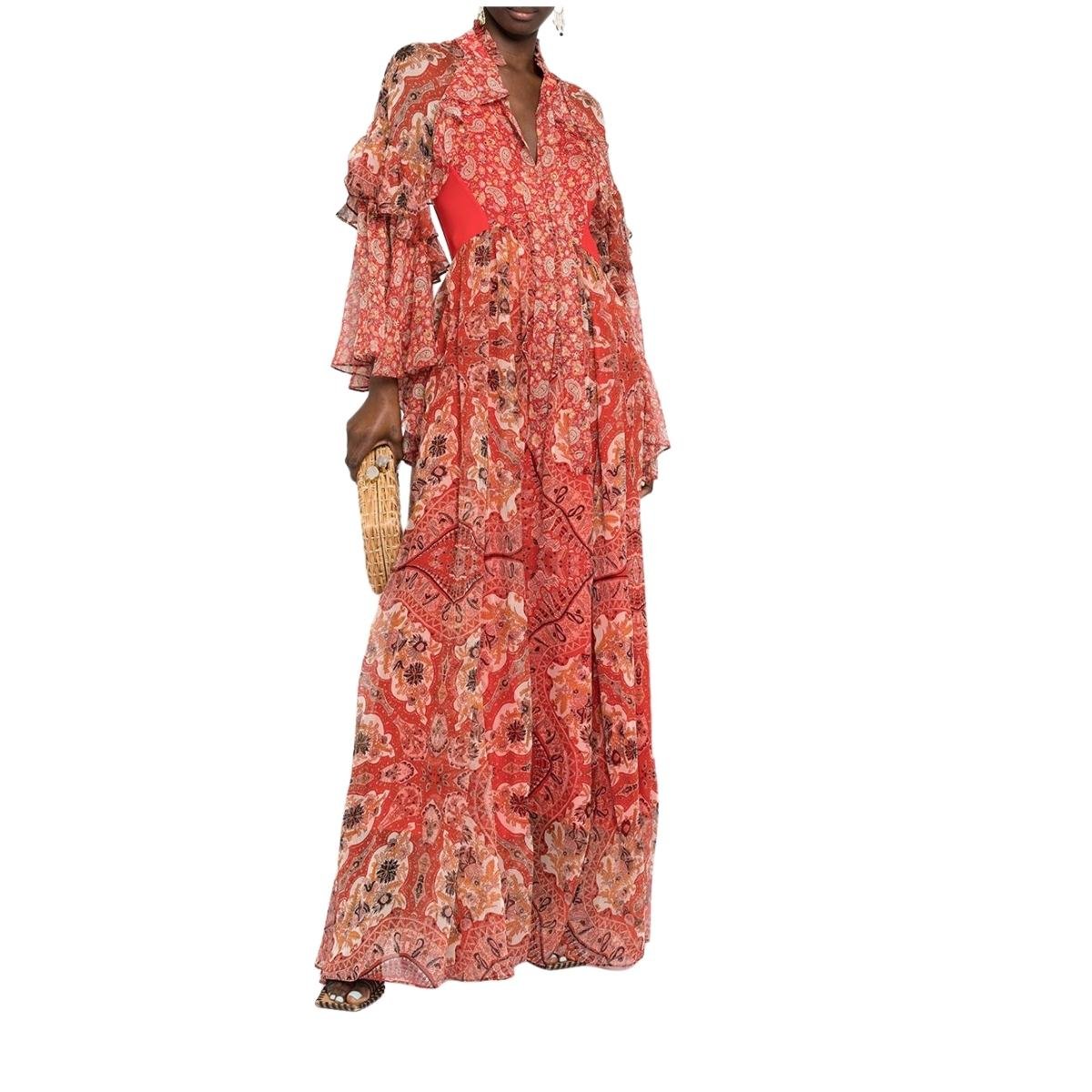 Solid red chiffon panels at waist