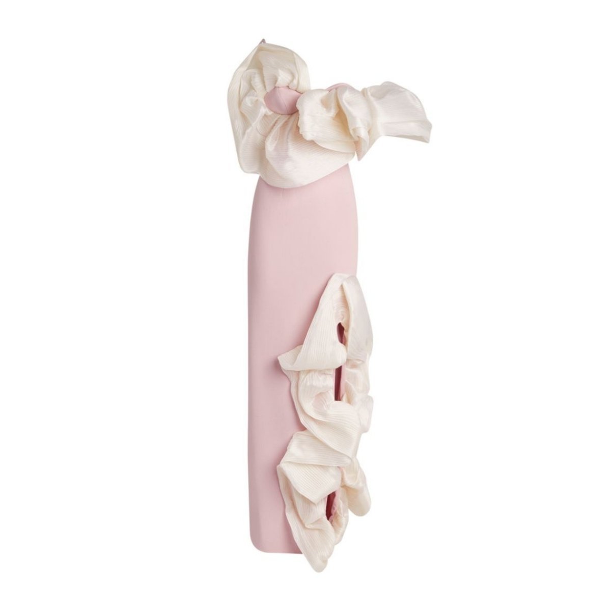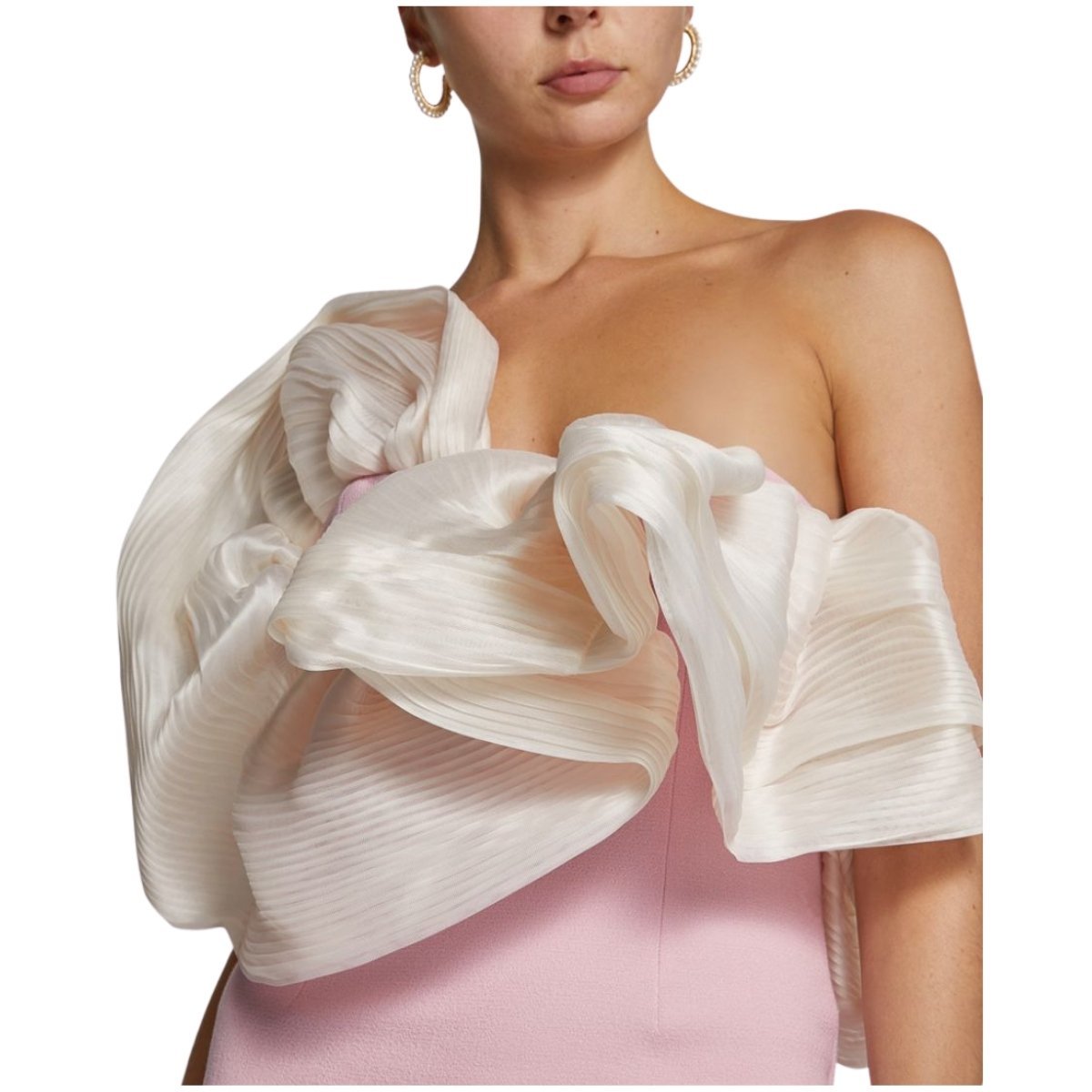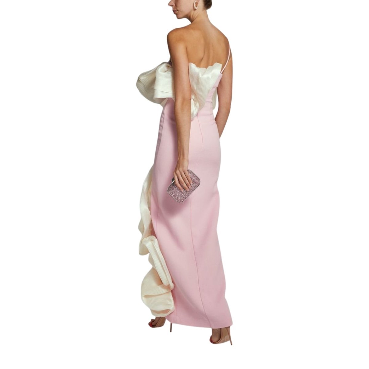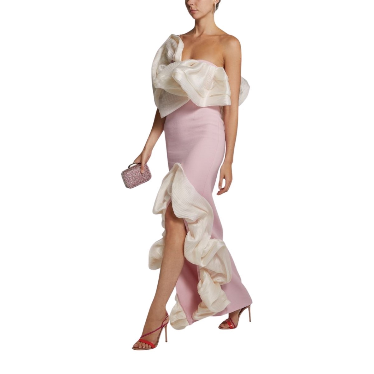 Suspended from a single thin shoulder strap where the voluminous trim surrounds the bust creating a floral accent, this fitted column gown is a true showstopper.