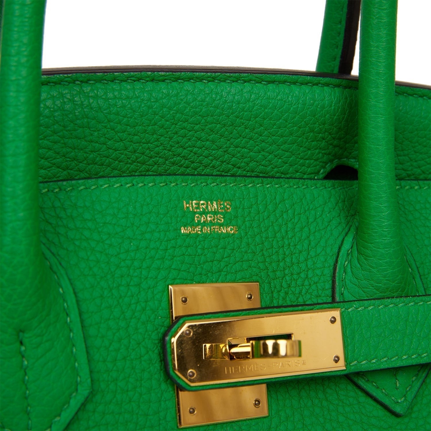 This Birkin is in Bambou togo leather with gold hardware and has tonal stitching, a front toggle closure, a clochette with lock and two keys, and double rolled handles.