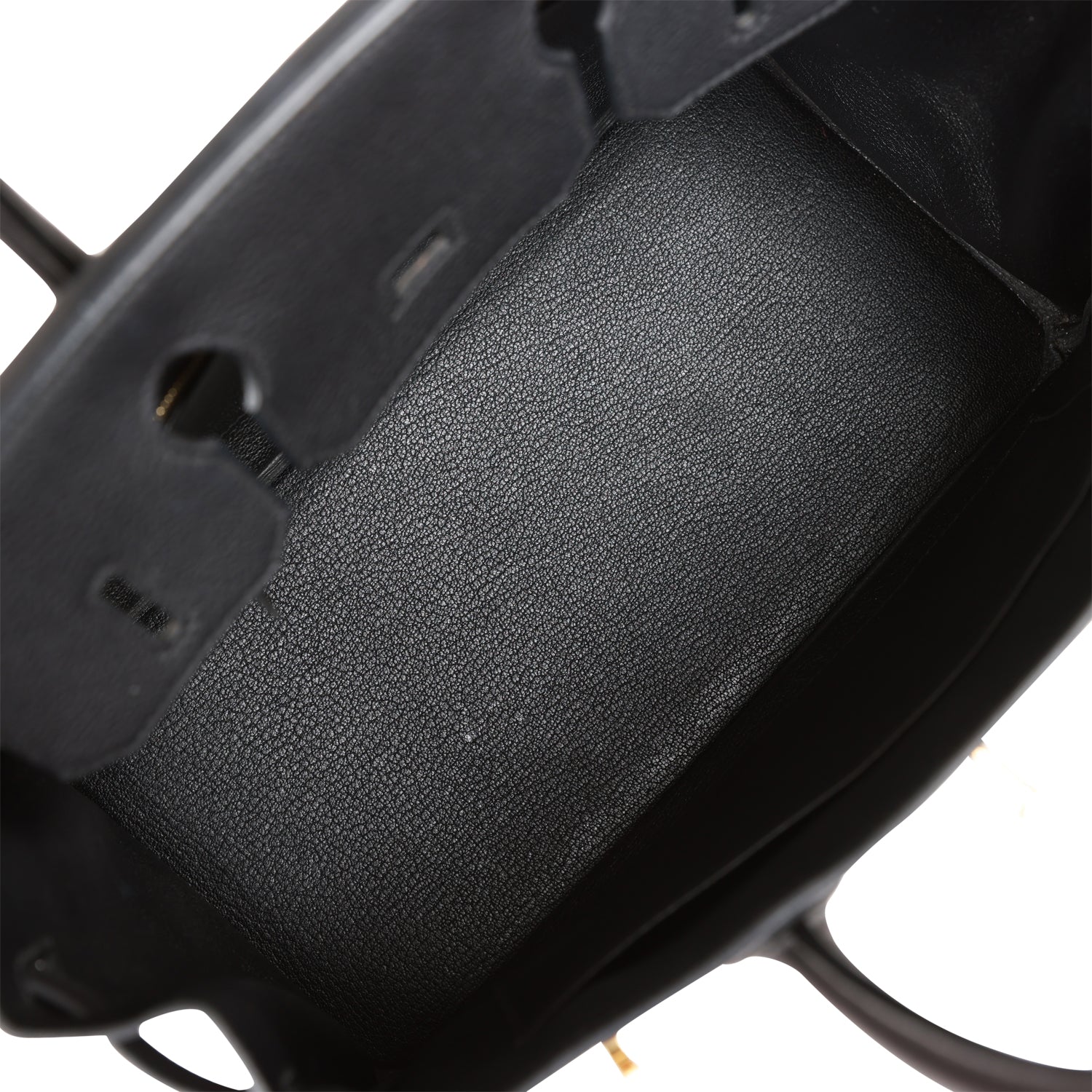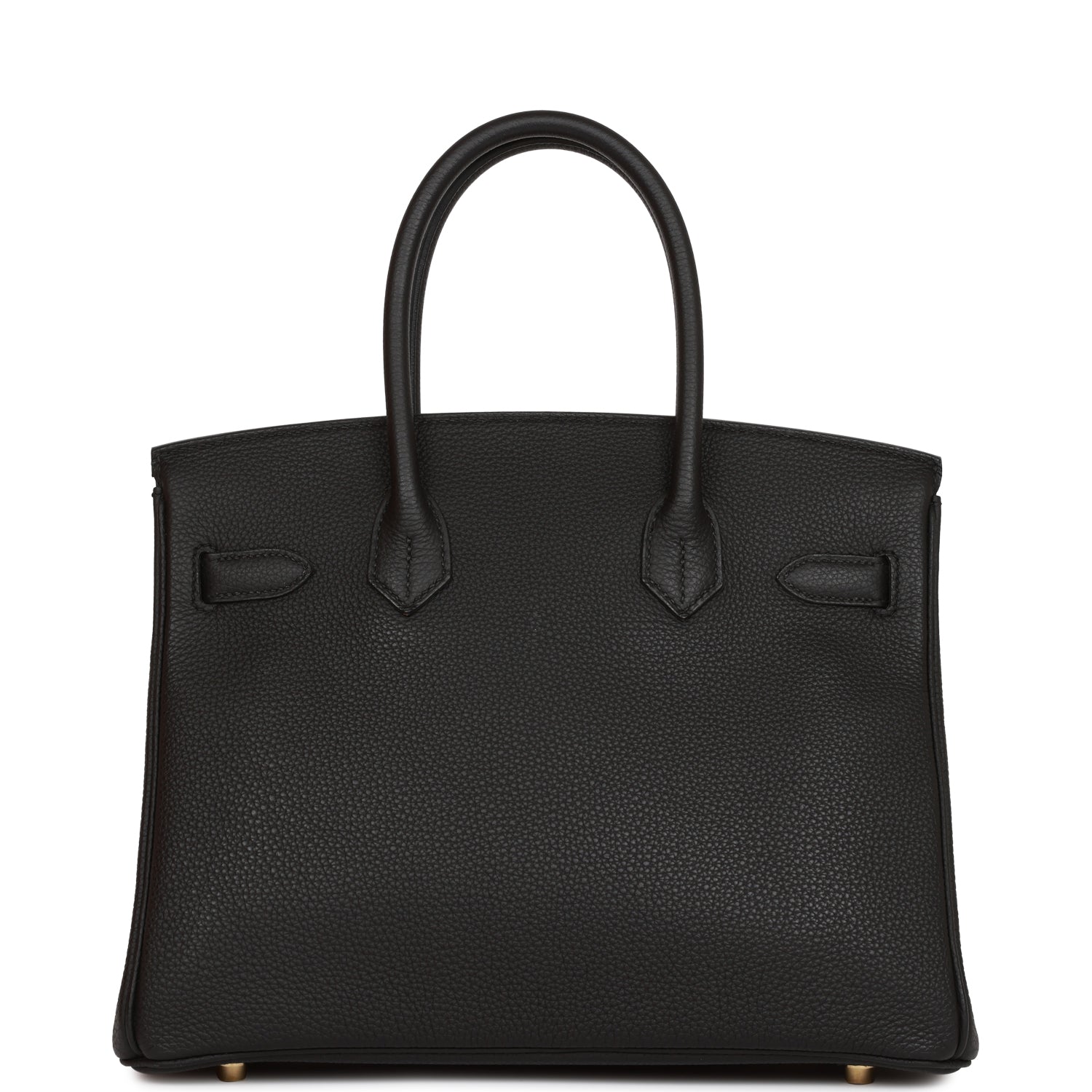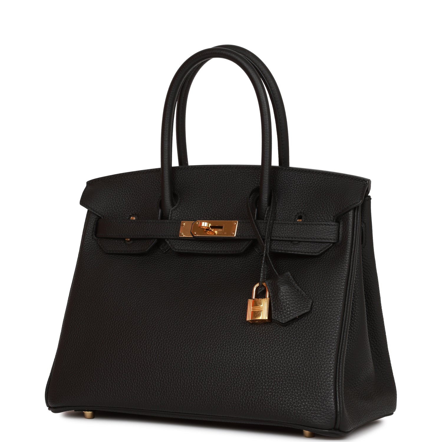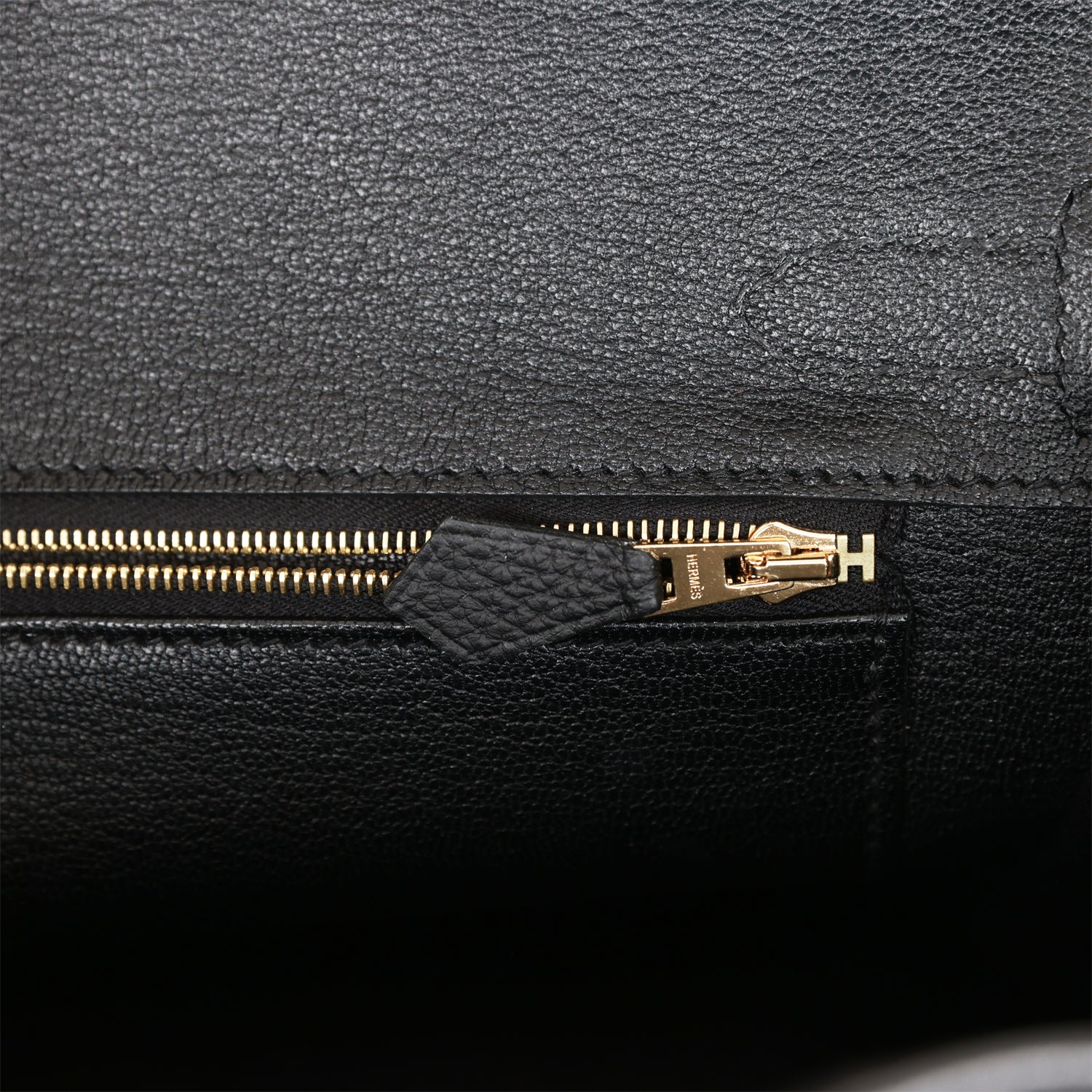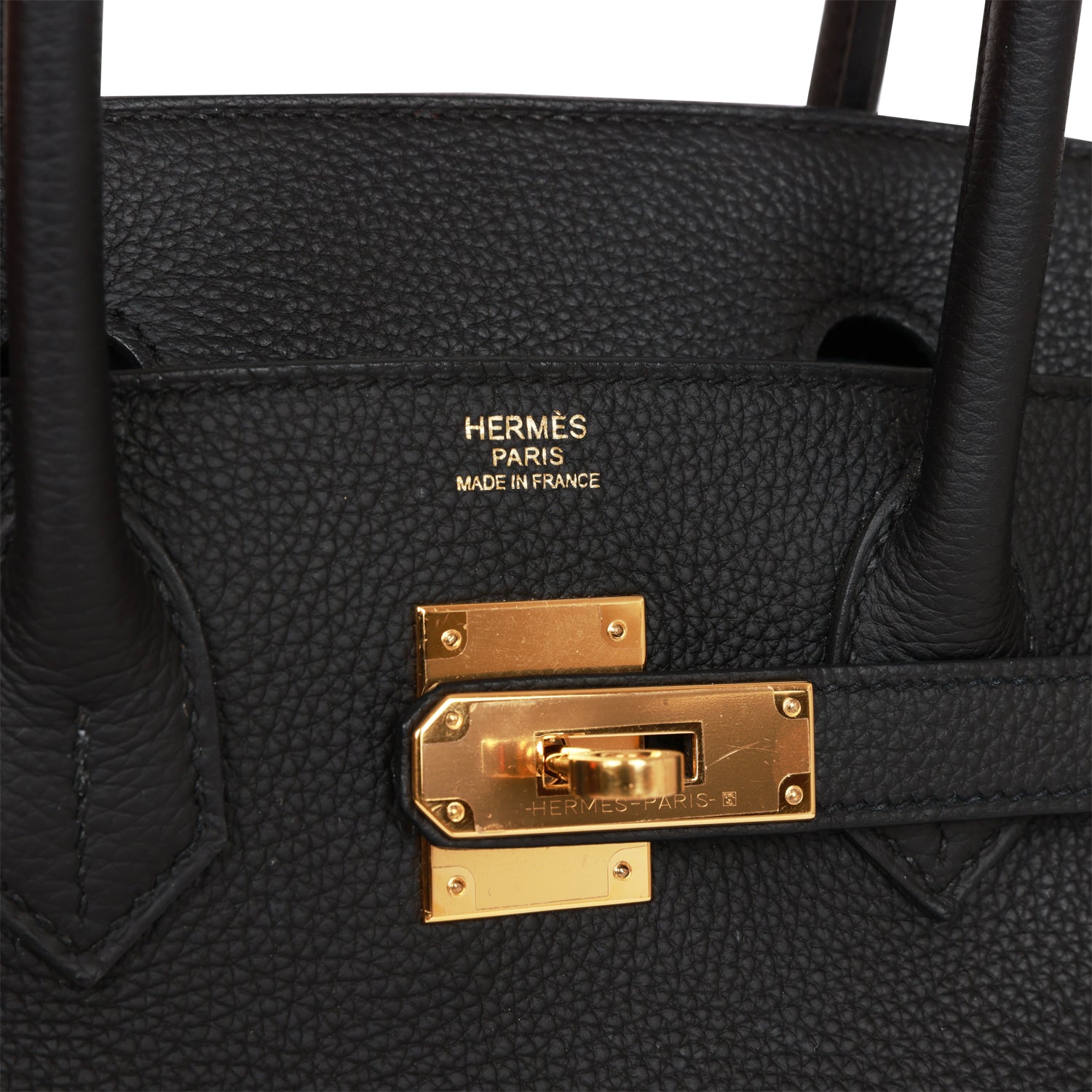 This Birkin is in Black togo leather with gold hardware and has tonal stitching, front flap, two straps with center toggle closure, clochette with lock and two keys, and double rolled handles.