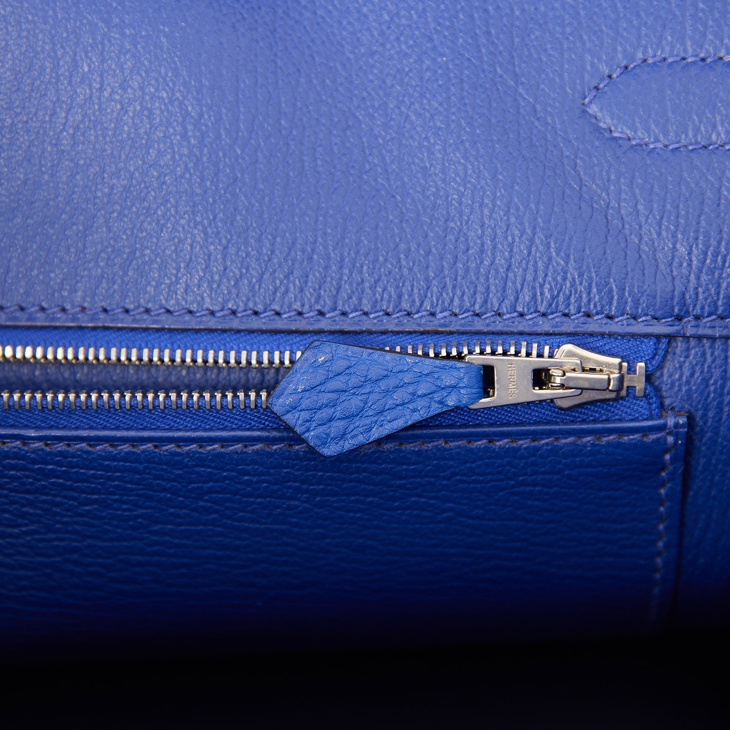 This Birkin is in Bleu Electric togo leather with palladium hardware and tonal stitching, front flap, two straps with center toggle closure, clochette with lock and two keys, and double rolled handles.