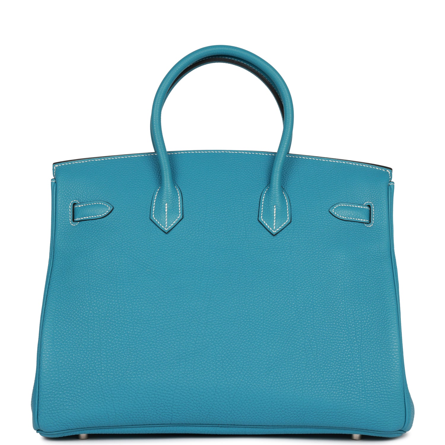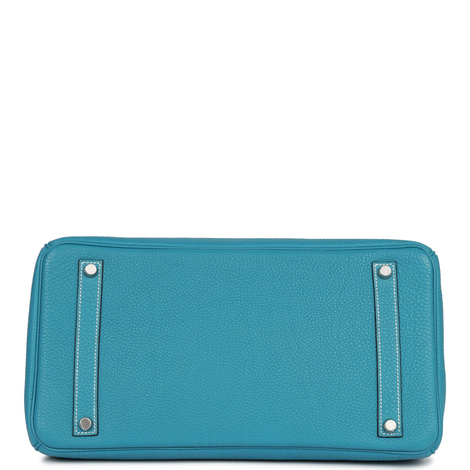 This Birkin is in Bleu Jean togo leather with palladium hardware and has white contrast stitching, front flap, two straps with center toggle closure, clochette with lock and two keys, and double rolled handles.