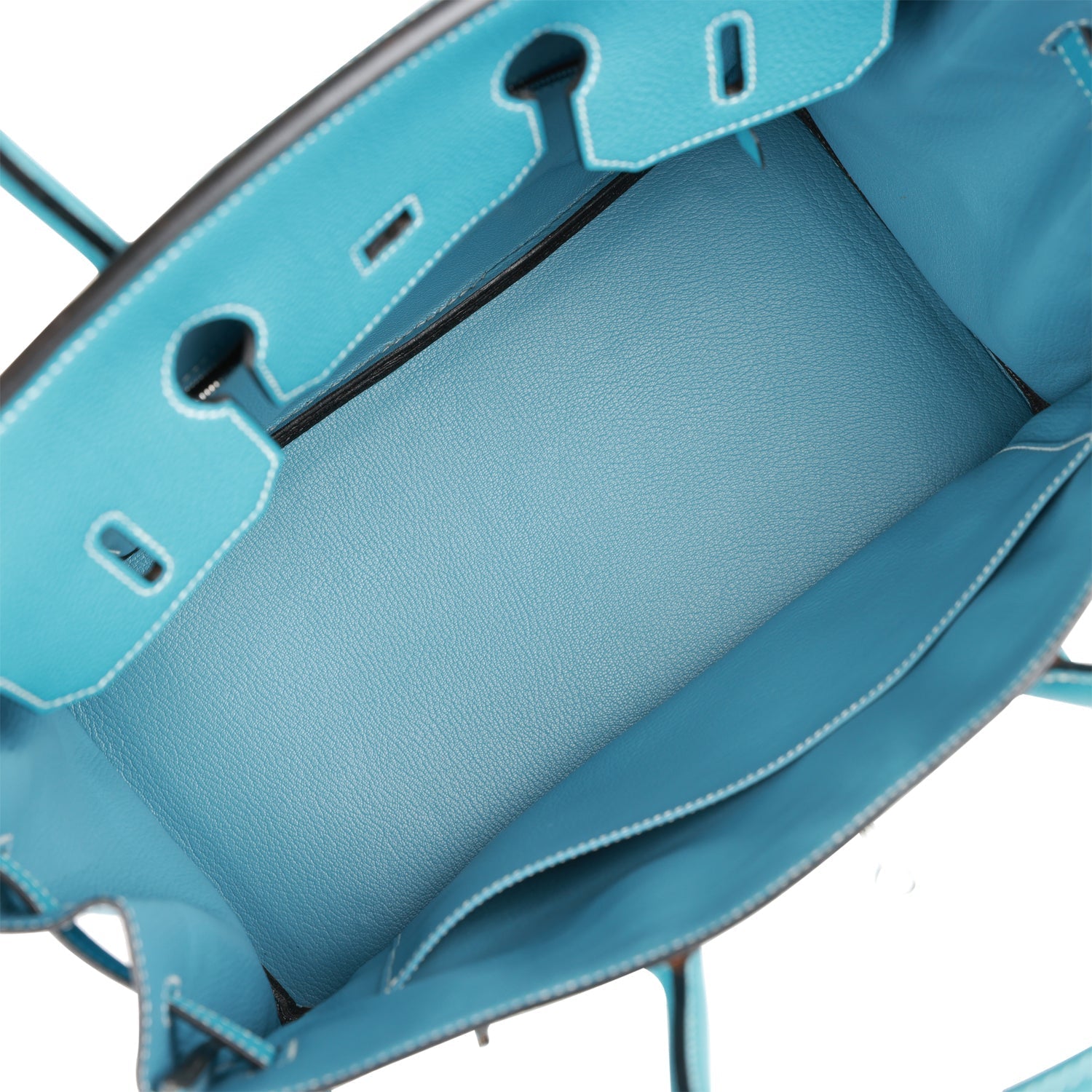 The interior is lined with Bleu Jean chevre and has one zip pocket with an Hermes engraved zipper pull and an open pocket on the opposite side.