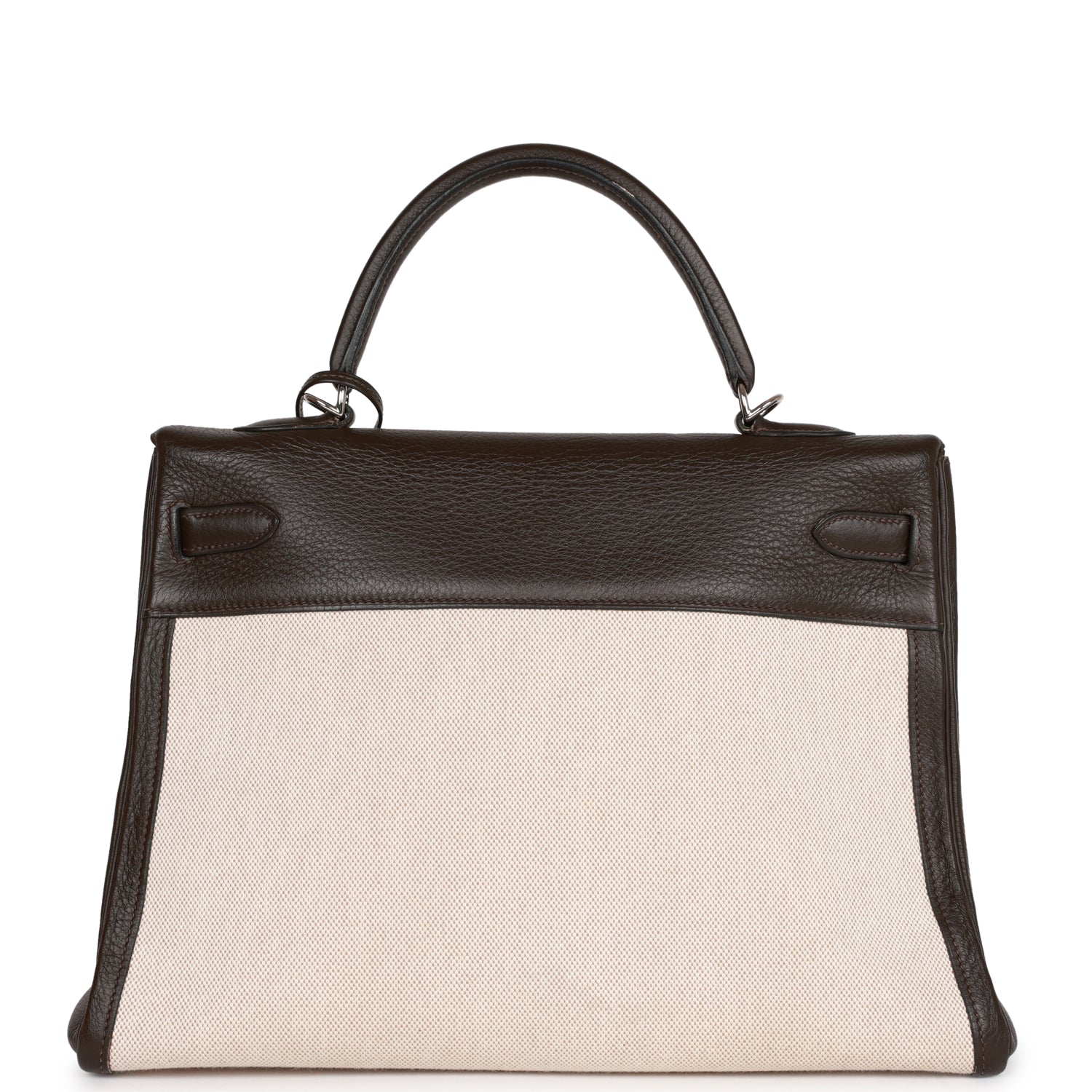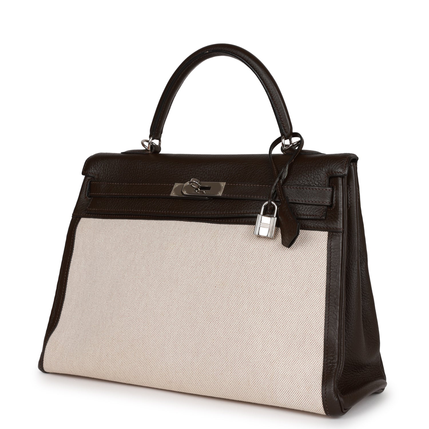 This Hermes Kelly 35 is in Ebene clemence leather with natural toile, palladium hardware, tonal stitching, two straps with front toggle closure, clochette with lock and two keys, single rolled handle and removable shoulder strap.