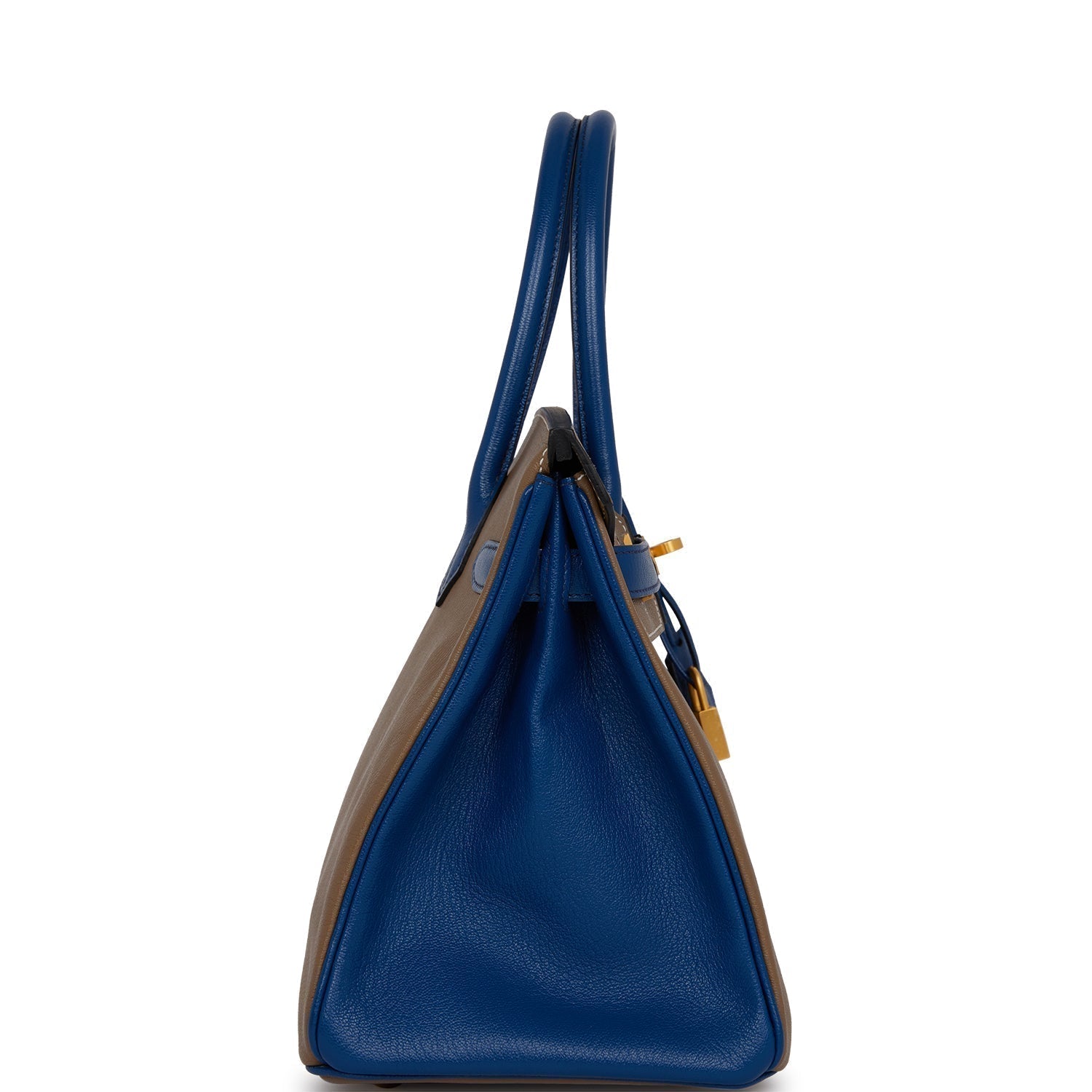 This Special Order Birkin is in Etoupe and Bleu Saphire chevre leather with brushed gold hardware and has tonal and constrast stitching, front flap, two straps with center toggle closure, clochette with lock and two keys, and double rolled handles.