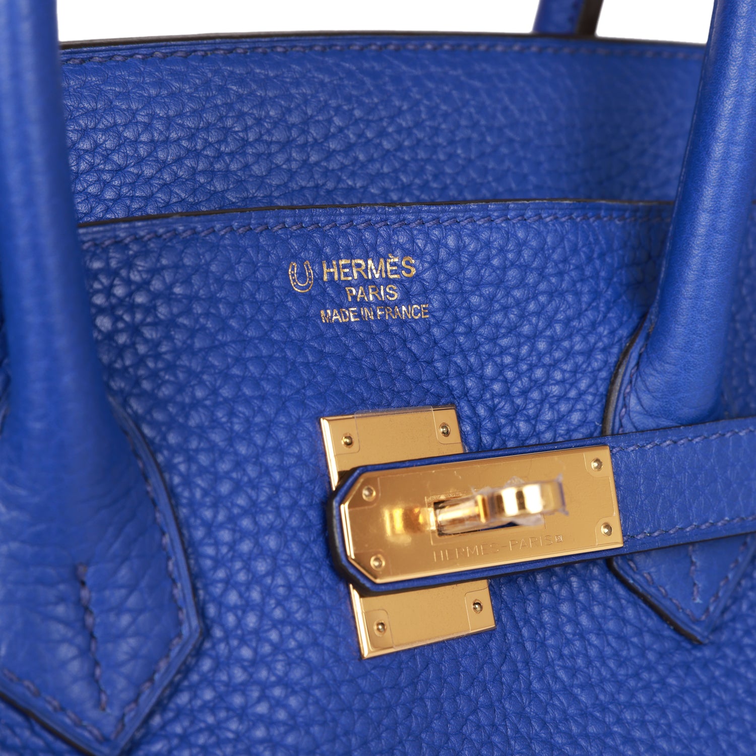 This Special Order Birkin is in Bleu Electric clemence leather with gold hardware and has tonal stitching, front flap, two straps with center toggle closure, clochette with lock and two keys, and double rolled handles.