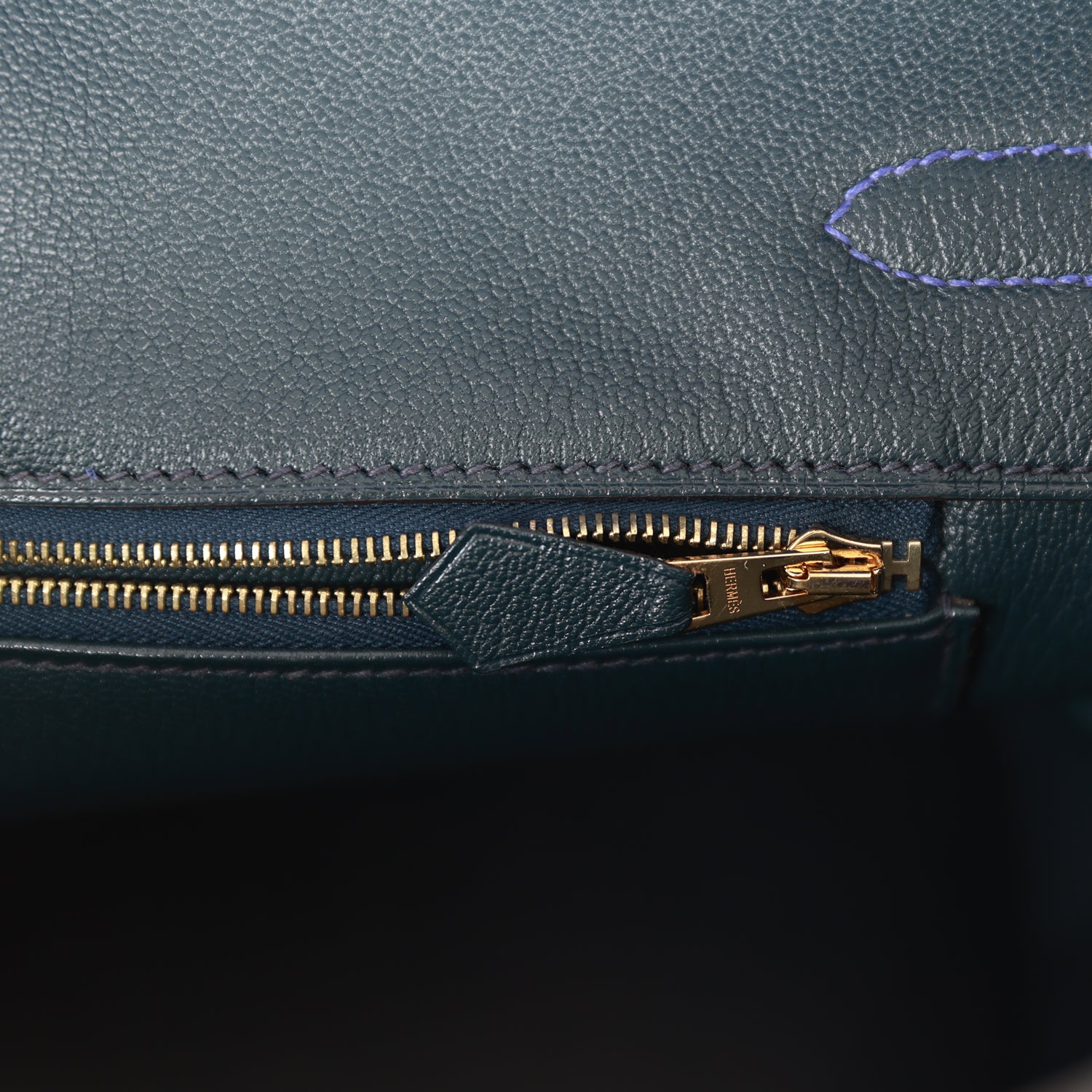 The interior is lined with Vert Fonce chevre and has one zip pocket with an Hermes engraved pull and an open pocket on the opposite side.