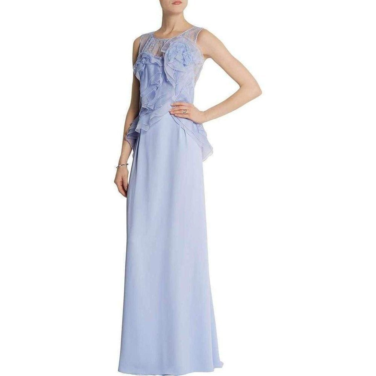Nina Ricci's lavender silk crêpe sleeveless gown is flou tailored with layers of frothy ruffles running in a diagonal across the bodice.