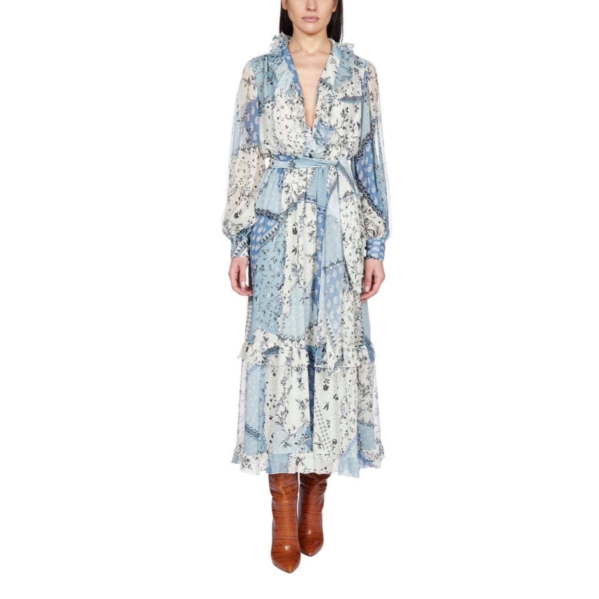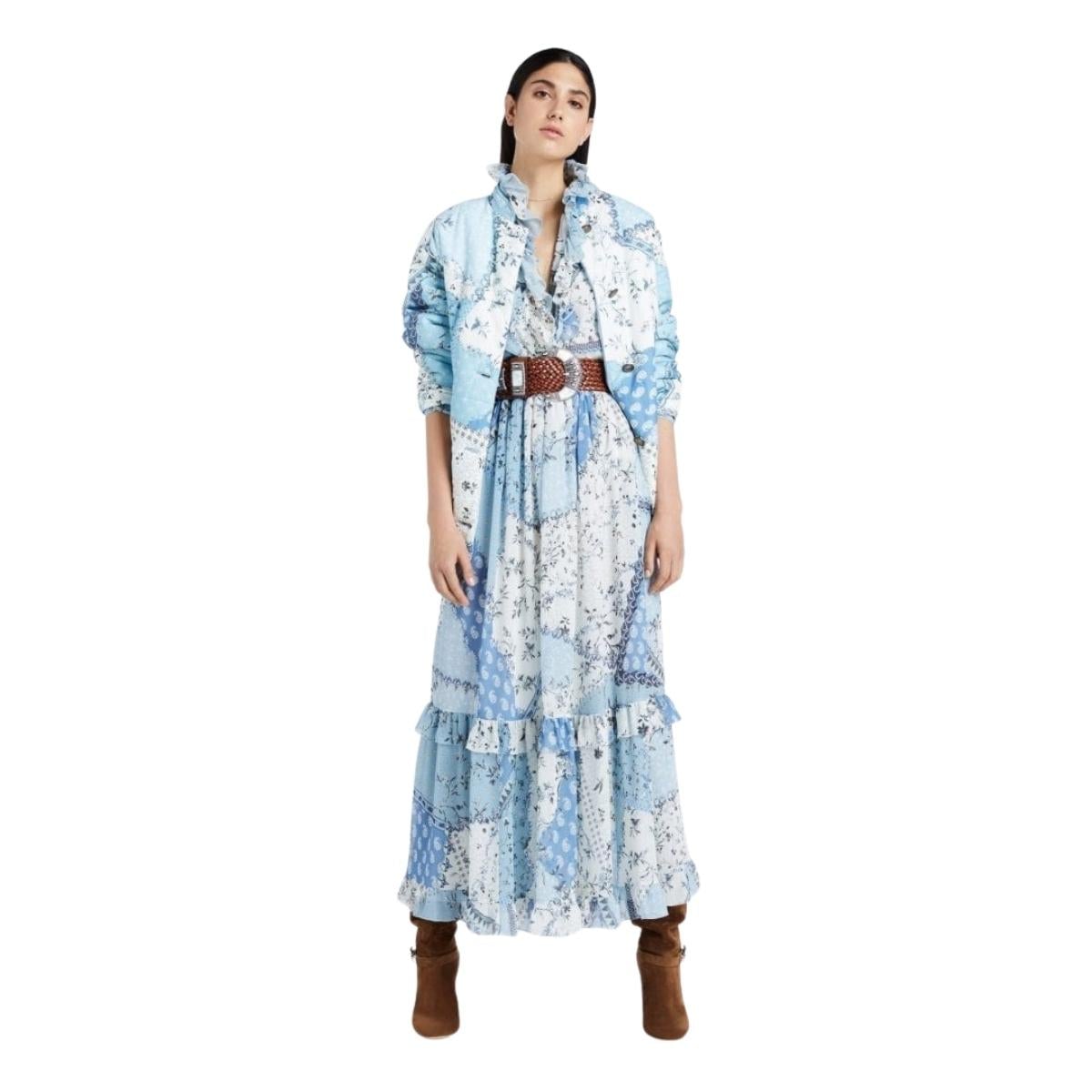 Etro chiffon dress in patchwork pattern with cascading ruffles.