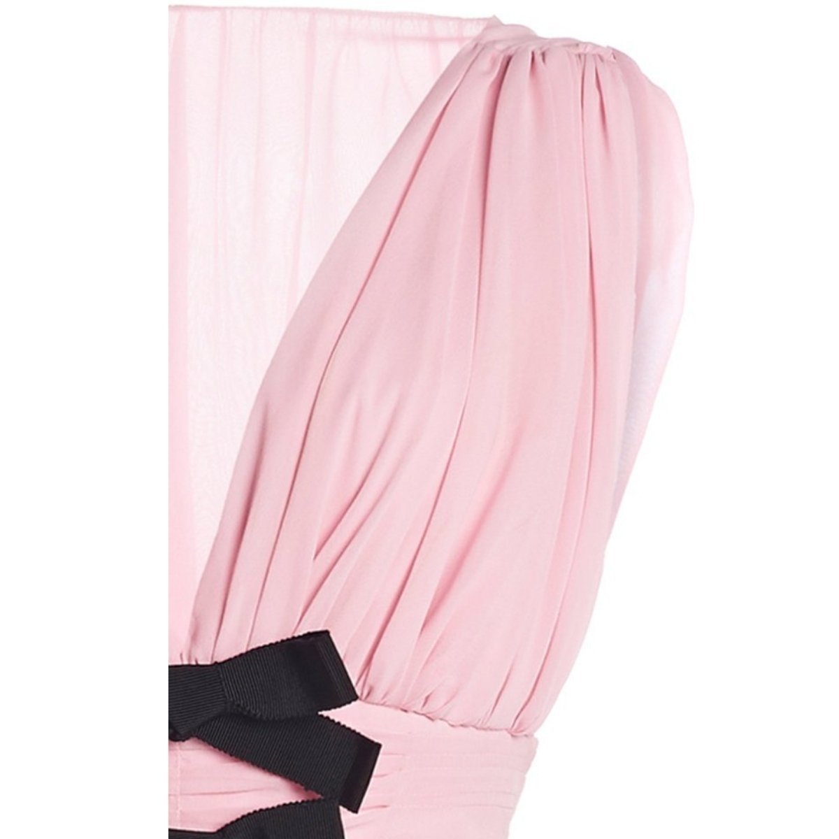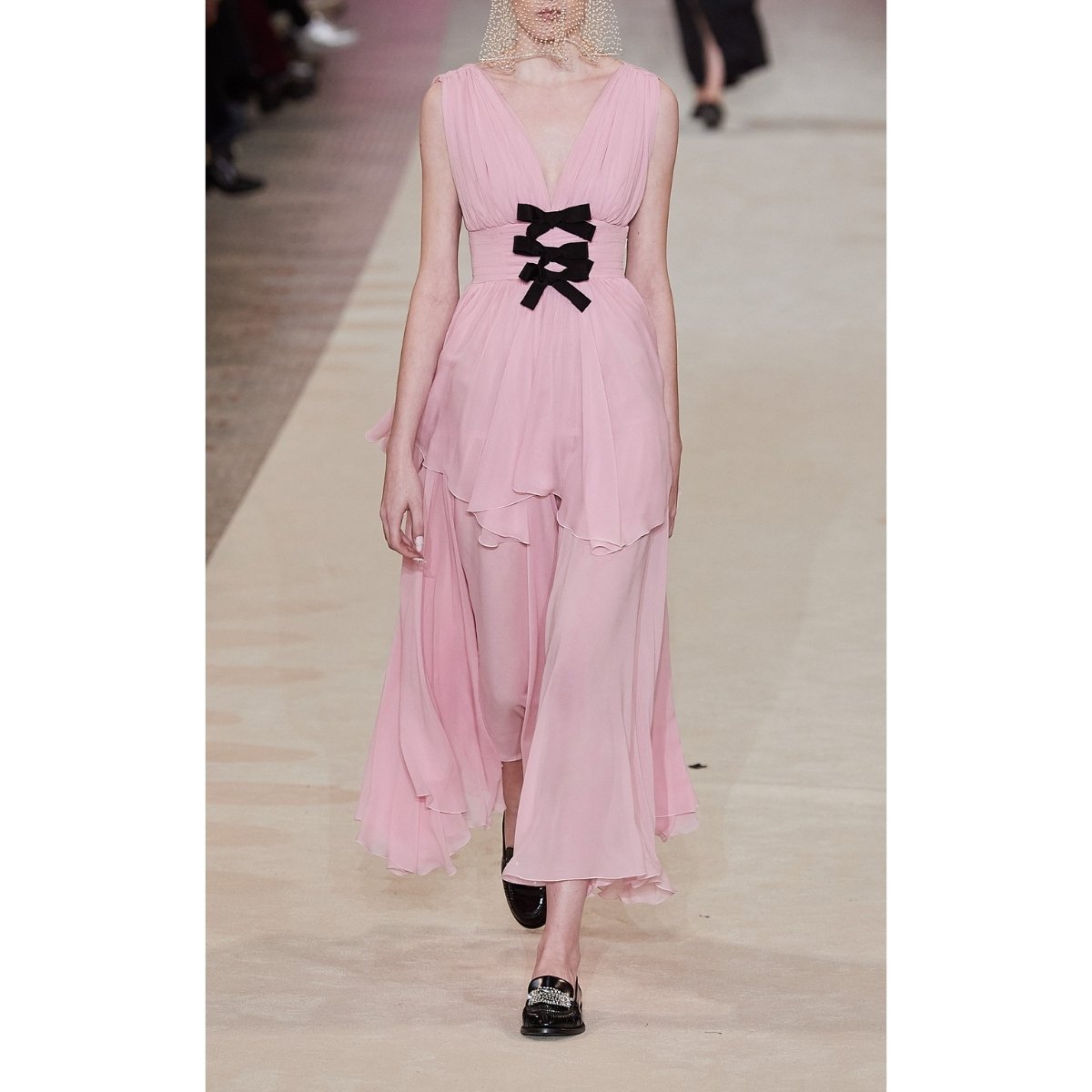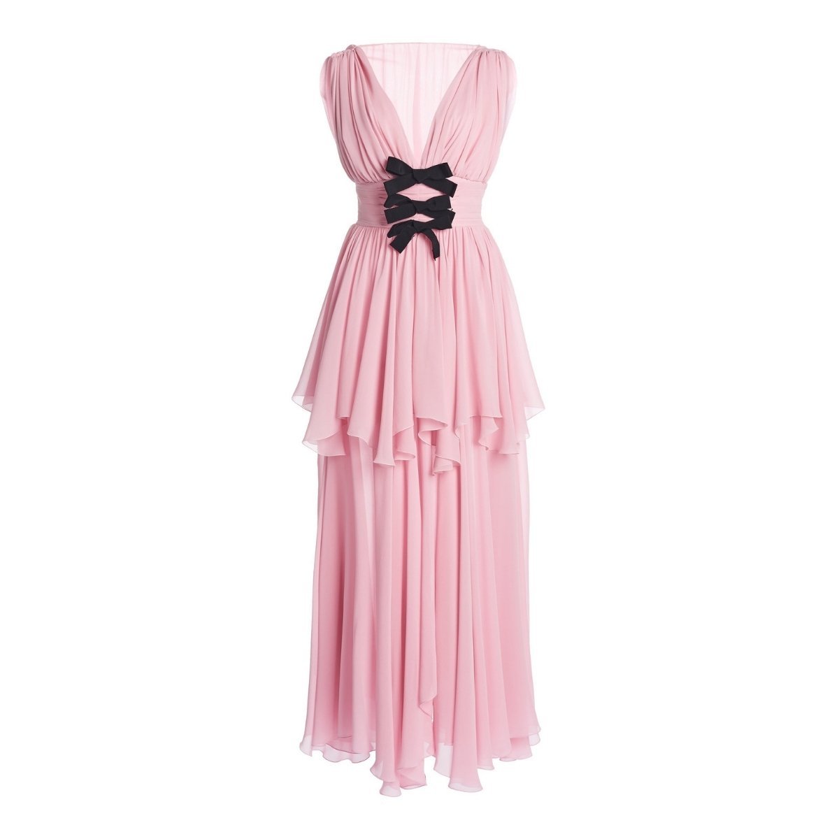 Fitted through the bodice, black grosgrain bows dot the sculpted waist, and tiers of cascading ruffles grace the full-length skirt.