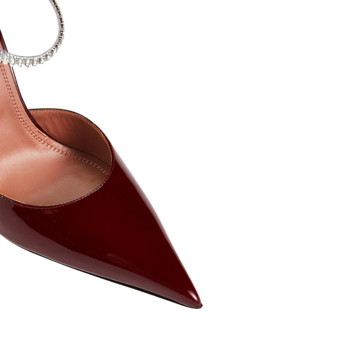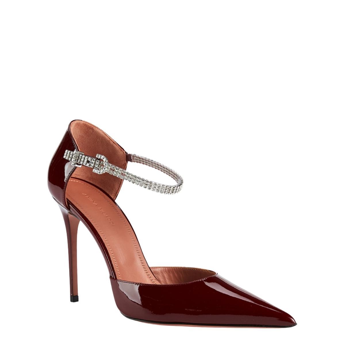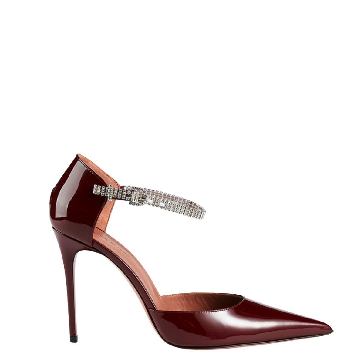 Elevated with a glossy patent finish, these leather pointed-toe pumps are detailed with a sparkling crystal ankle strap and are mounted on a covered stiletto heel.