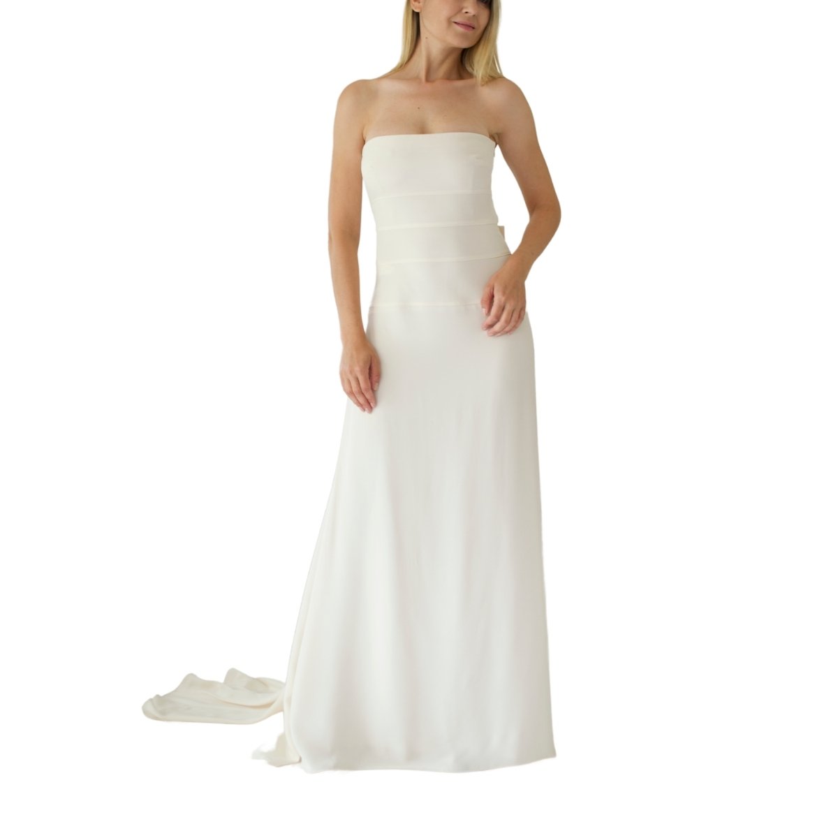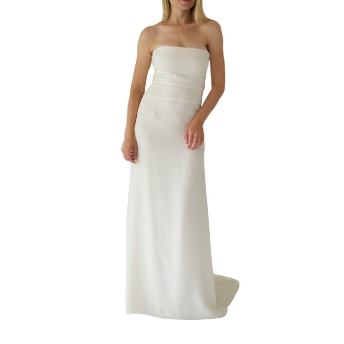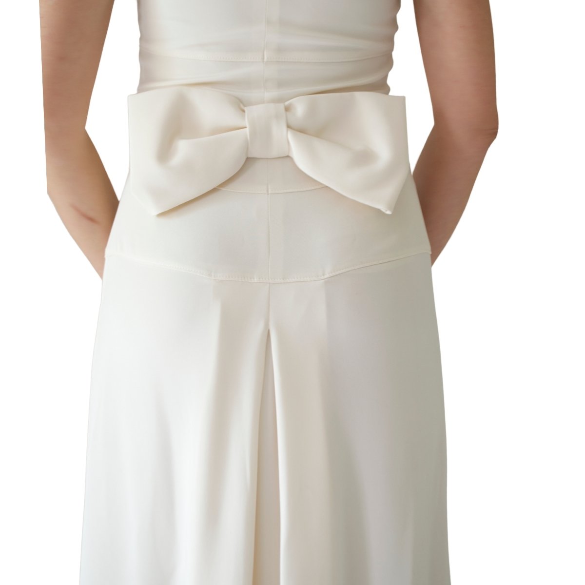 Elegantly adorned with an oversized bow, Valentino's ivory silk strapless gown