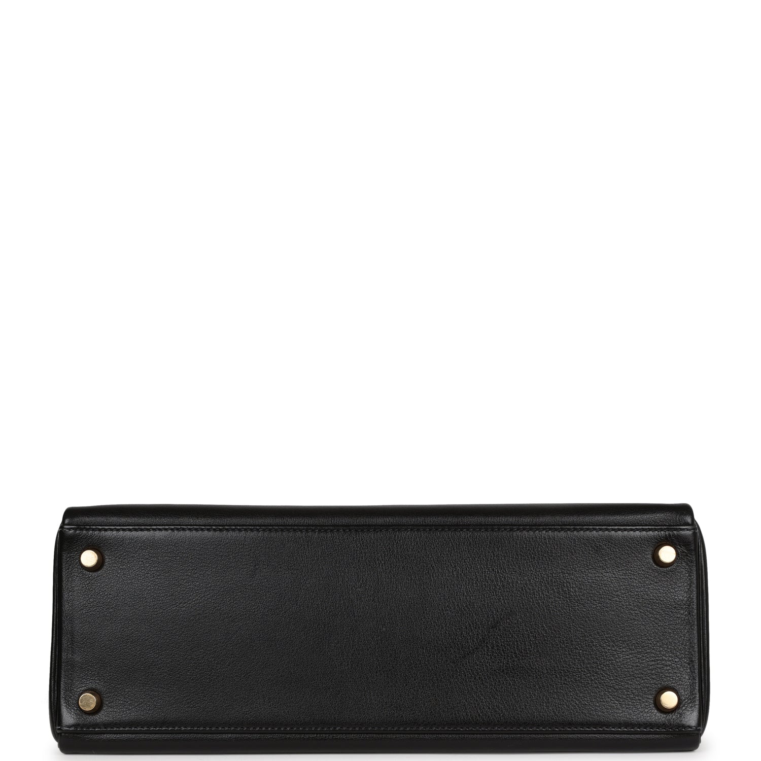 This Vintage Kelly is in Black gulliver leather with gold hardware and has tonal stitching, front flap, two straps with center toggle closure, clochette with lock and two keys, single rolled handle and removable shoulder strap.