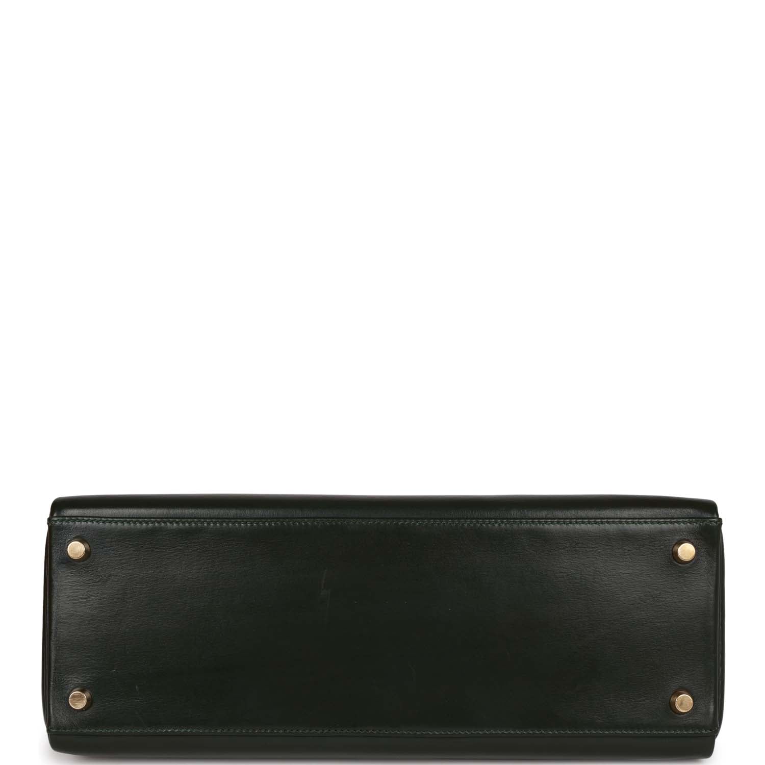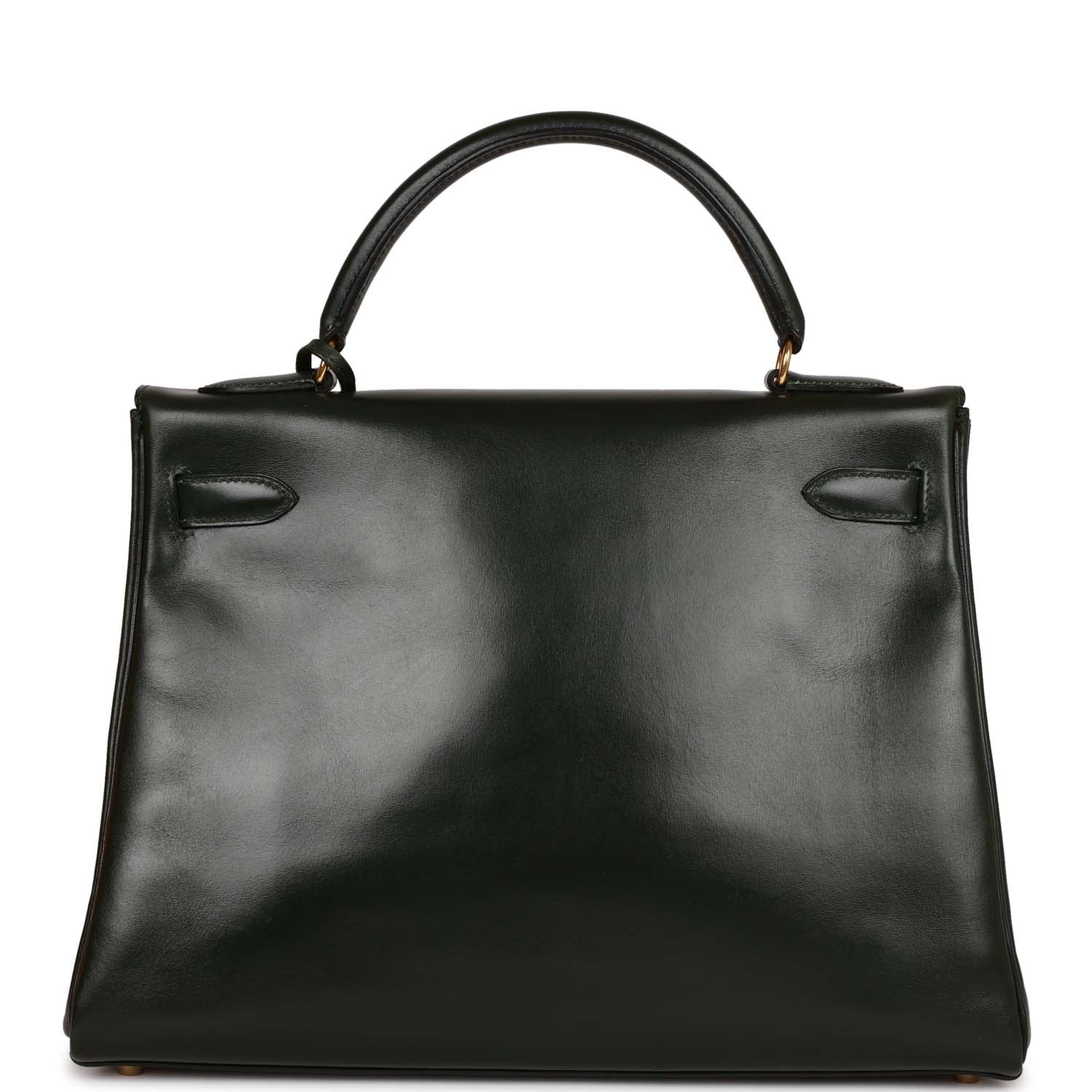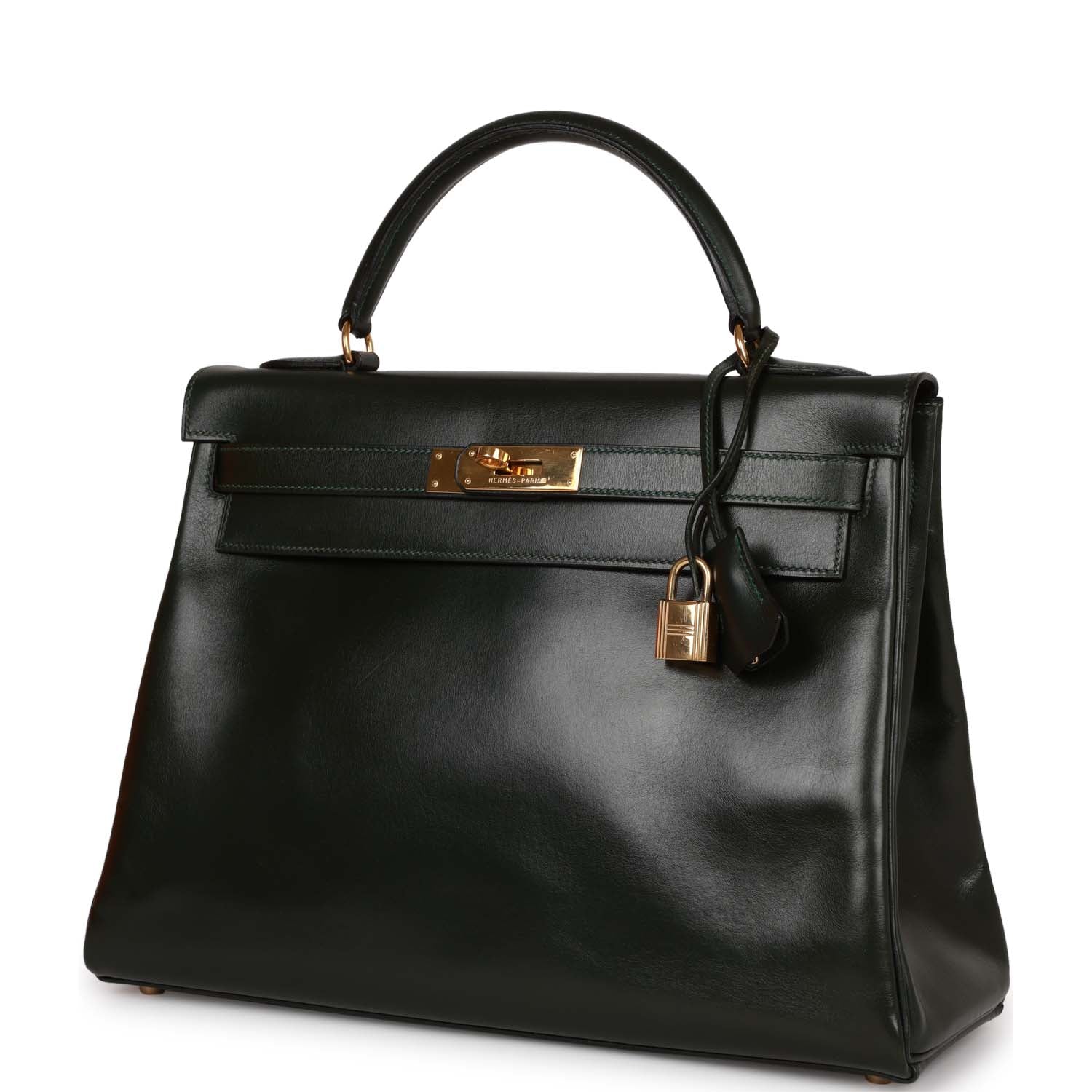 This Kelly, in the Retourne style, is in Vert Fonce box leather with gold hardware and has tonal stitching, two straps with front toggle closure, clochette with lock and two keys, single rolled handle and removable shoulder strap.