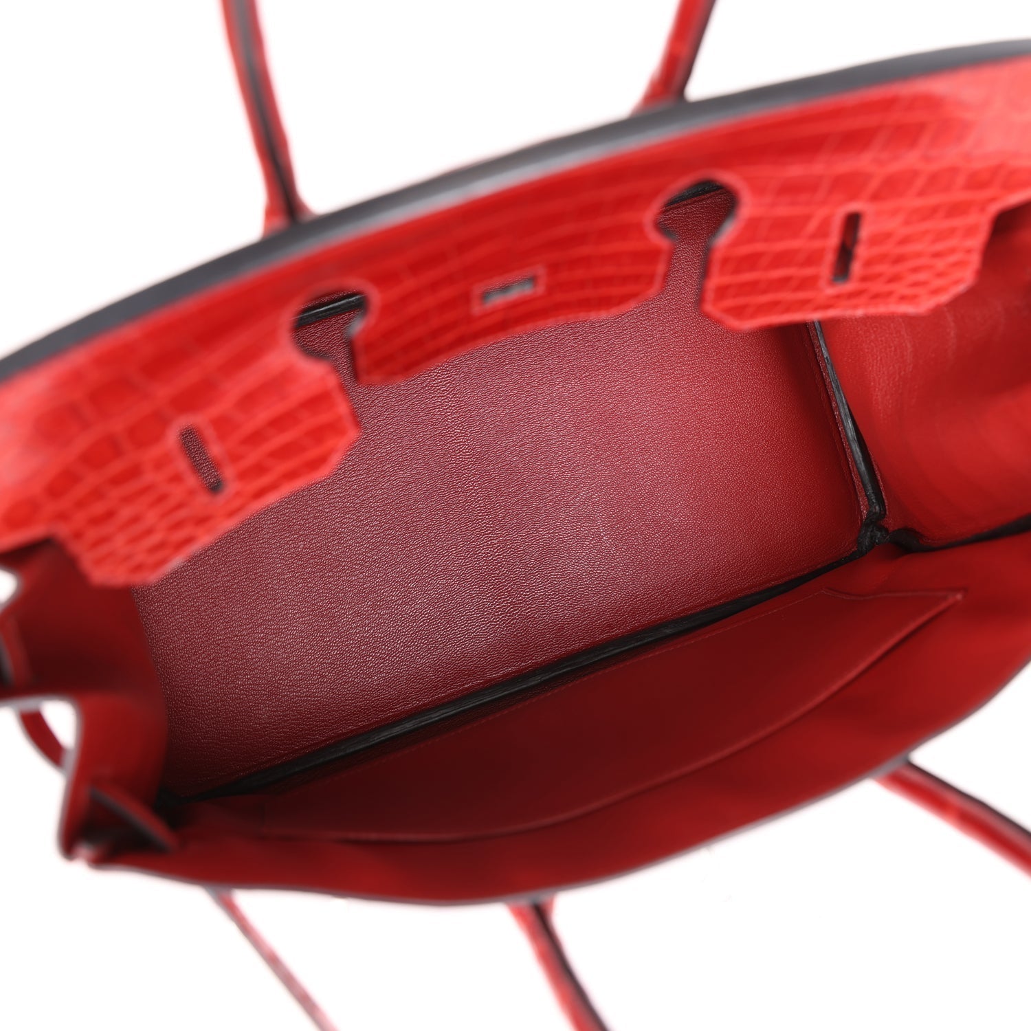 The interior is lined with Rouge H chevre and has one zip pocket with an Hermes engraved zipper pull and an open pocket on the opposite side.