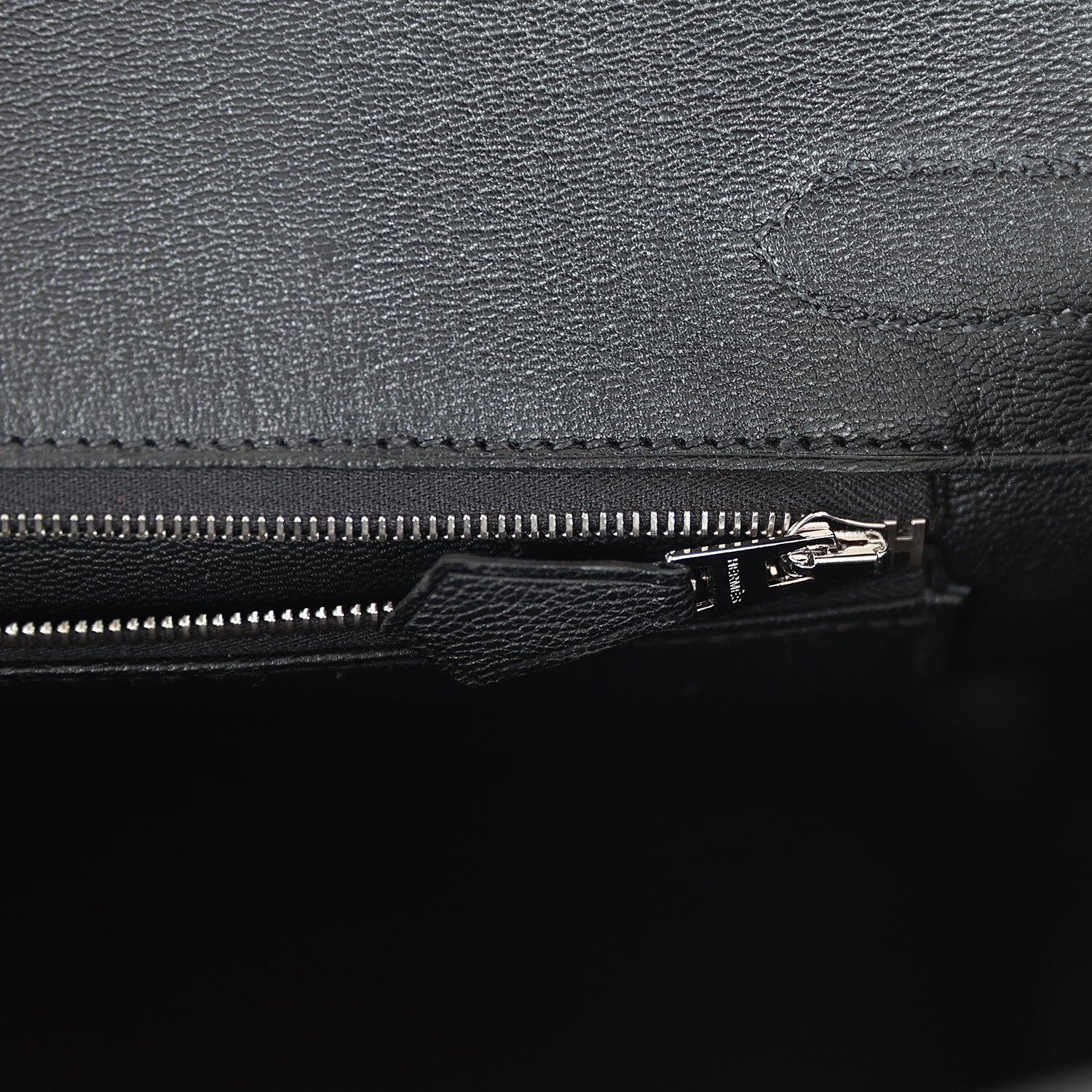 The interior is lined with Black chevre and has one zip pocket with an Hermes engraved zipper pull and an open pocket on the opposite side.