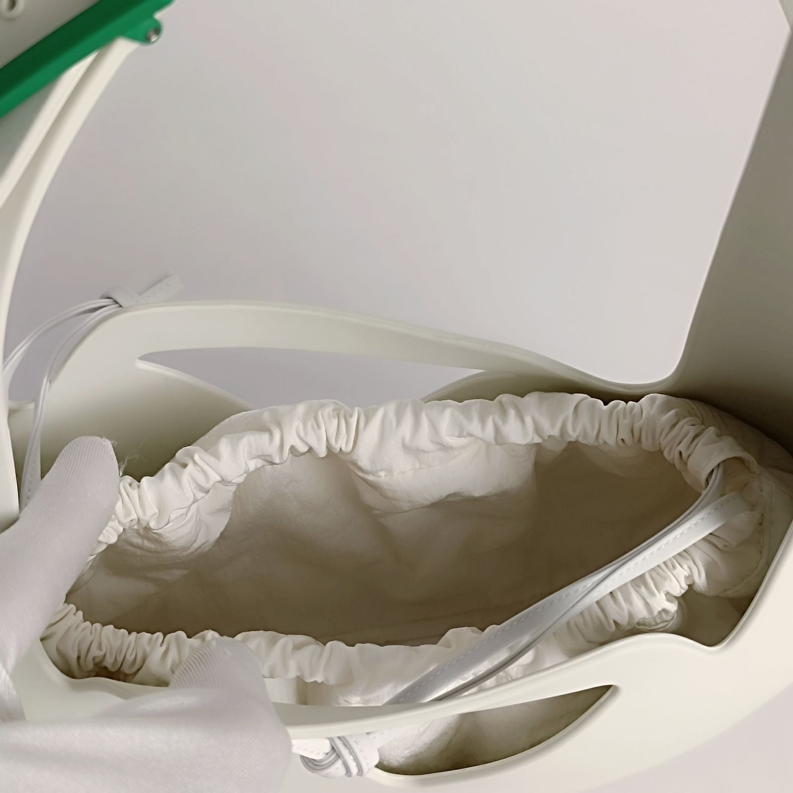 Bottega Veneta Small Punch Rubber bag in white rubberIt comes from store display and has never been used.However, it has a very small scratch on the bottom (see photo with arrow)Adjustable shoulder strap.Green plastic finishes.Removable internal clutch bag.Complete with dust bag and tag.DIMENSIONS: L: 27 cm - H: 17 cm - L: 7 cmCODE: 5647B321BRAND: Bottega VenetaProduced in ItalyWhite colorMATERIAL: RubberCONDITION: New