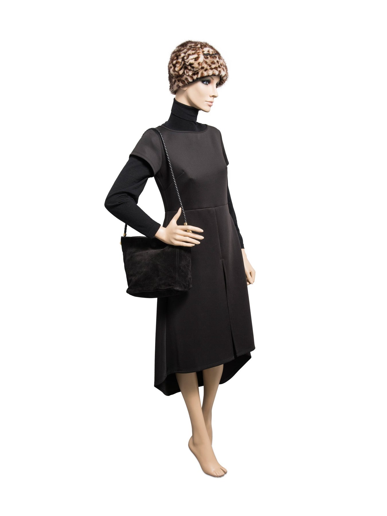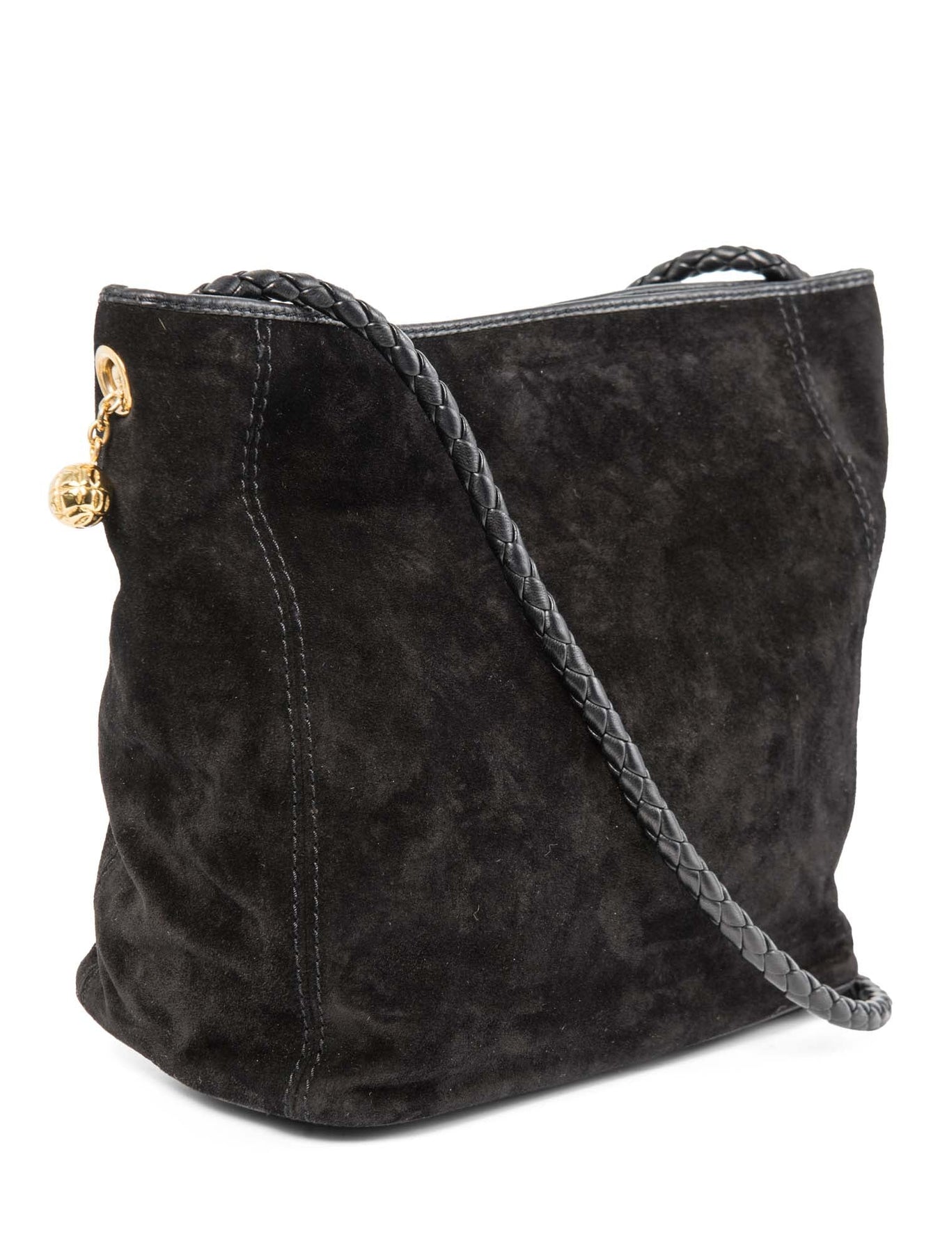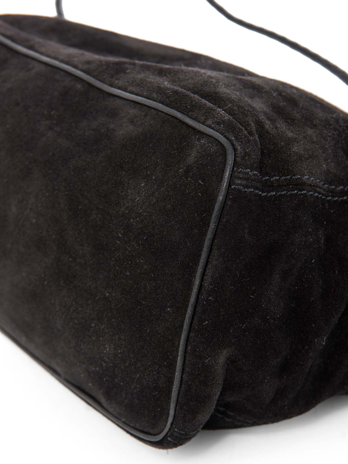 Bottega Veneta Hobo Bag or . This Bottega Veneta bag is in black suede with a intrecciato leather handle and gold tone hardware. It features a magnetic snap button closure and globe handle charms. The bag opens up to a black canvas lined interior with one zipper pocket.