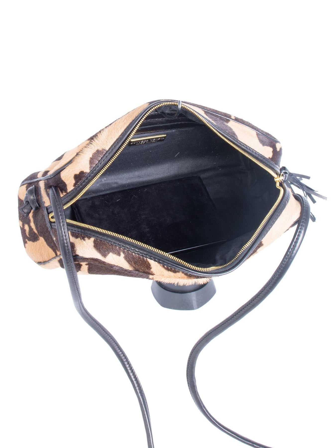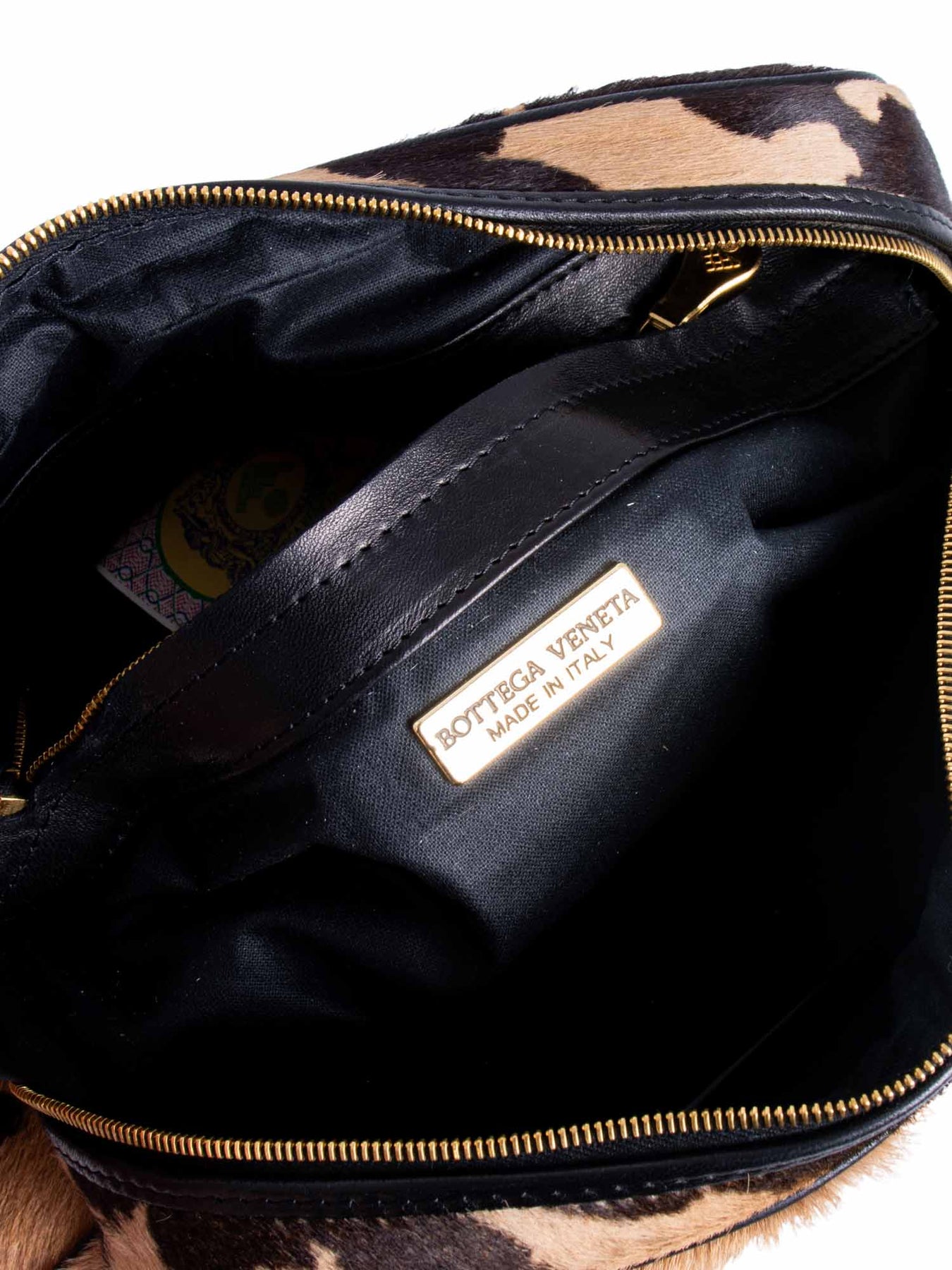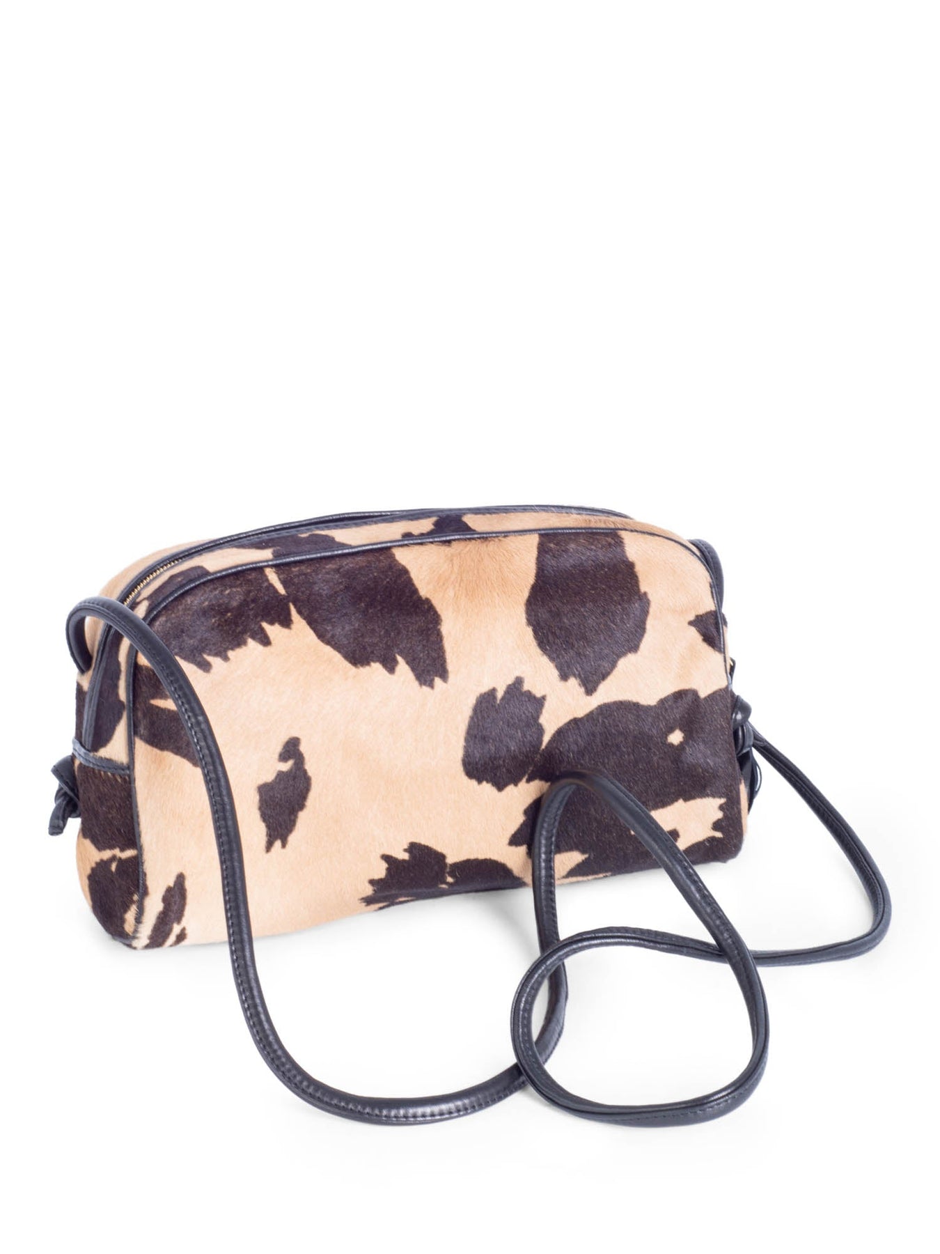 Bottega Veneta Leather Cowhide Messenger Bag or . This Bottega Veneta bag is in patterned cowhide in beige and brown tones featuring black leather strap and tassel detail on the zipper. This bag opens with a zippered closure to black specially treated canvas interior with one zippered pocket.