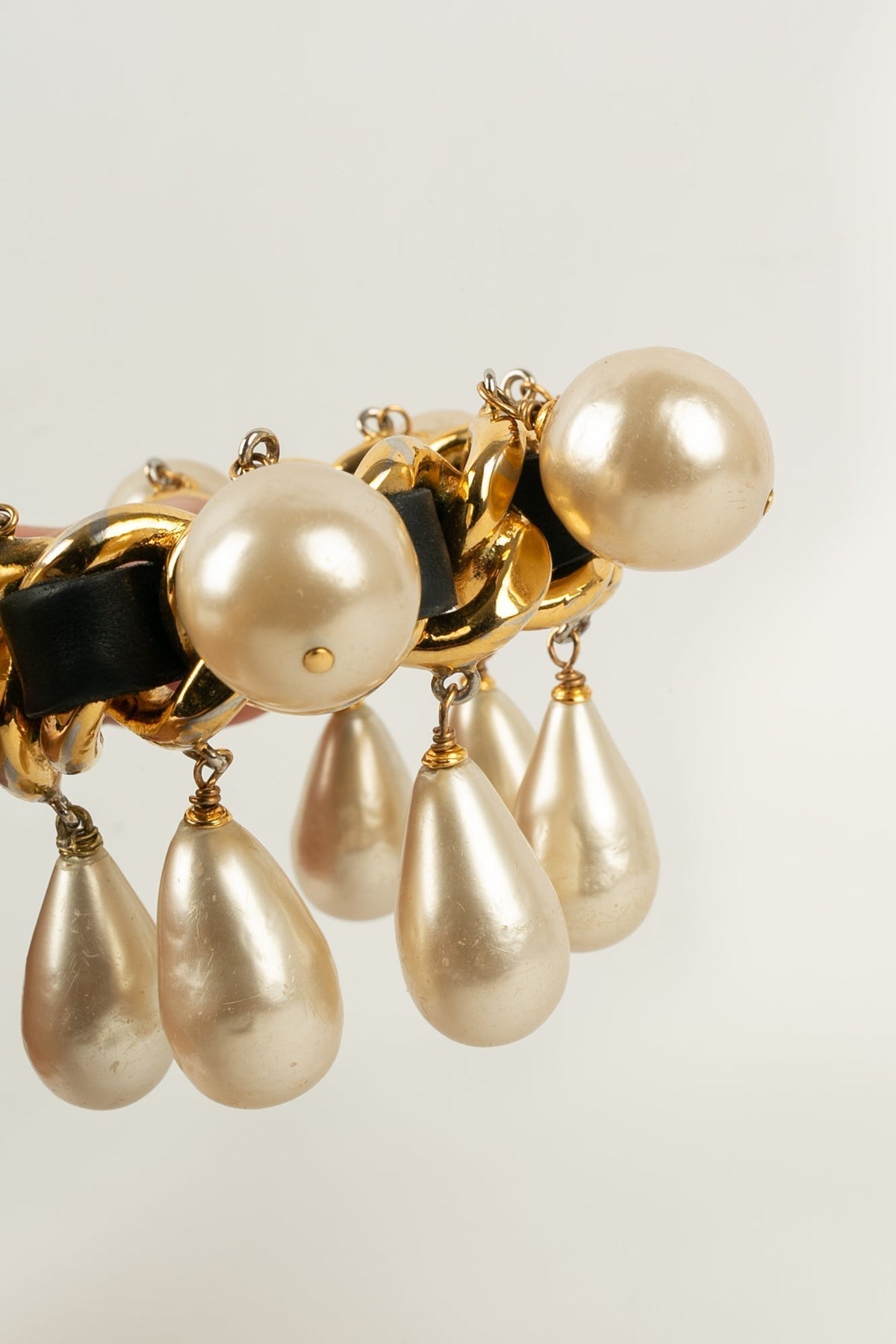 CHANEL - (Made in France) Bracelet en métal doré entrelacé de cuir noir. Il est accompagné de gouttes nacrées fantaisies. Collection 2cc3. A signaler, rares marques sur les perles.