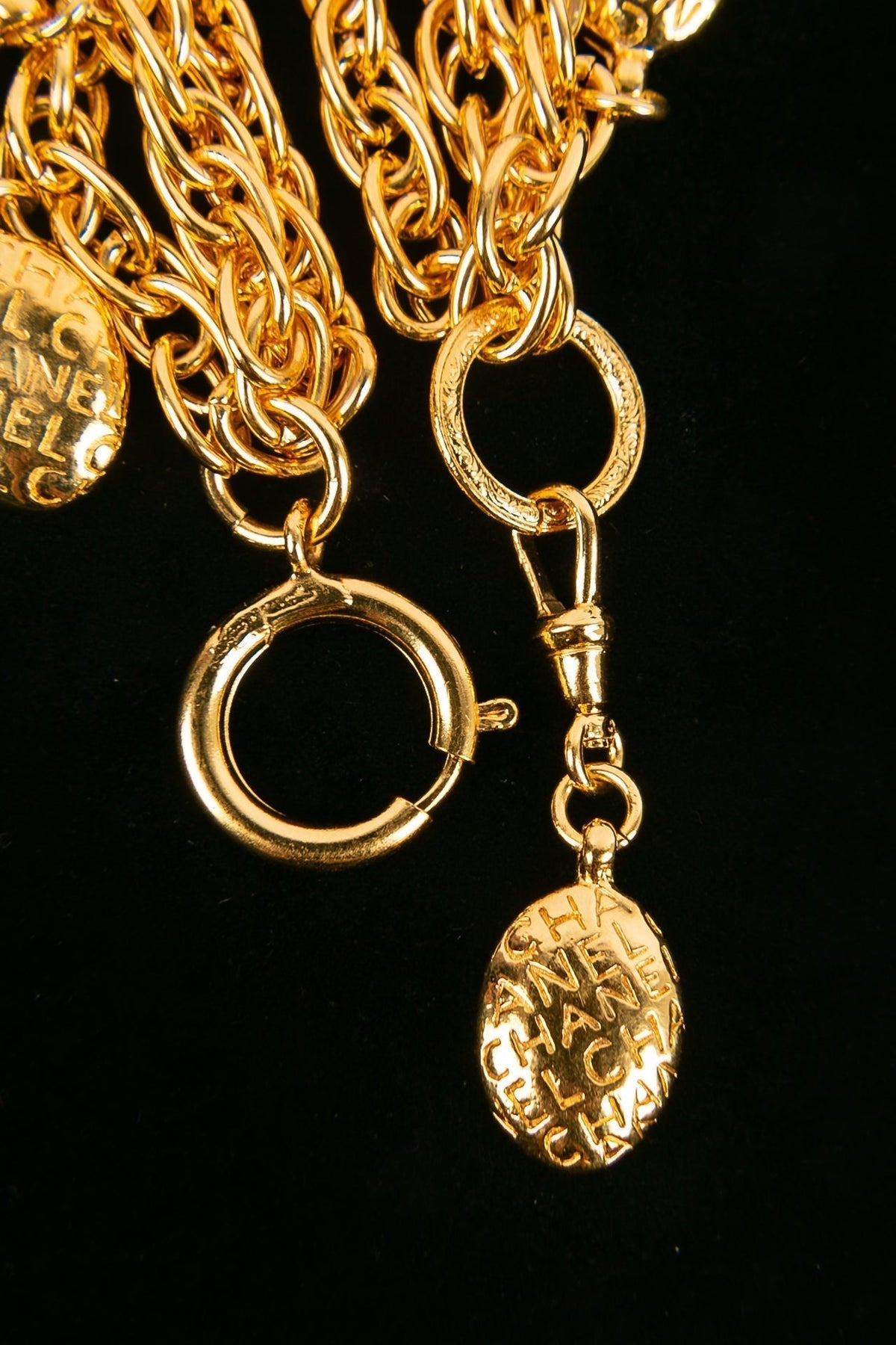 CHANEL -(Made in France) Bracelet en métal doré et médailles gravées Chanel.