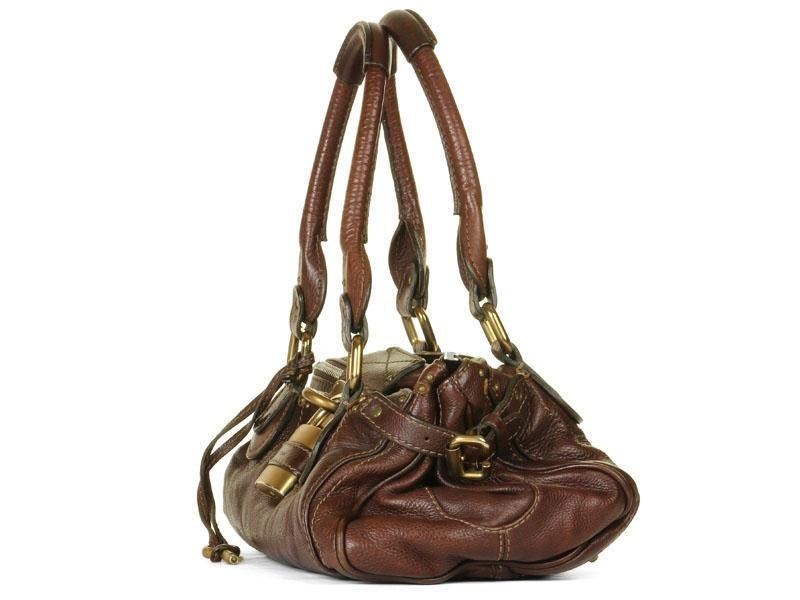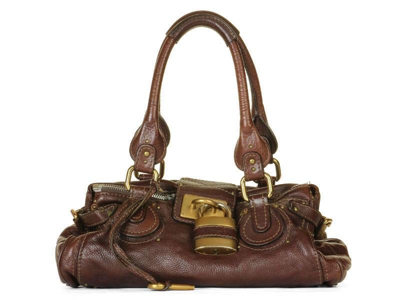 Especially nice thick leather was used on Chloé's Brown Paddington! Two-toned hardware is also used on it, as is usual for Chloé, with buckles at the ends, feet, padlock, hanging key, and zippers that go up to the flap in the center that opens to the beige fabric lining. There are two pockets inside, both a zipped pocket and a cell phone pocket, while the outside has a slide pocket on each side and a drop of eight inches to the handles. This bag has seen some love and has pen marks inside, as well as wear and marks on the outside. Lose weight fast by leaving the padlock at home or go all out and take it along!
