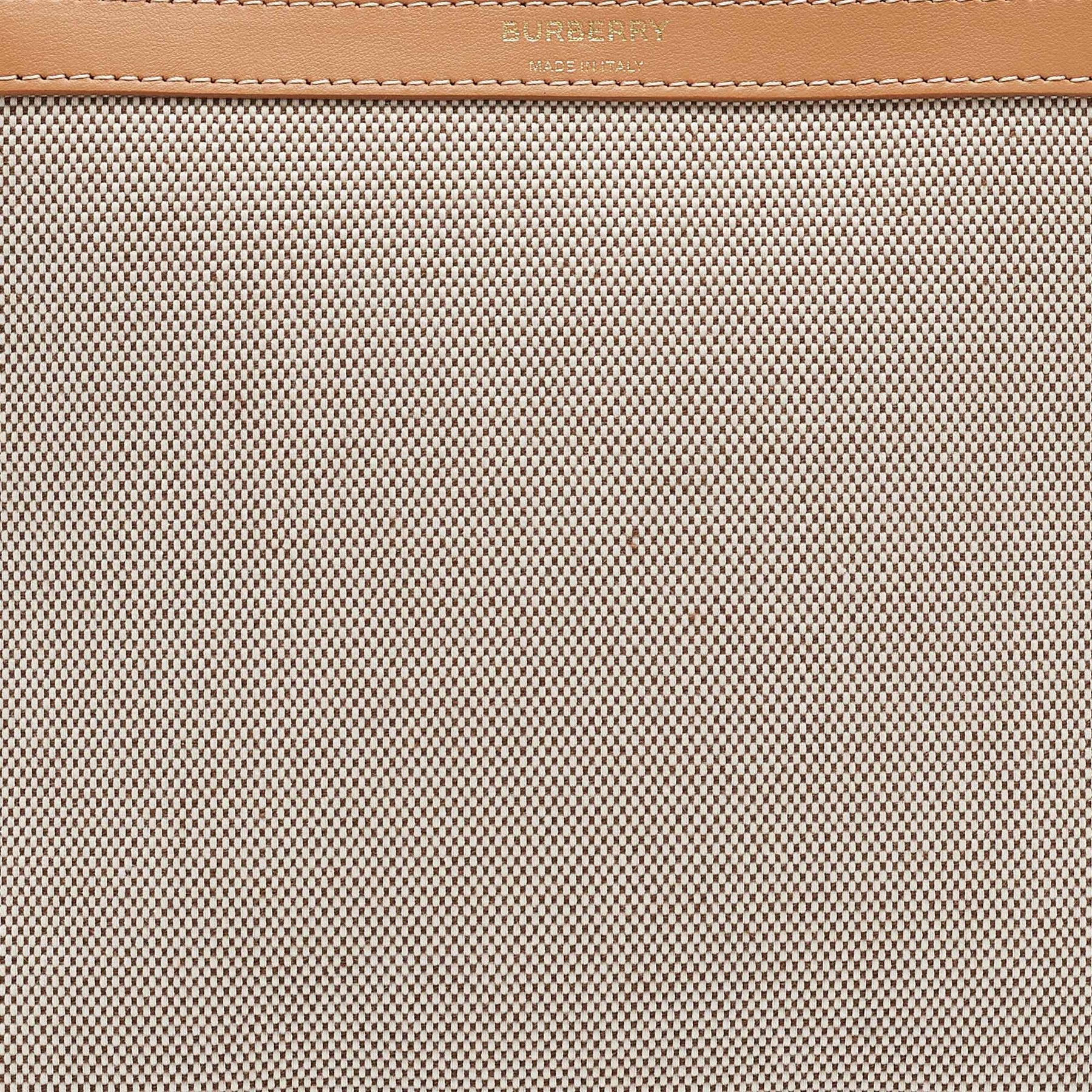 Keep your essentials effortlessly in this Burberry pouch. It features an elegant design in beige canvas and tan leather with a roomy interior.