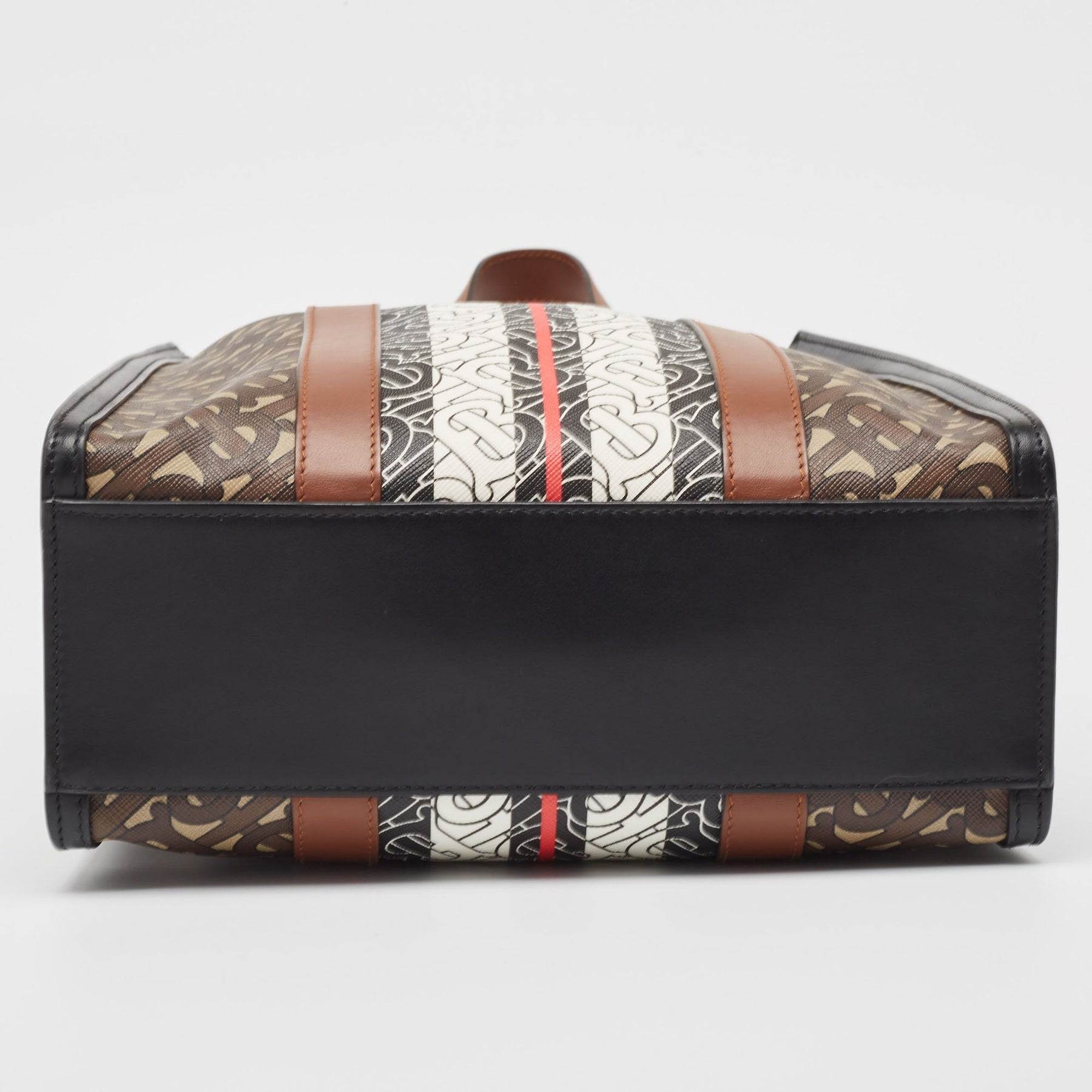 BURBERRY Black/Brown TB Monogram Coated Canvas and Leather Stripe Portrait Tote