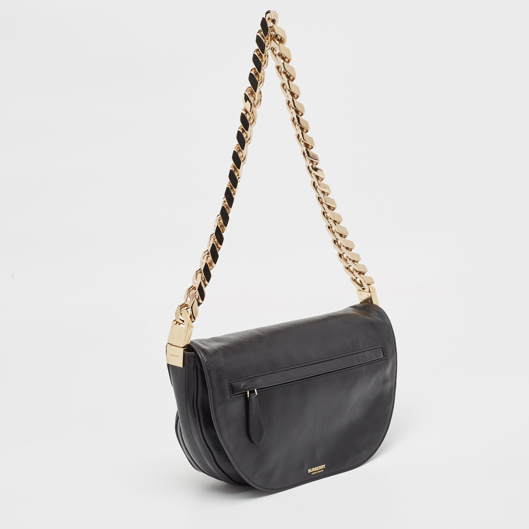 With an architectural shape, this Burberry Olympia bag resembles the crescent moon. The brand signature on the front lends to its instant identification, and it can be carried conveniently with a shoulder strap. Capturing the essence of feminity, it celebrates beauty through its creative design.