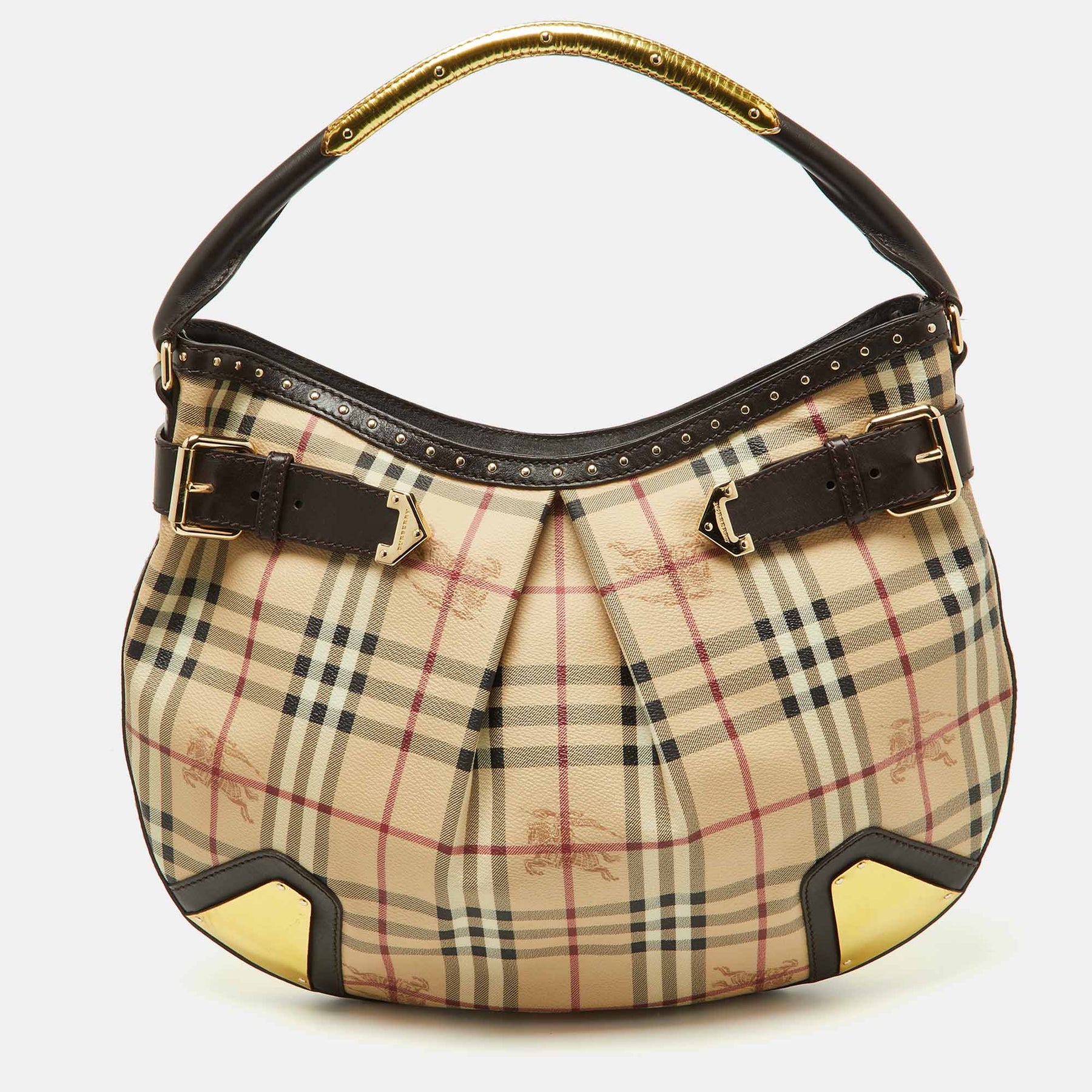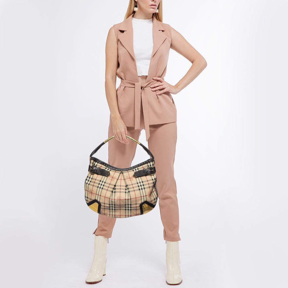 BURBERRY Dark Brown/Beige House Check PVC and Leather Studded Hartley Hobo