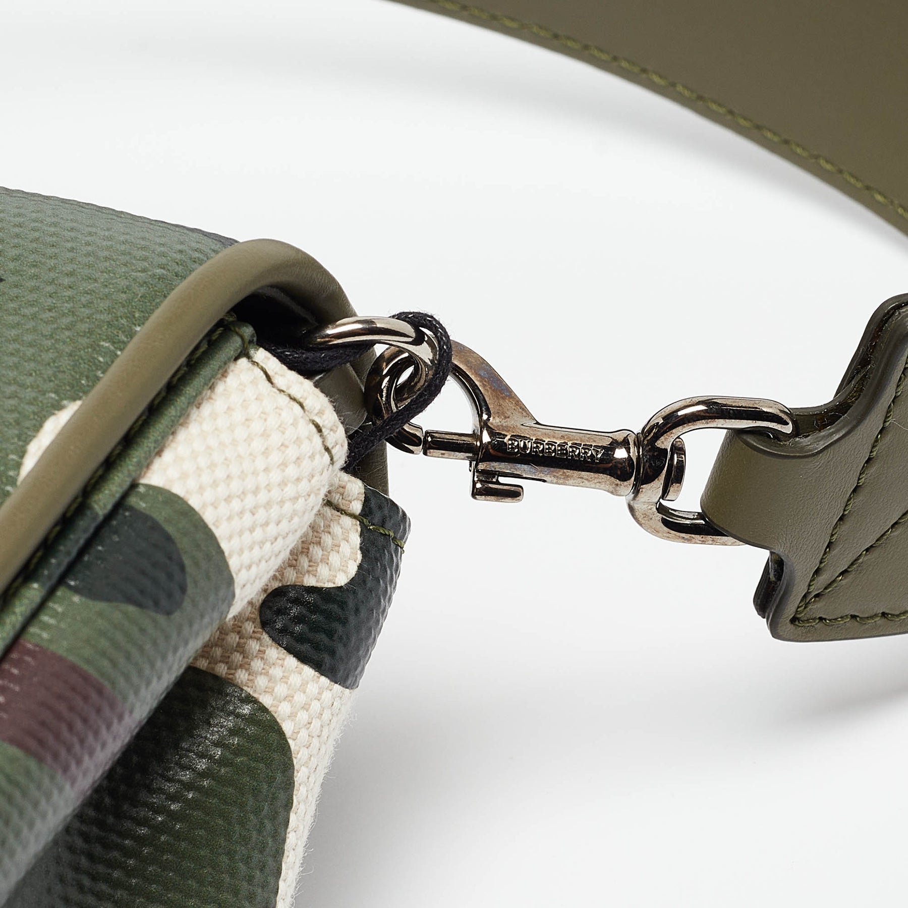 Crafted with meticulous attention to detail, this Burberry Hackberry accessory seamlessly blends urban chic with utility. The striking camo print adds a touch of edgy charm, while the leather accents exude refinement. Perfect for the modern trendsetter.
