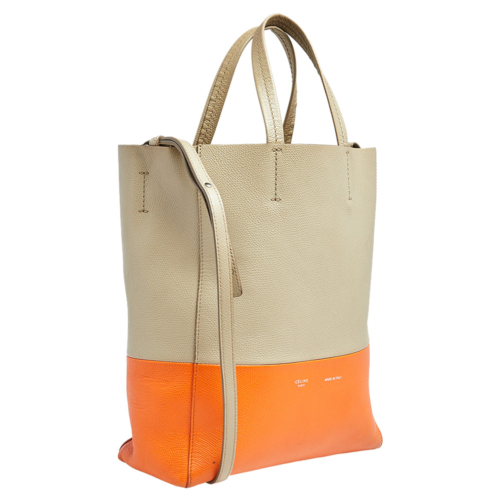 This Vertical Cabas tote brings a wonderful mix of fashion and function. This Celine tote has been crafted from grained leather in two shades. It is held by two top handles and equipped with a spacious interior for you to carry your essentials. Say hello to your new favorite handbag