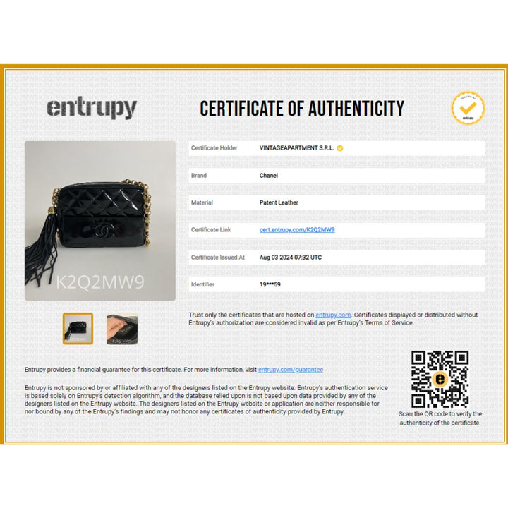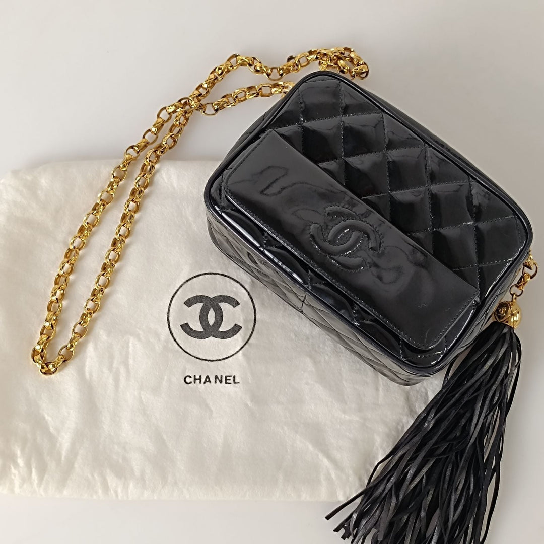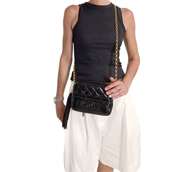 Chanel vintage Camera Matelasse bag in patent leather.Produced in Italy in 1989 - 1991.Zipper decorated with fringe.Gold plated finishes.Small front pocket with snap button.Its general condition is New, in fact it only has small prints on the New visible in the photo.Complete with dustbag.DIMENSIONS: L: 19 cm - H: 13 cm - W: 8 cm - Shoulder strap 52 cmAll our items are selected, carefully sanitized and ated by our experts.CODE: 5772B616BRAND: ChanelMADE IN: Italy CODE: 1995553Black colourMATERIAL: Patent leatherCONDITION: New
