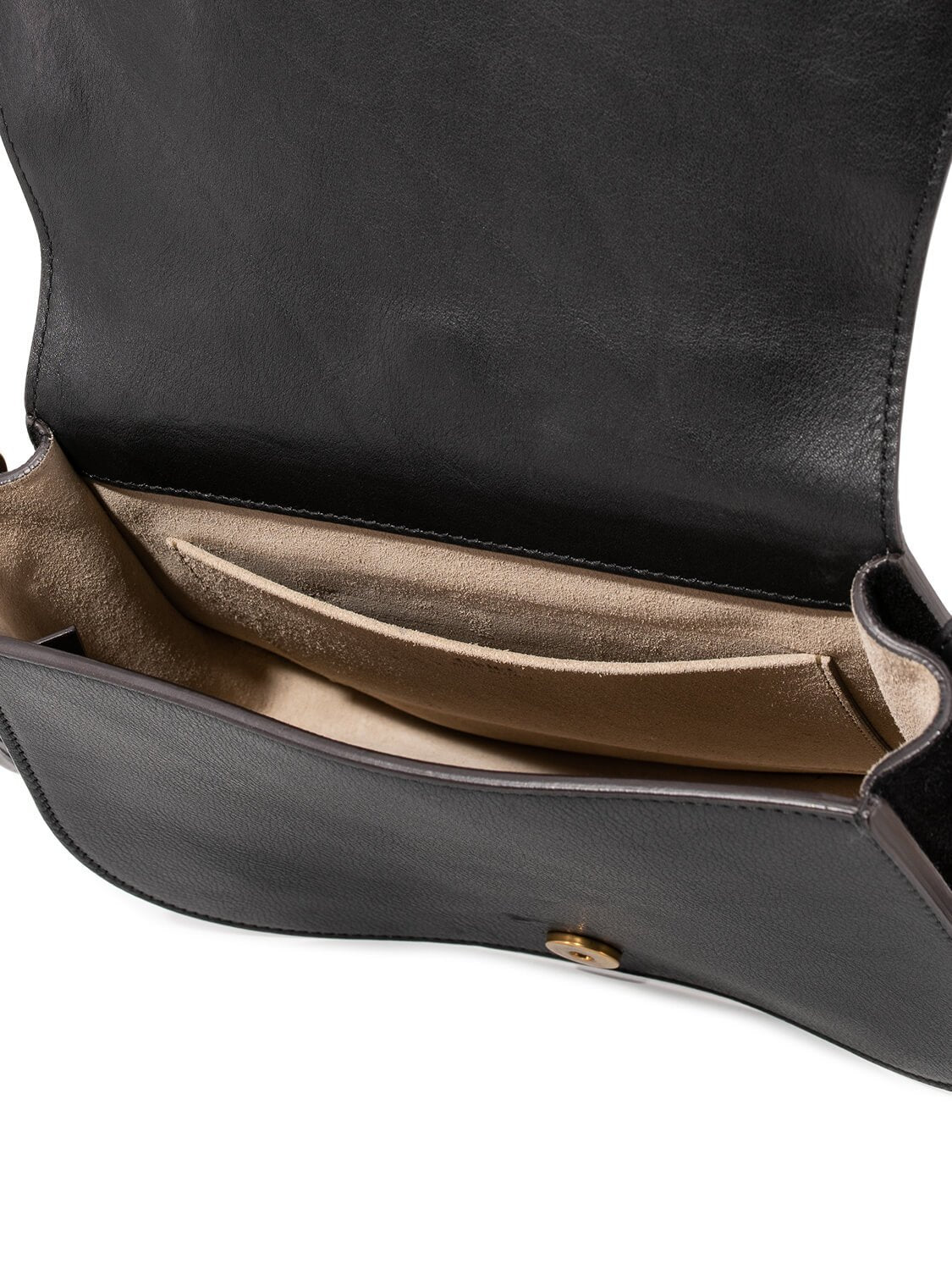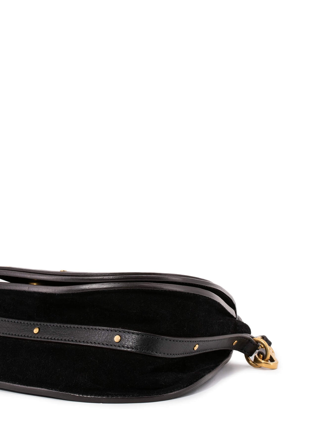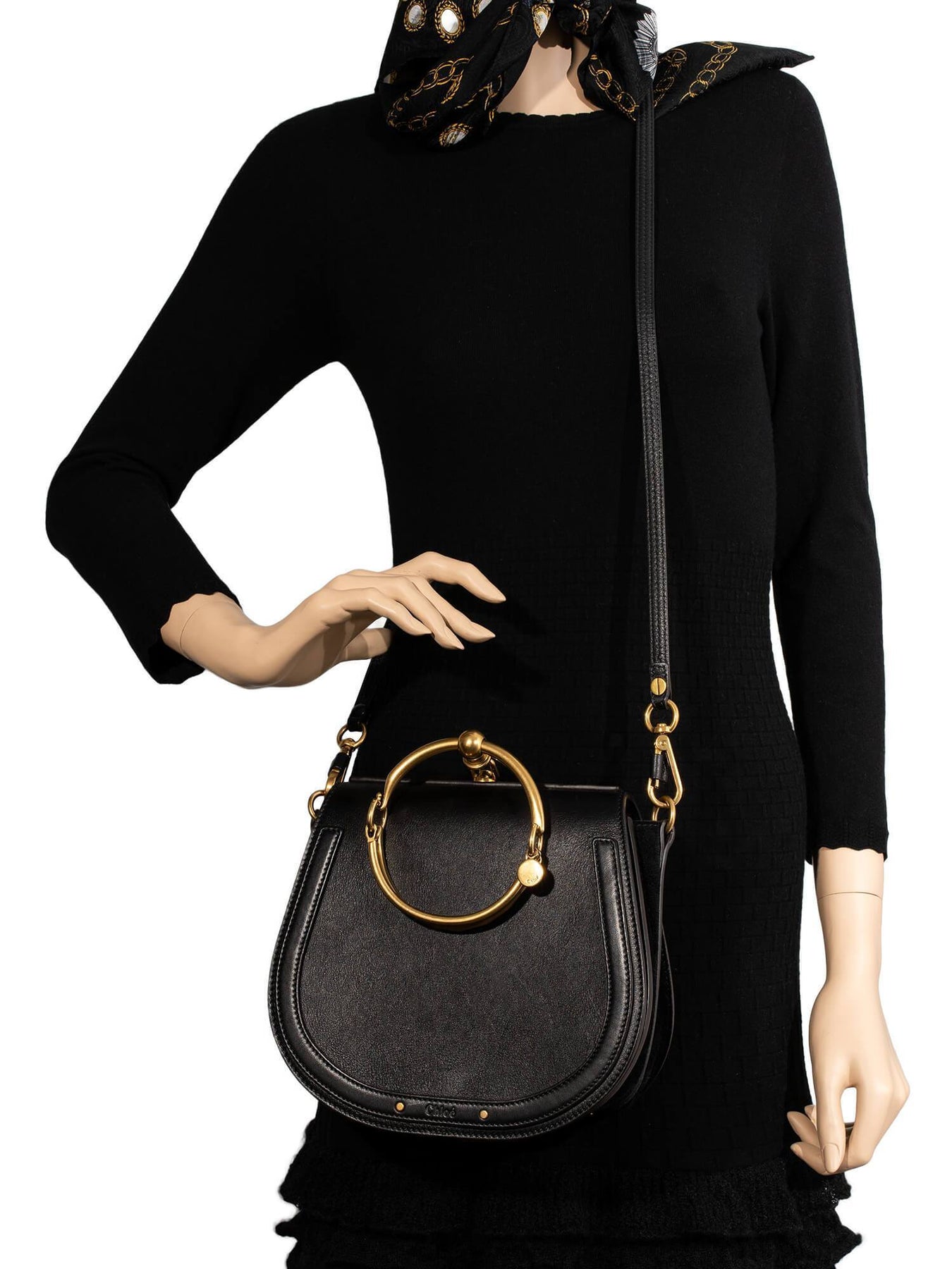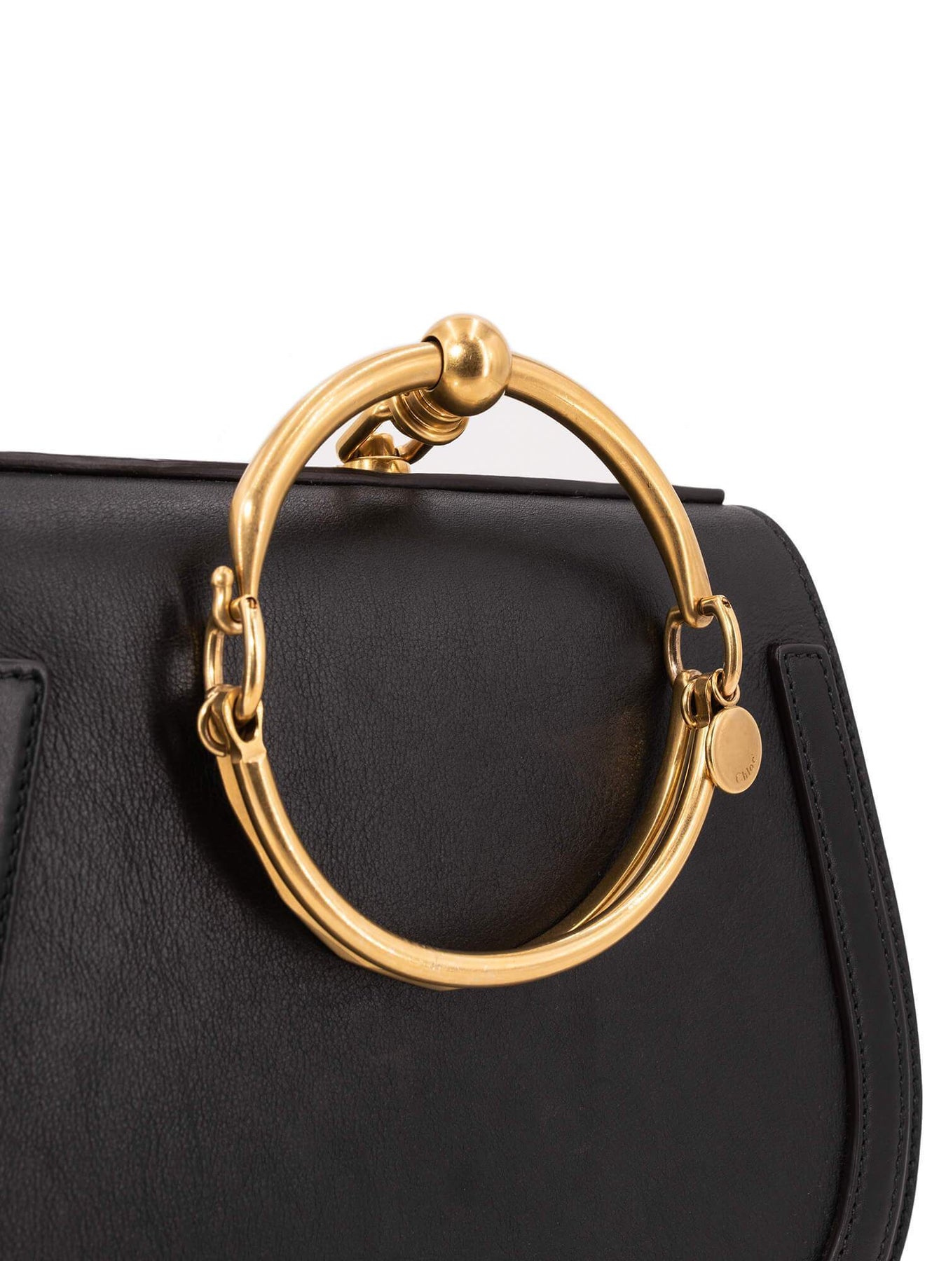 Chloe Nile Bracelet Bag or . This bag is in black calfskin leather with gold tone hardware. It features a rear flat pocket, gold ring top handle, and removable and adjustable shoulder strap. The flap bag opens with a magnetic snap to a beige suede interior with a patch pocket. Ideal for any occasion, from Chloe.