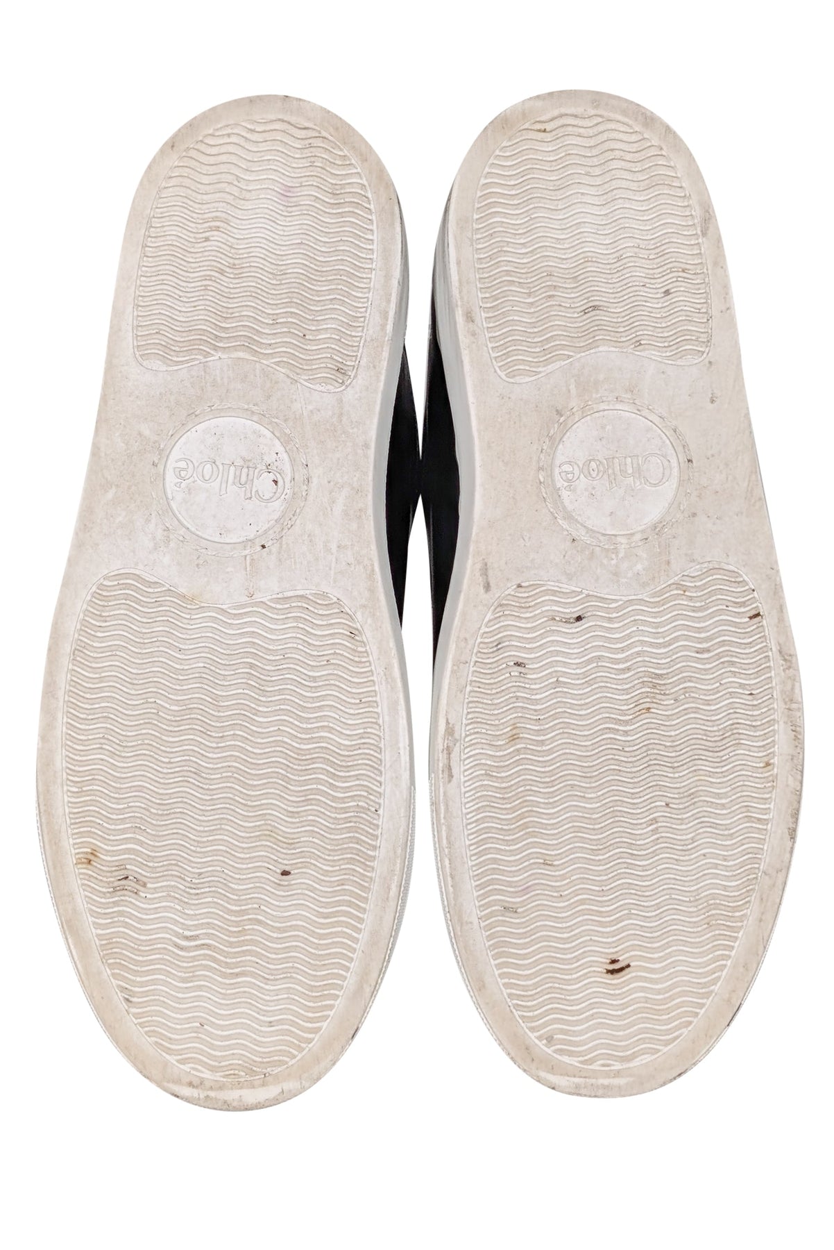 Step up your sneaker game with Chloe's black leather sneakers! These rounded-toe sneakers feature a fun scallop trim and a bold rebel style star, adding a playful touch to your weekend chic look. Perfect for pairing with joggers and a cozy sweater.