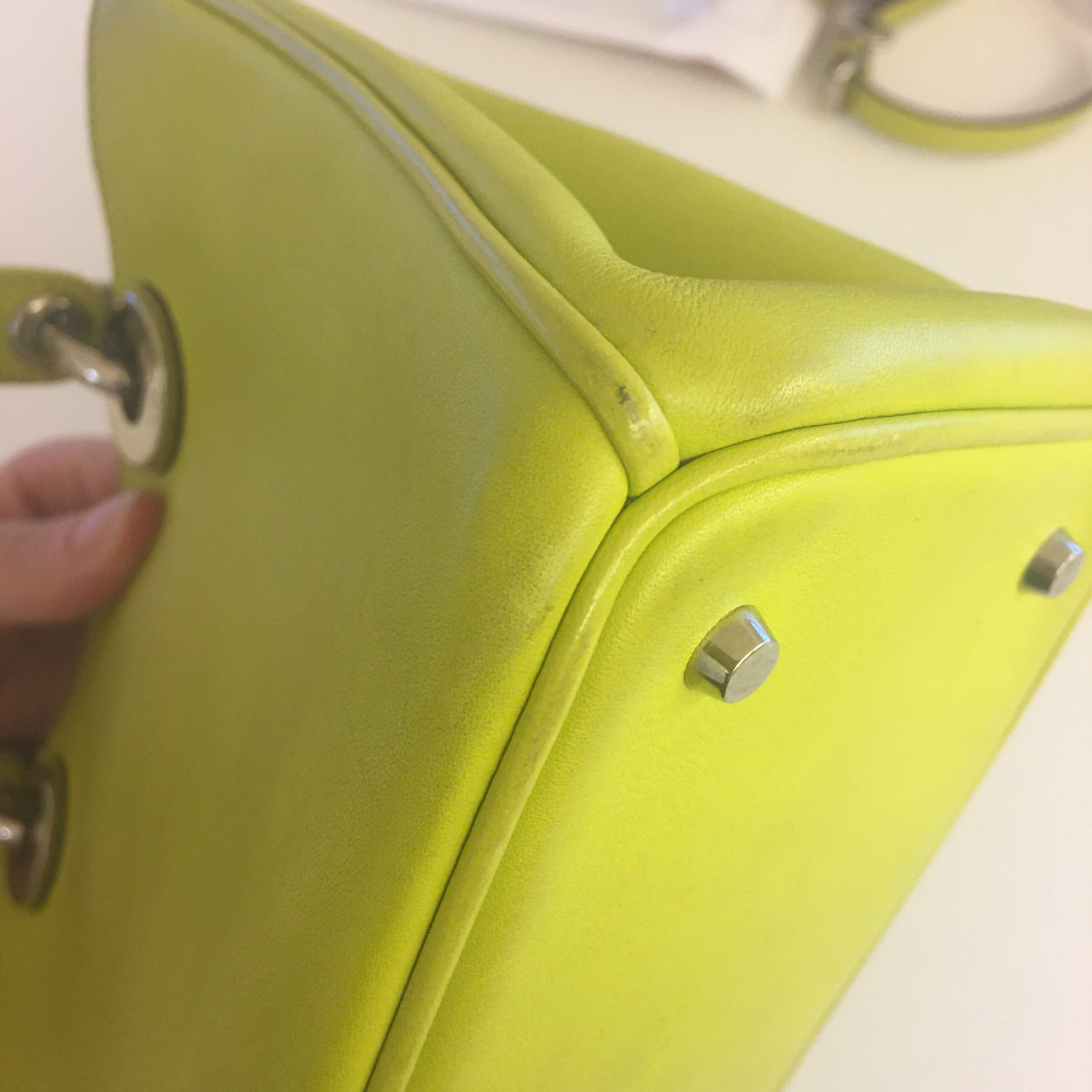 The leather has a vibrant and beautiful color, the bag is overall in New conditions with little signs of use on the corners and some color transfer on the bag and the handles, which has been caused by the close contact with the clothes and can be cleaned.