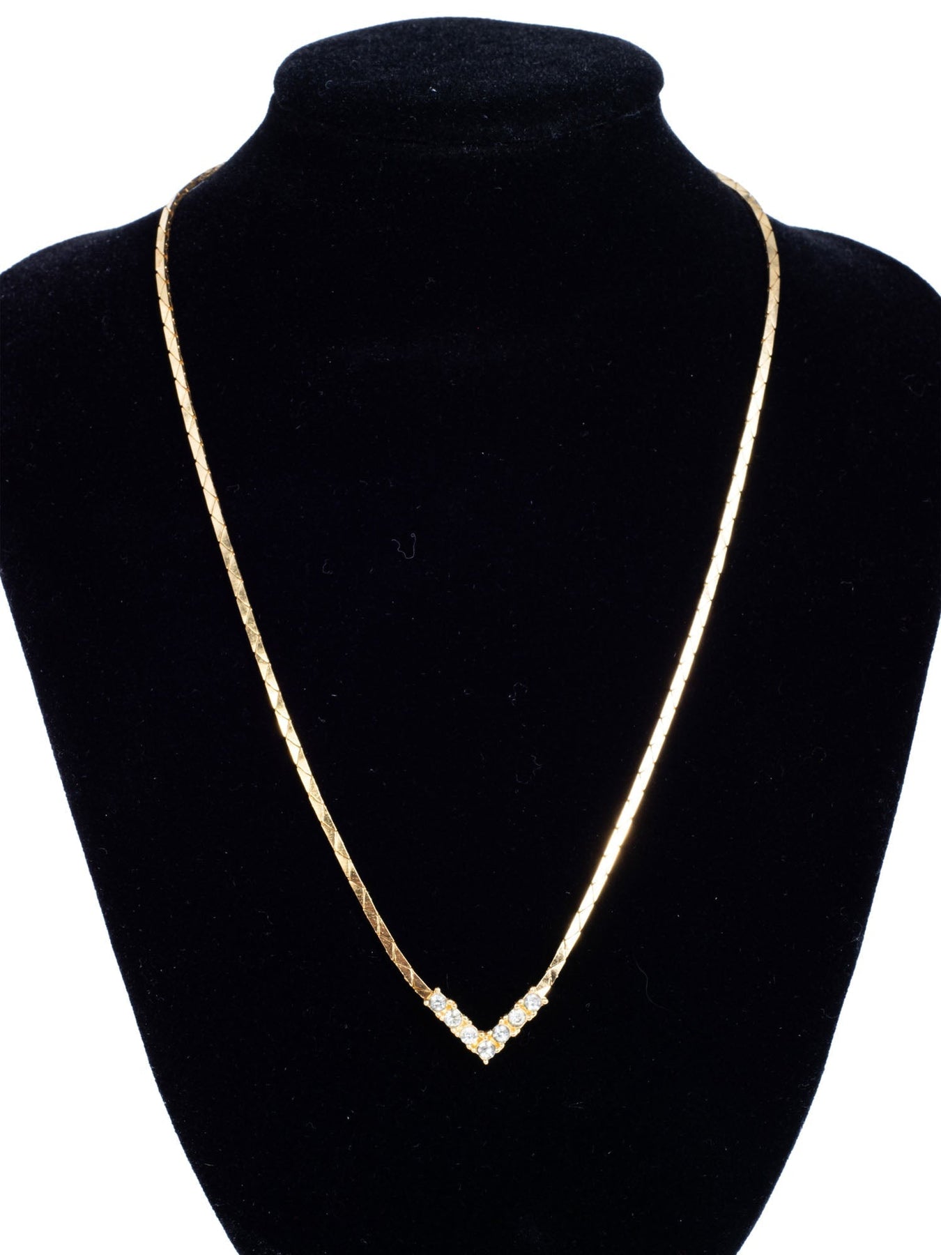 Christian Dior Chevron Necklace or . This necklace is in 24K gold plated metal featuring the "CD" logo, crystal chevron pendant, and a clasp closure.