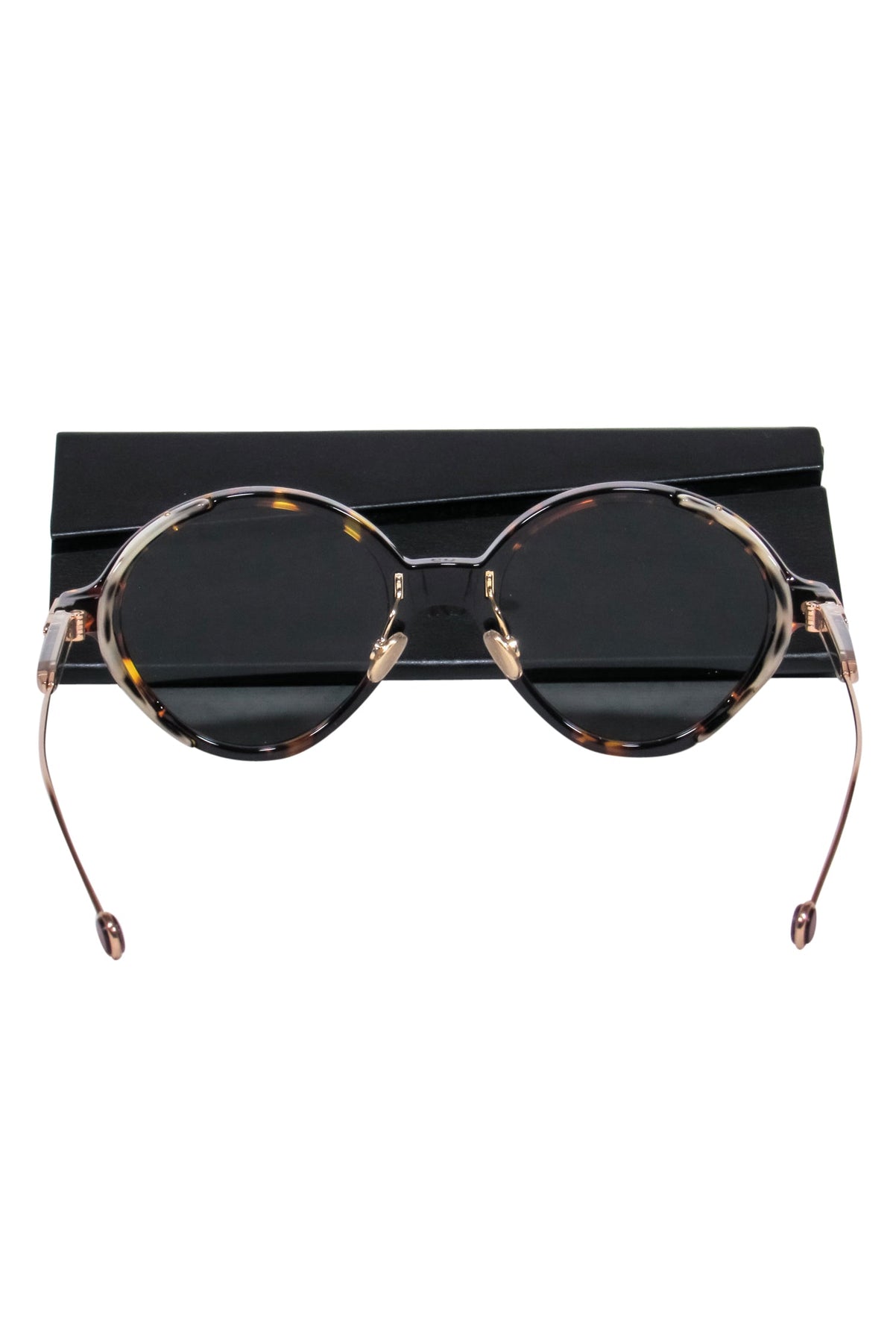 Show your sweet flower child side with these sunglasses by Christian Dior! These fab and fun sunnies feature hot pink mirrored lenses with a floral design, two-tone tortoiseshell frames and sleek gold-toned metal arms. The fun round shape paired with a funky design make these a truly unique piece. Style with your favorite midi sundress and kitten heel or for a fresh look in fall with a cropped jean, on-trend bootie and boho blouse.