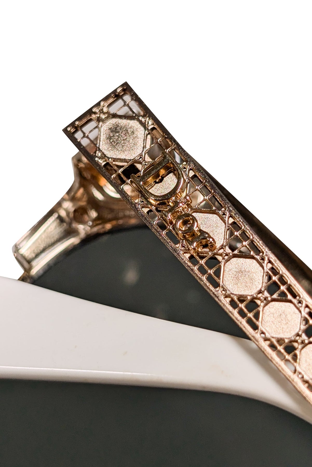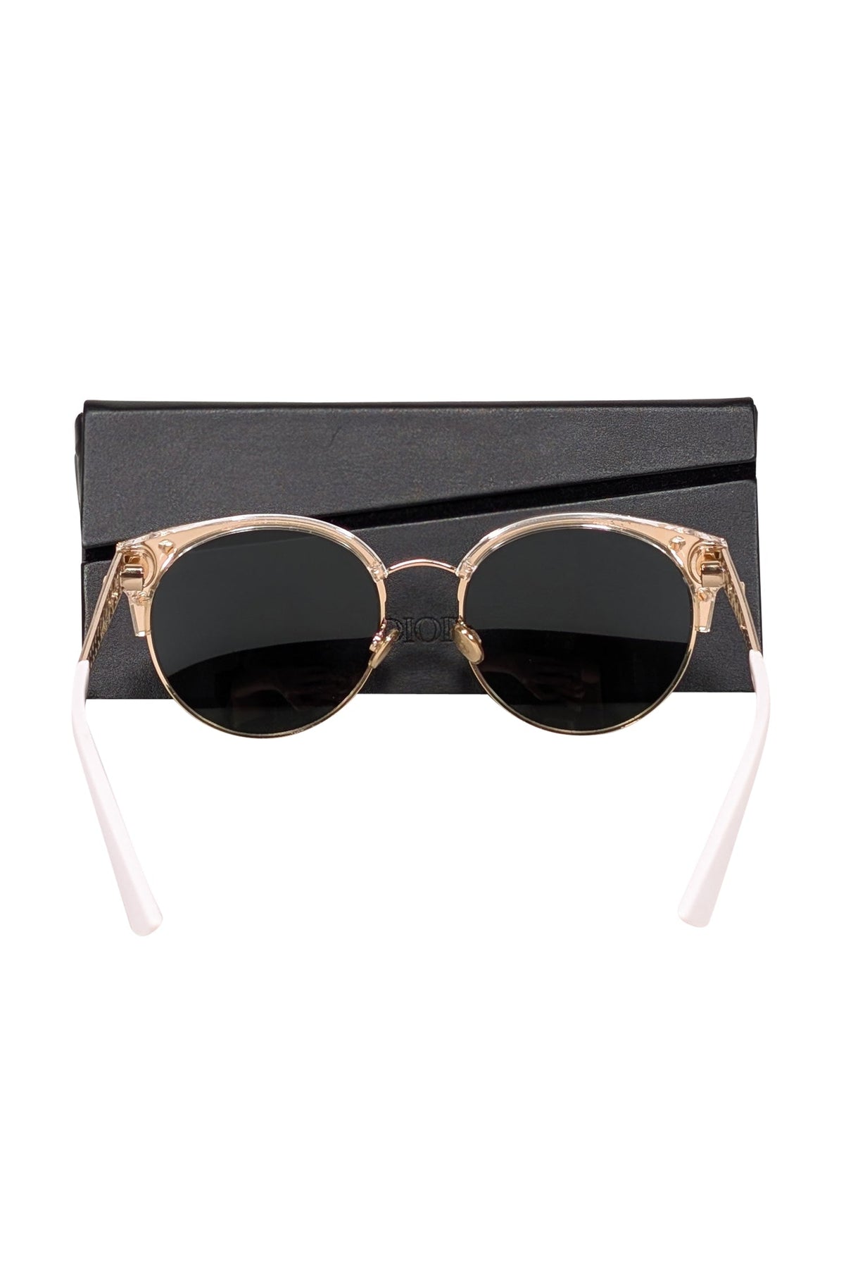 Elevate your summer style with Christian Dior gold & white sunglasses. Featuring a rounded cat eye frame, silver mirrored lenses, and chic white and gold design legs, these shades add a touch of glam to any outfit. Made in Italy, pair with a floral dress for a Sunday brunch.