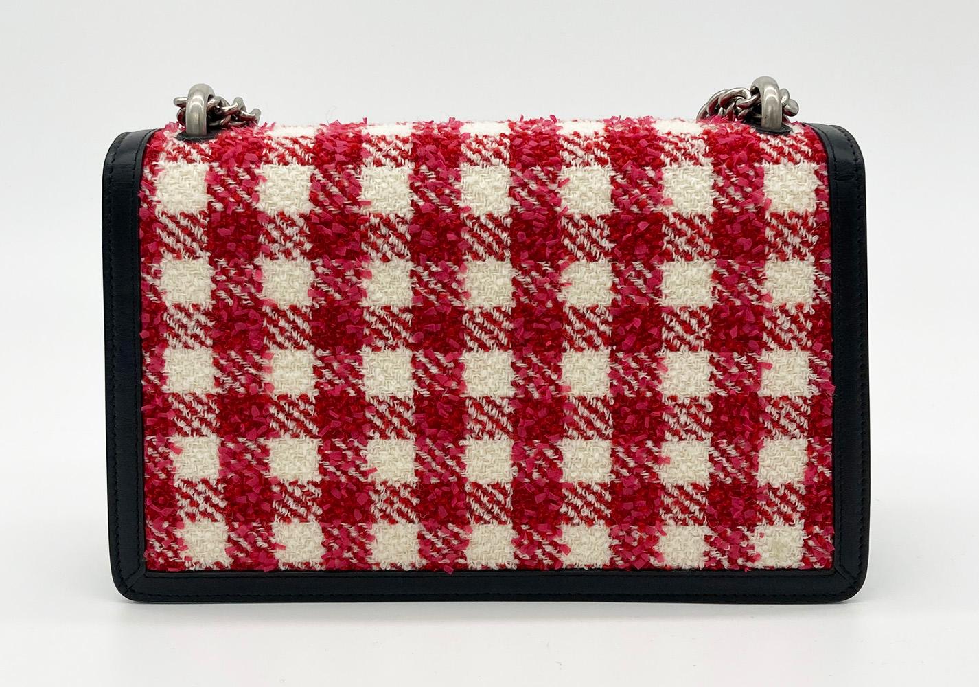 red and white plaid wool exterior trimmed with black leather and ruthenium hardware.