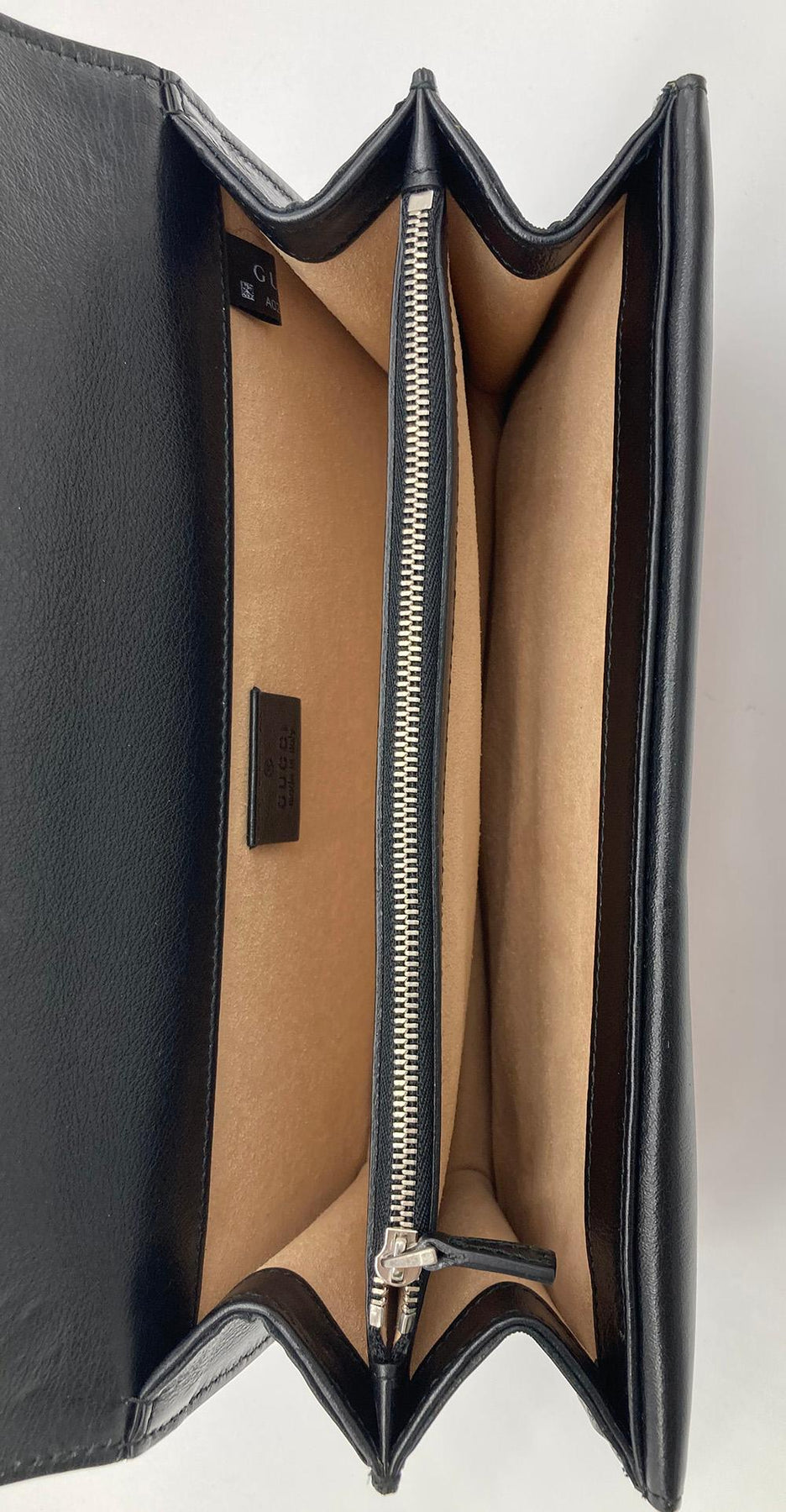 Signature dionysus style front snap double flap opens to a nude suede interior with 2 compartments.