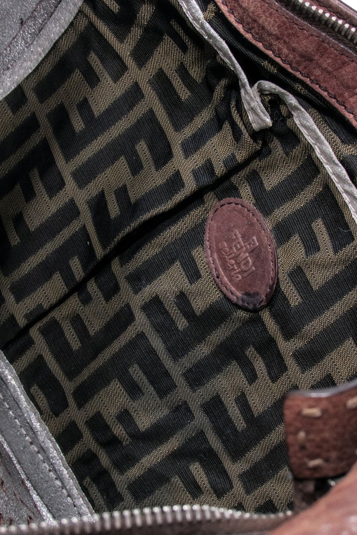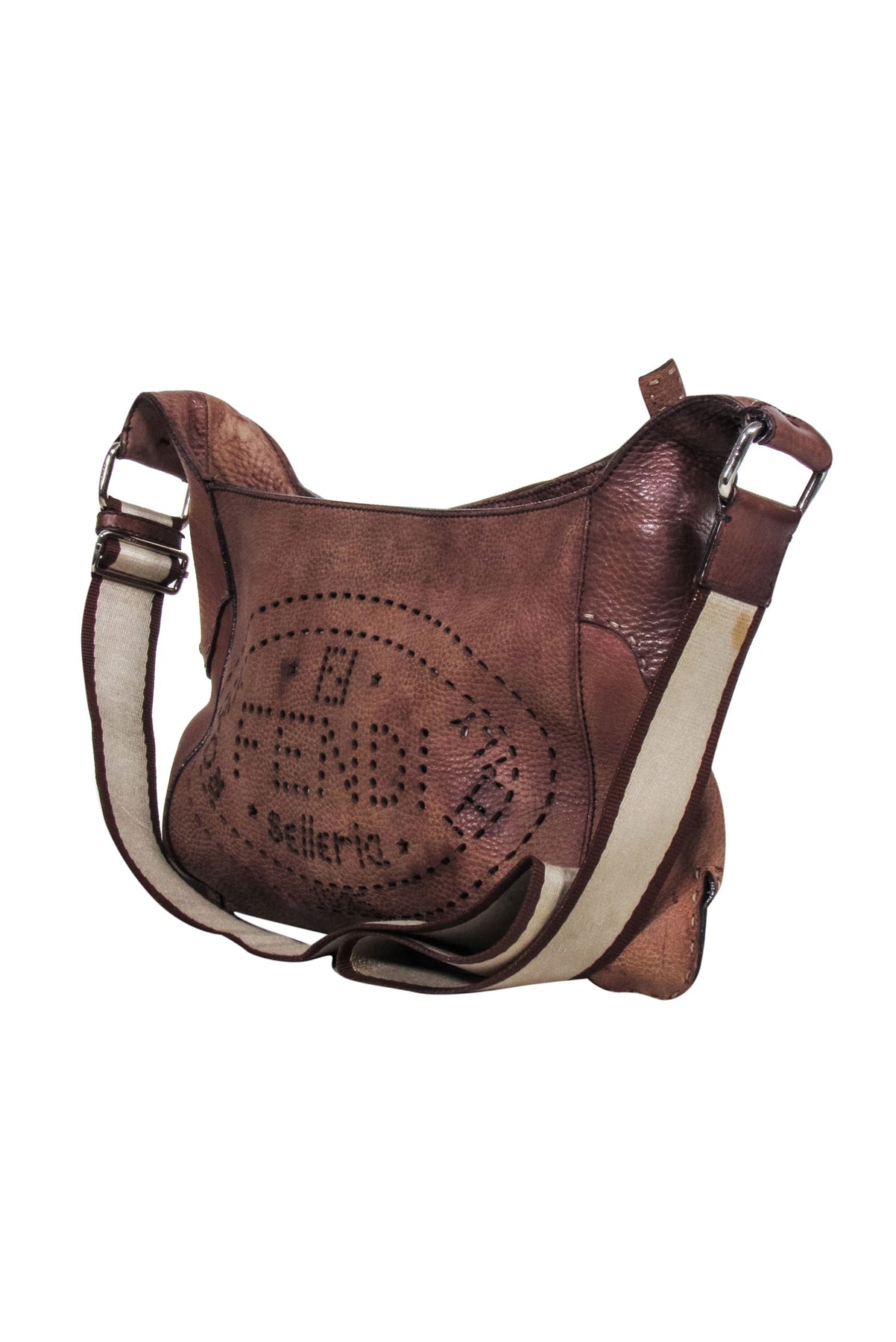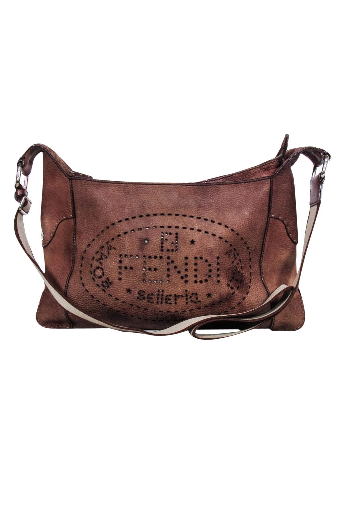Saddle up in style with Fendi's brown leather crossbody bag. The laser cut logo detailing adds a touch of luxury while the adjustable woven strap adds a rodeo-ready feel. Perfectly pairs with a midi denim skirt and boot heels.