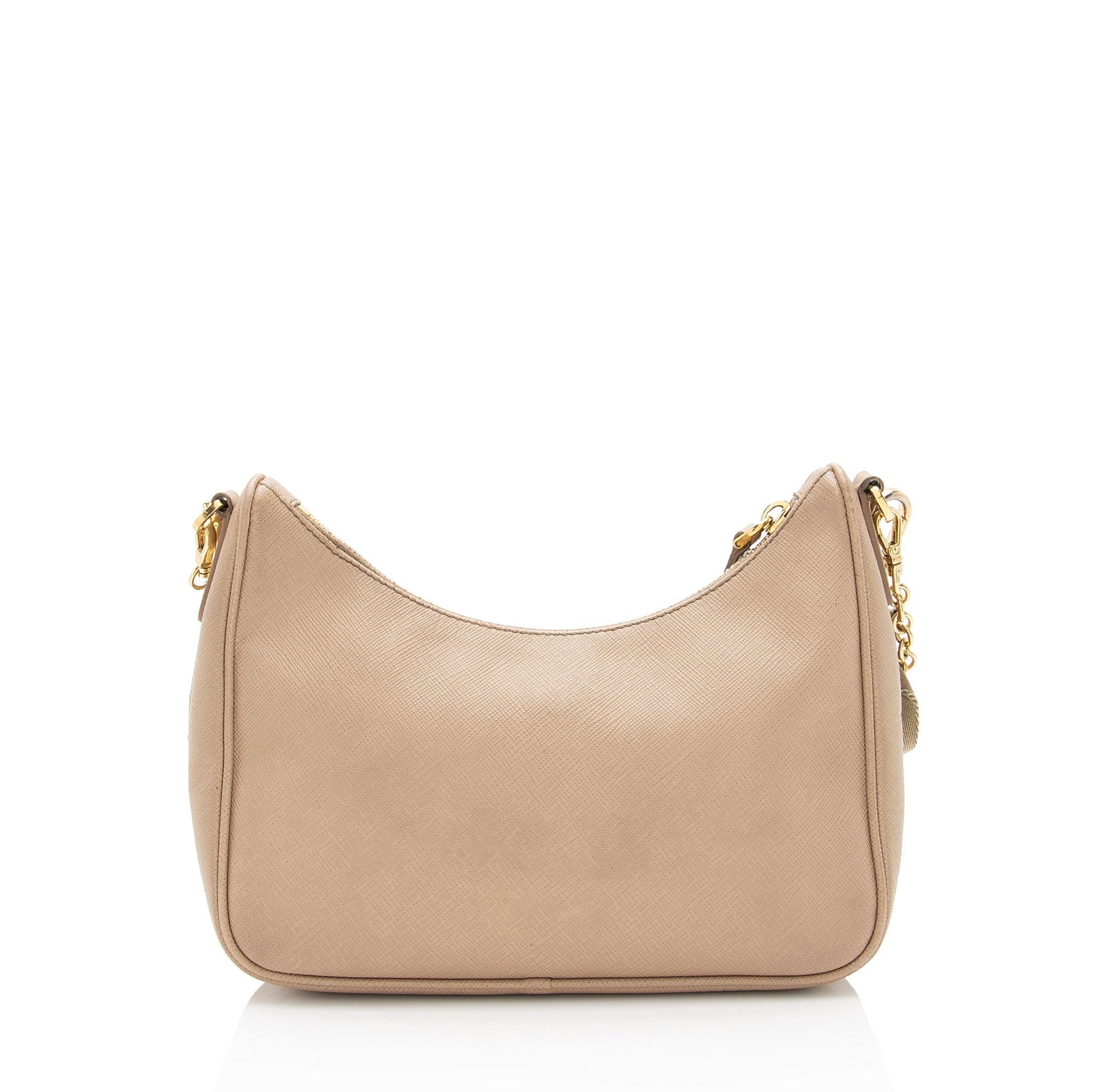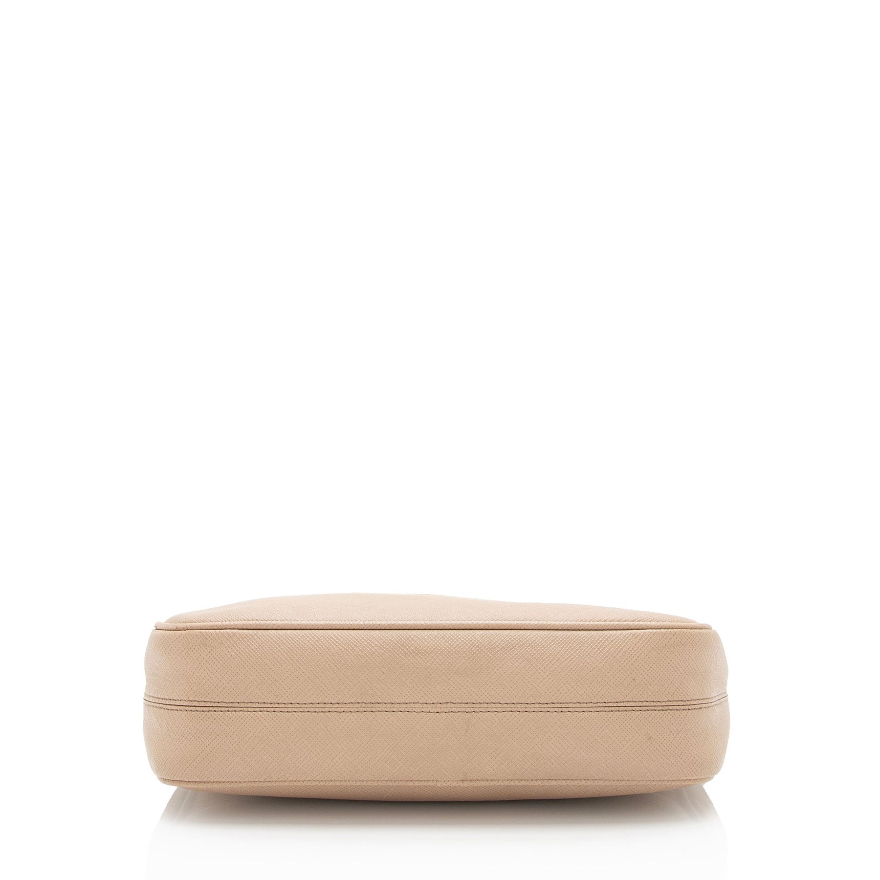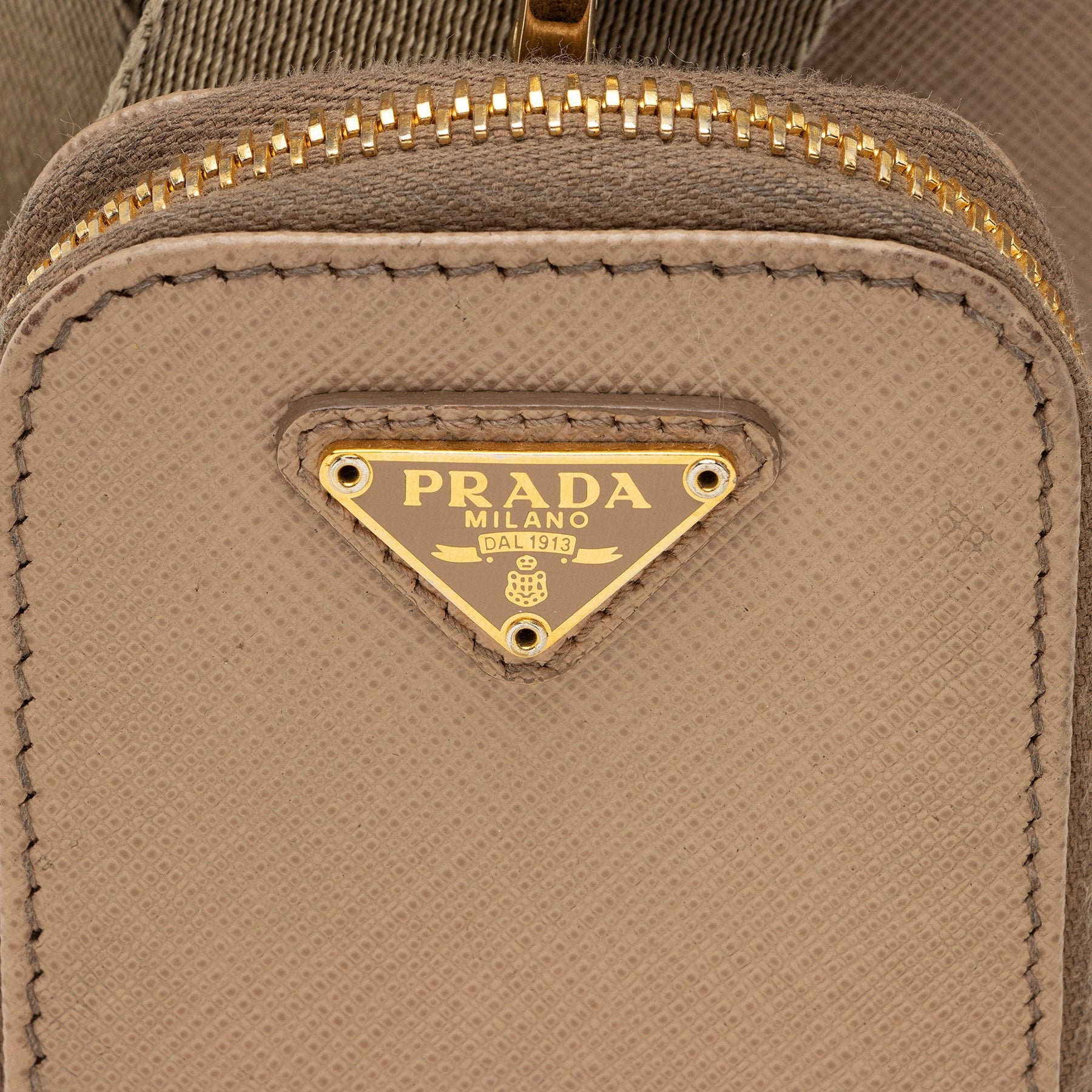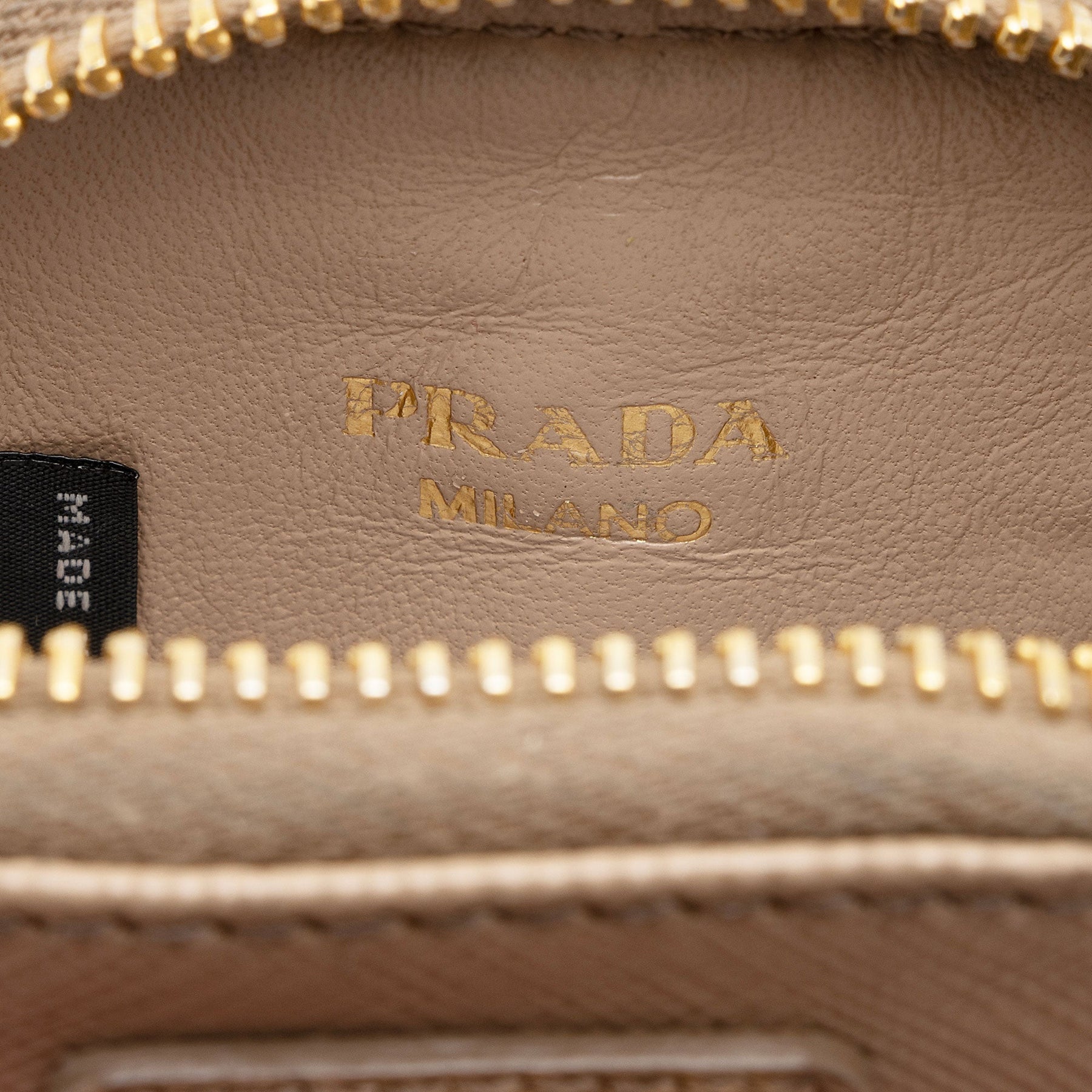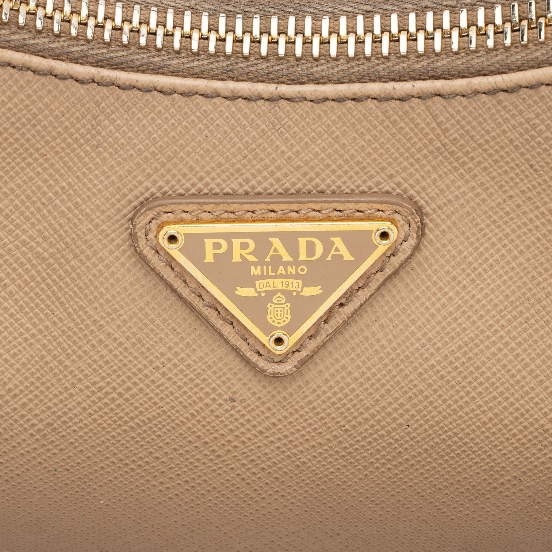 Condition Notes: Moderate darkening and marks throughout exterior, shoulder strap, and leather details. Cracking and wear to shoulder strap base casing. Scuffs and wear throughout zipper pull. Surface scratches and light tarnishing to hardware. Light marks throughout interior.