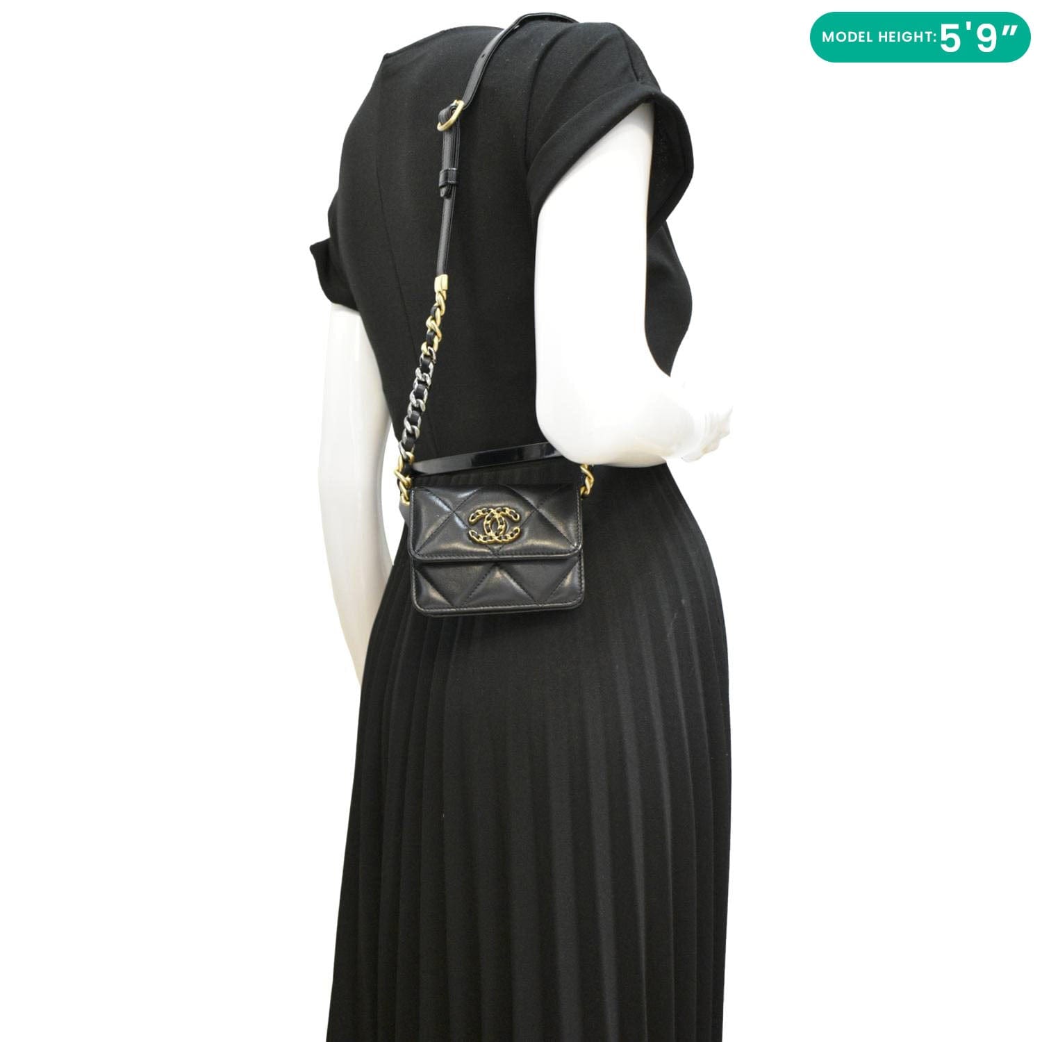Indulge in luxury with the Chanel 19 Flap Coin Purse in black quilted leather, featuring a chic chain shoulder strap. A stylish and practical accessory for any occasion.